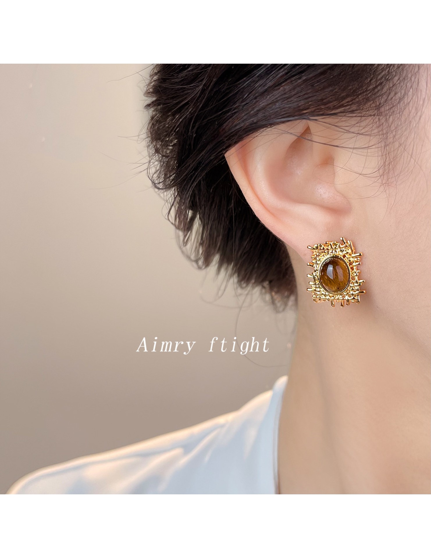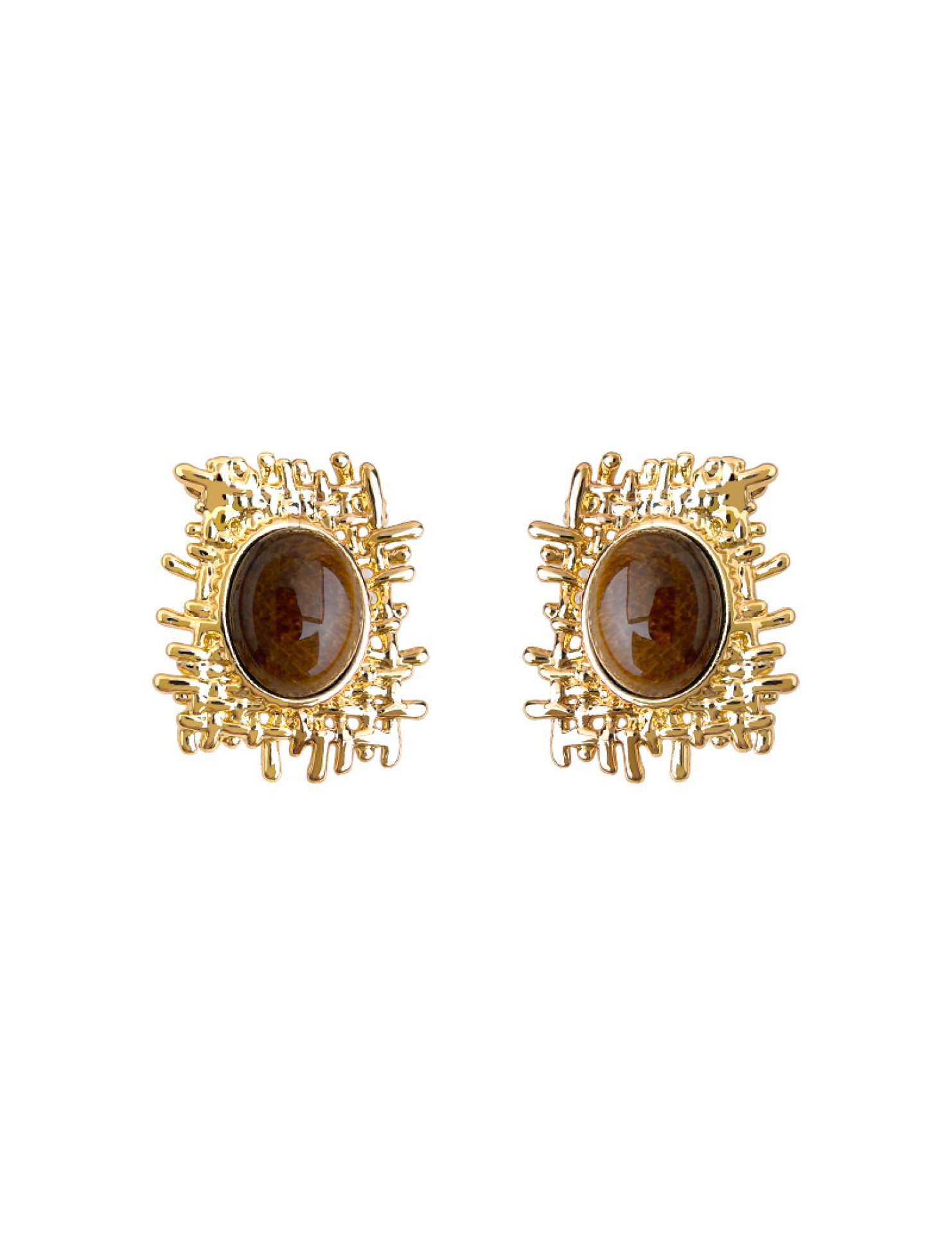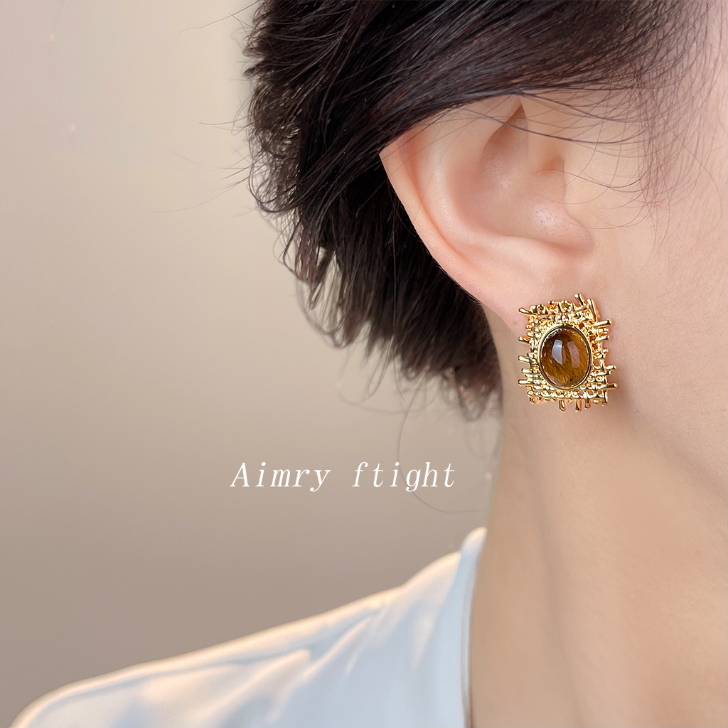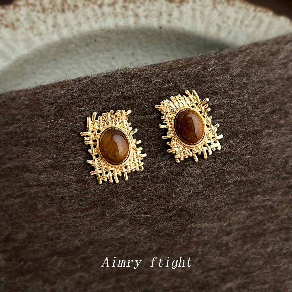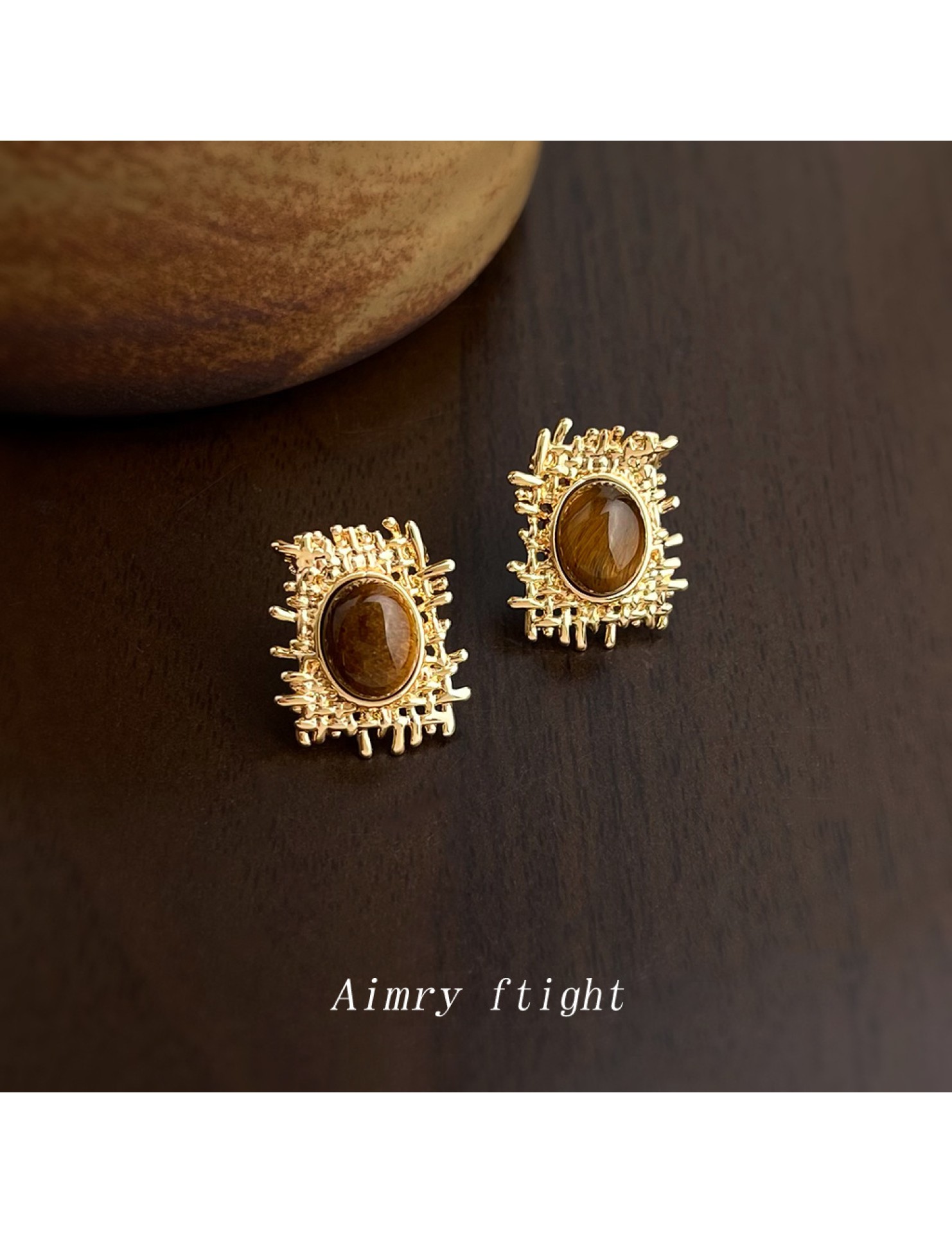 HELN124100326 美拉德風虎眼石天然石設計師款不規則網狀秋冬新款耳環女