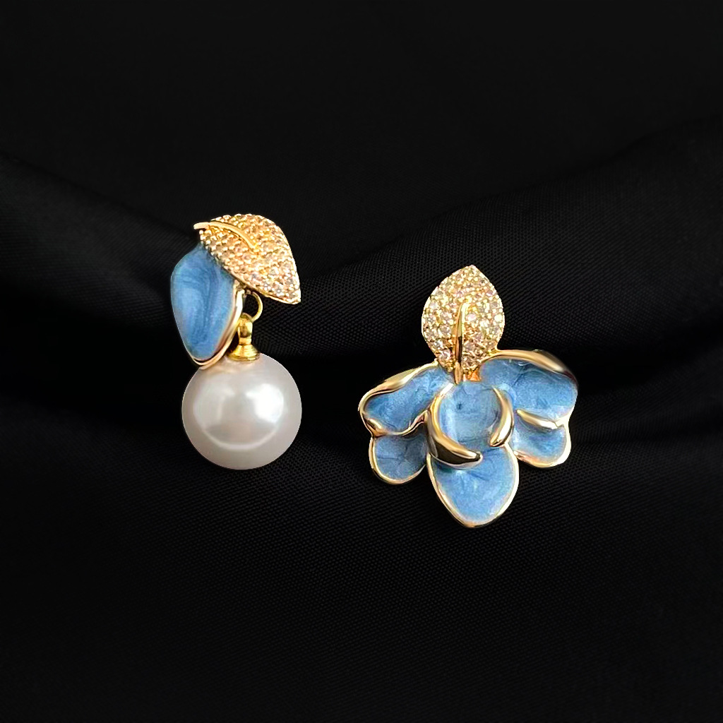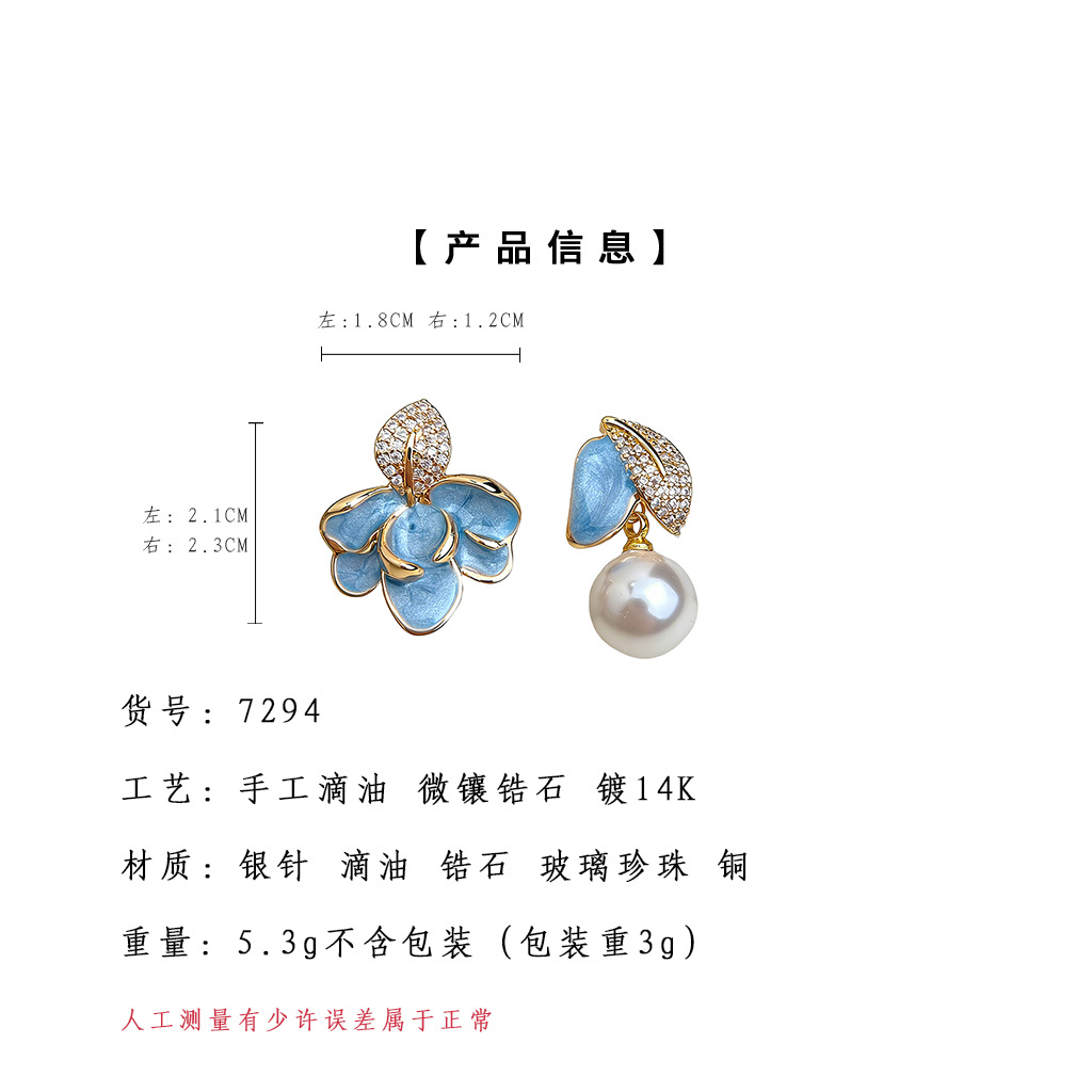 7294銀針不對稱樹葉滴釉藍色耳環