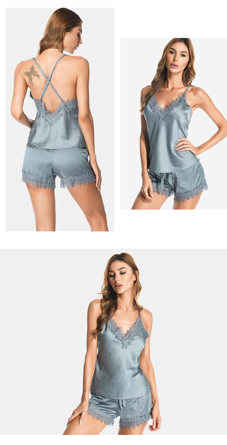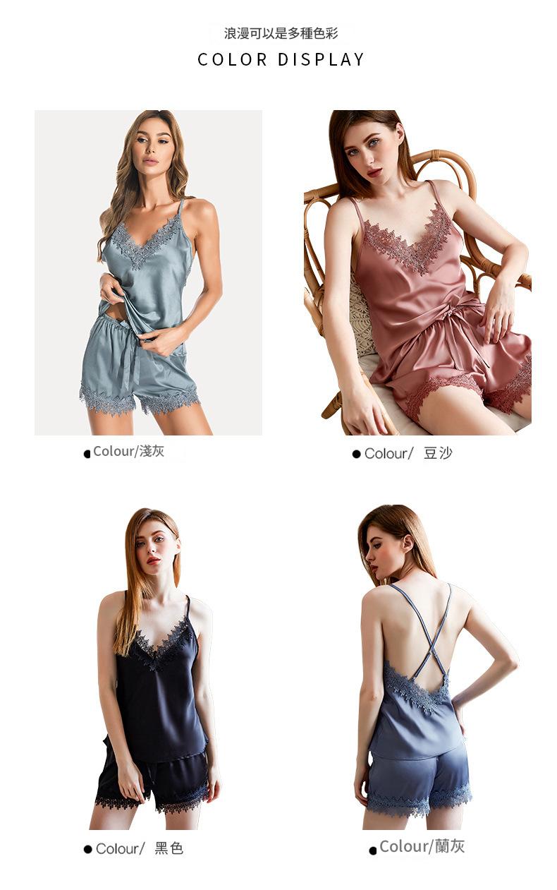 LCBN251225100026 新款女士蕾絲拼接冰絲吊帶睡衣短褲套裝春夏露背深V性感情趣內衣
