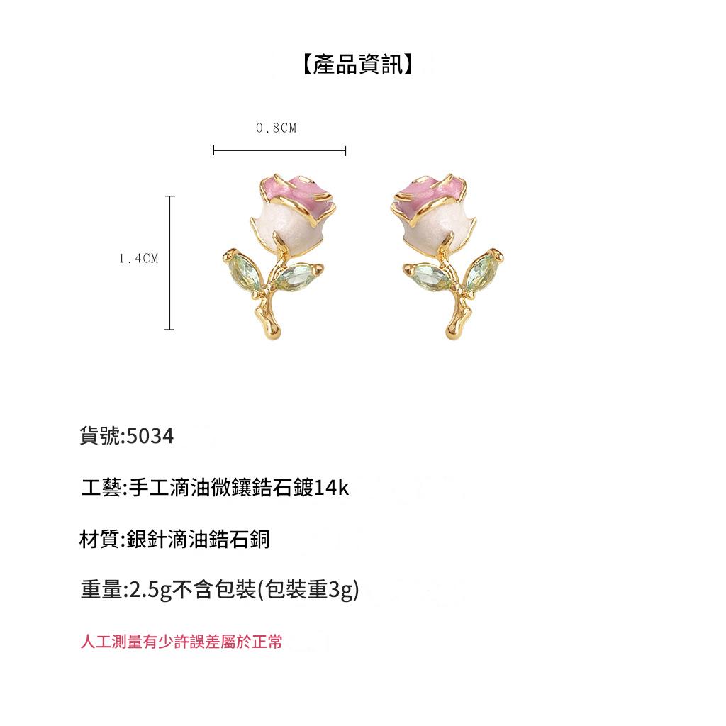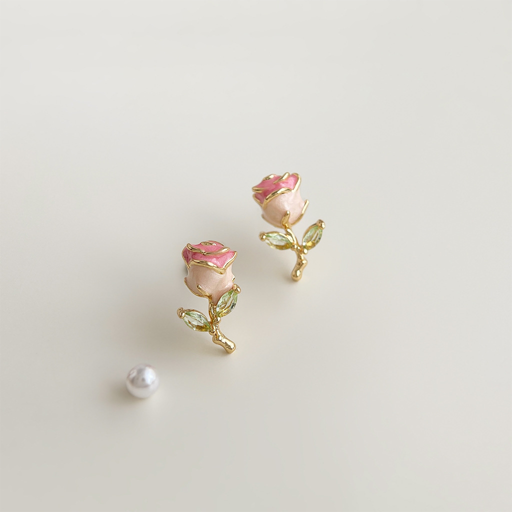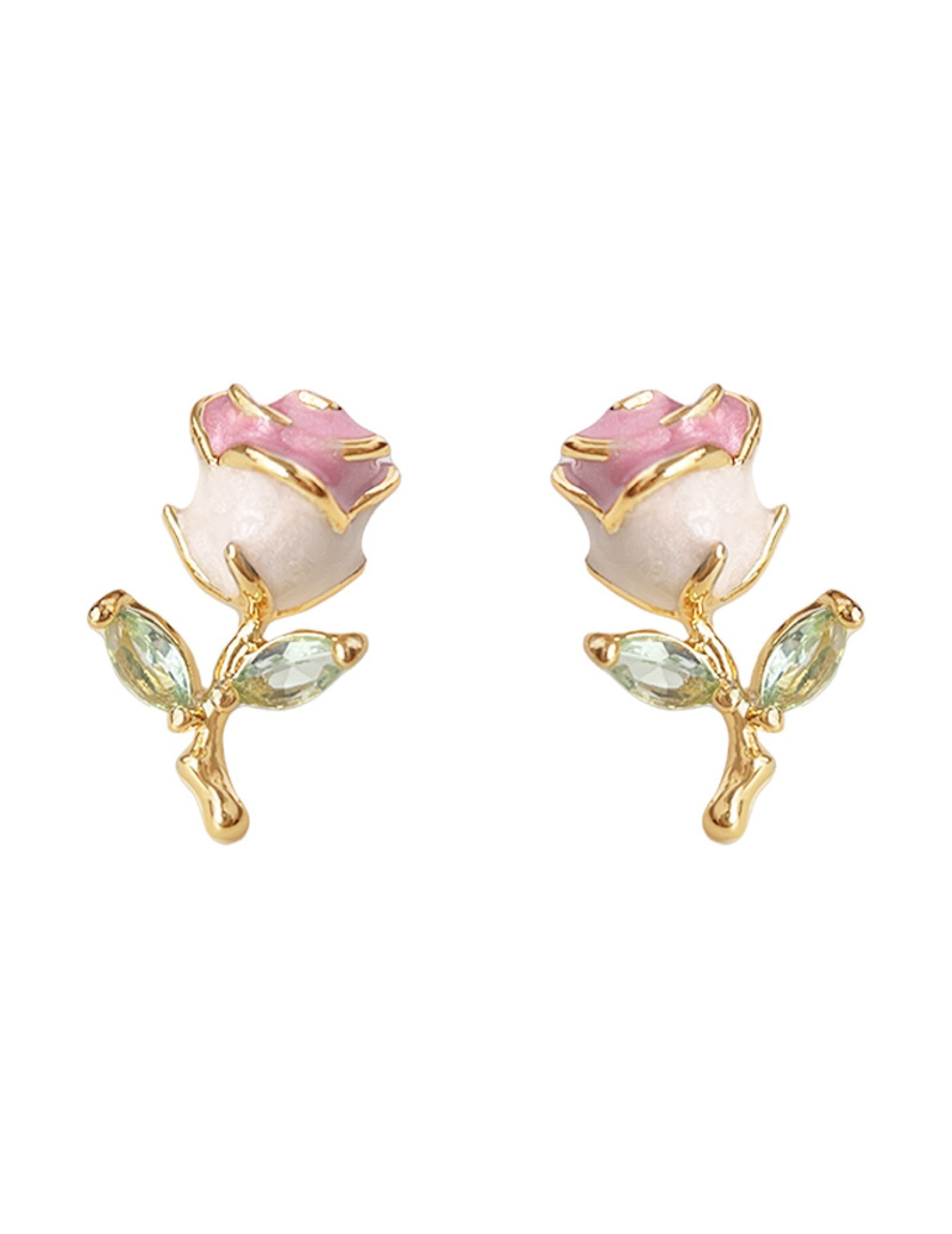HELN124100015 ~小清新925銀針琺瑯滴釉質感微鑲鋯石小巧玫瑰花耳釘