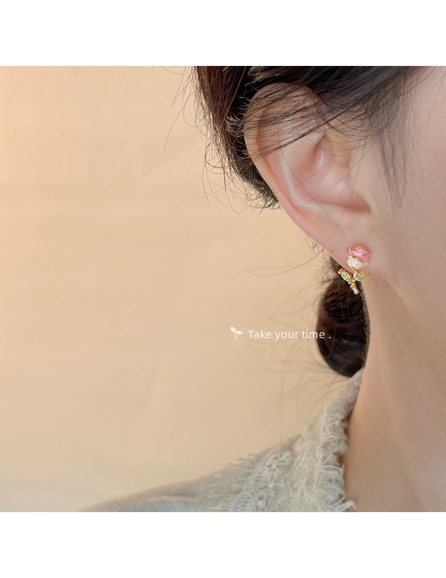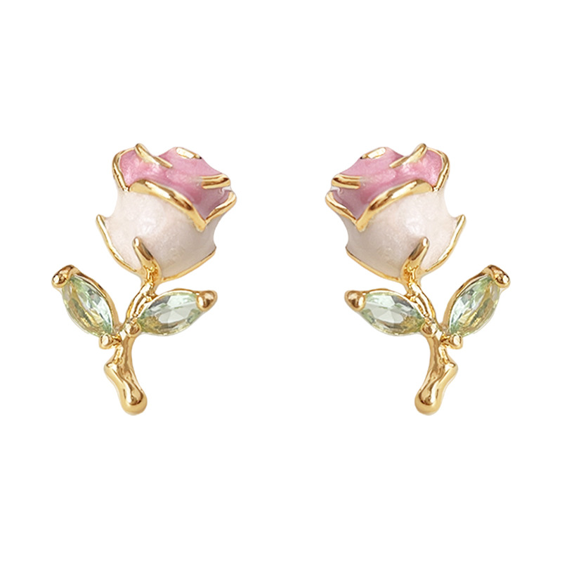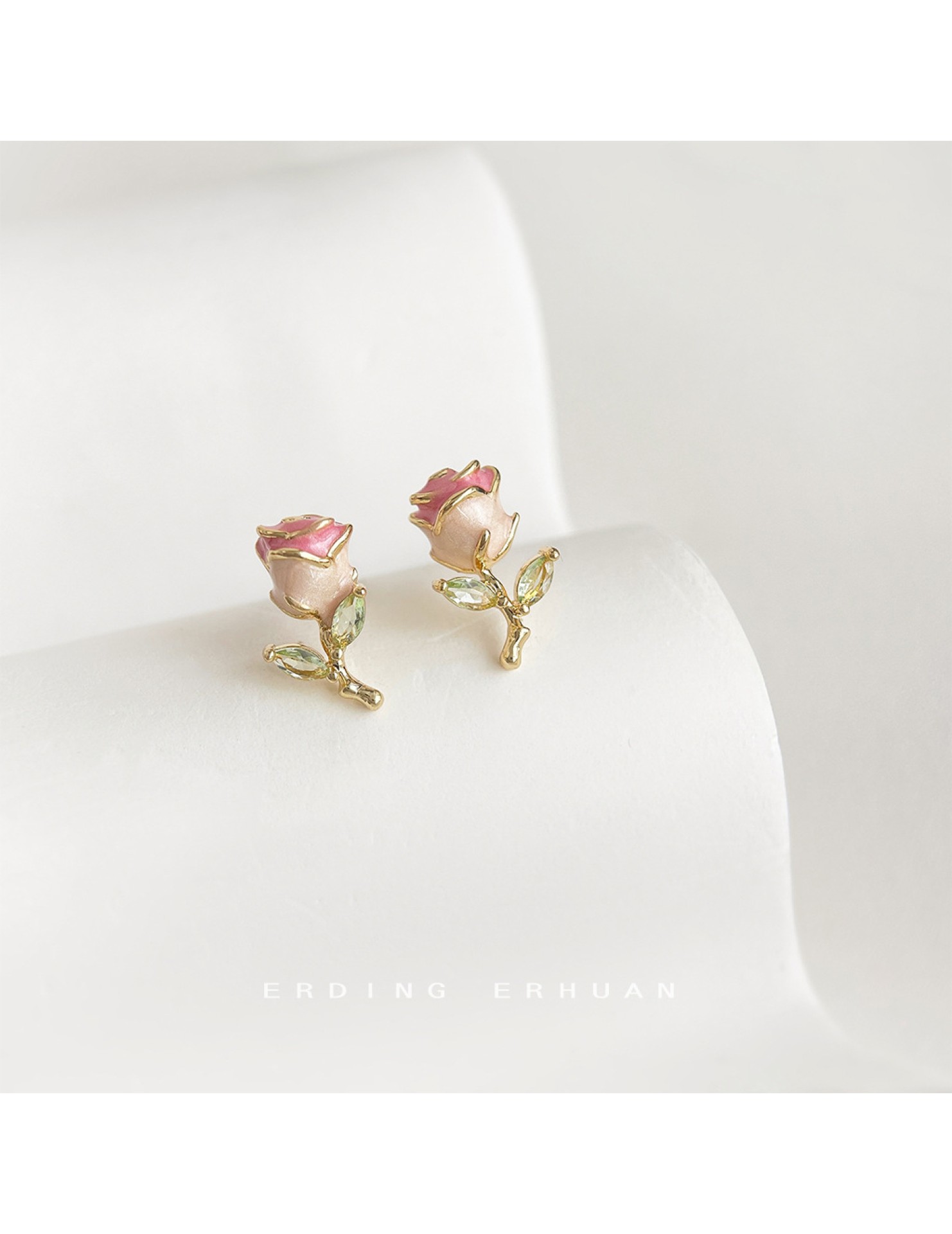 HELN124100015 ~小清新925銀針琺瑯滴釉質感微鑲鋯石小巧玫瑰花耳釘