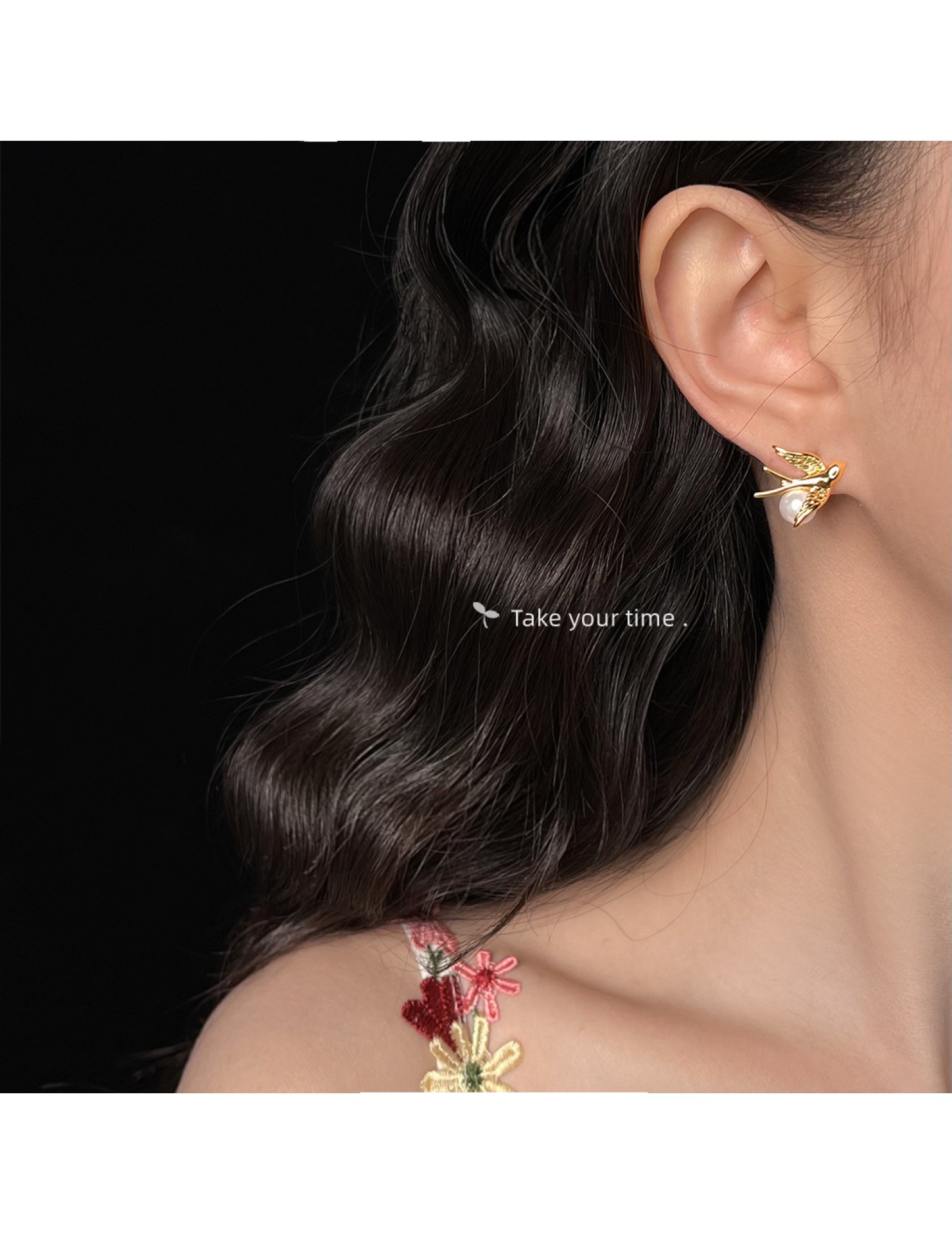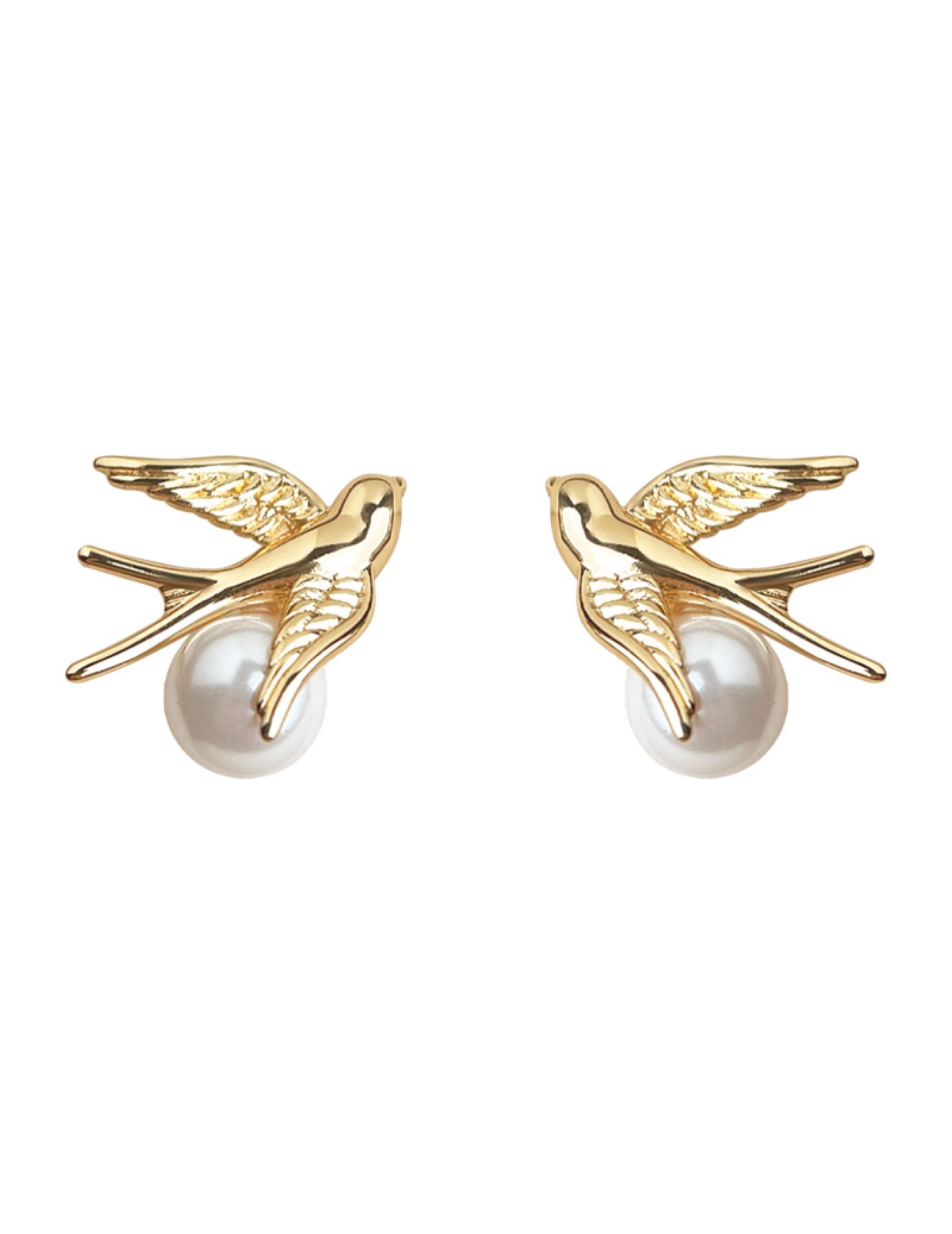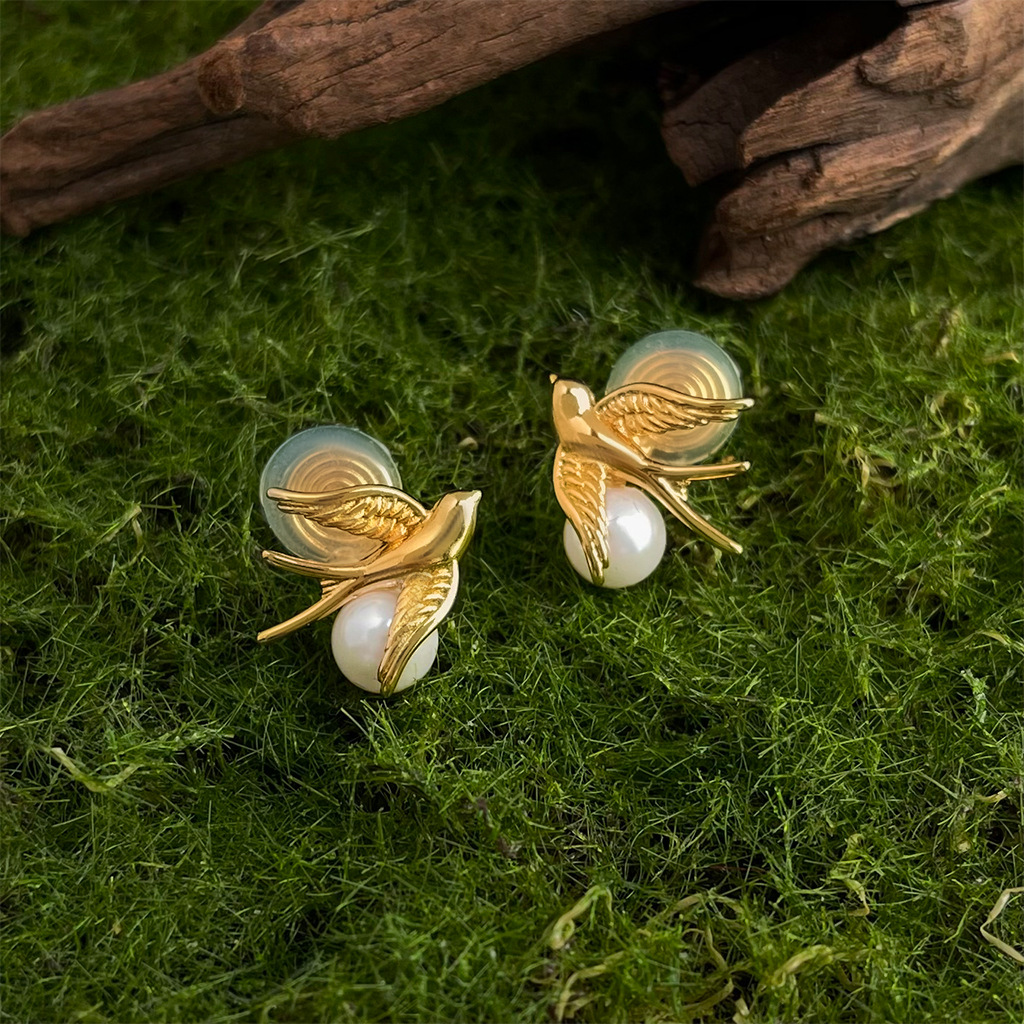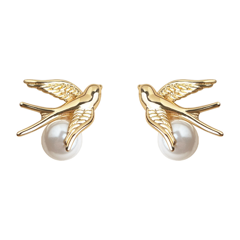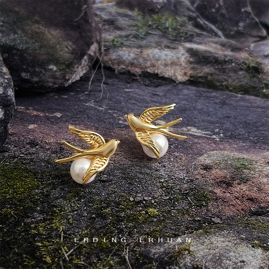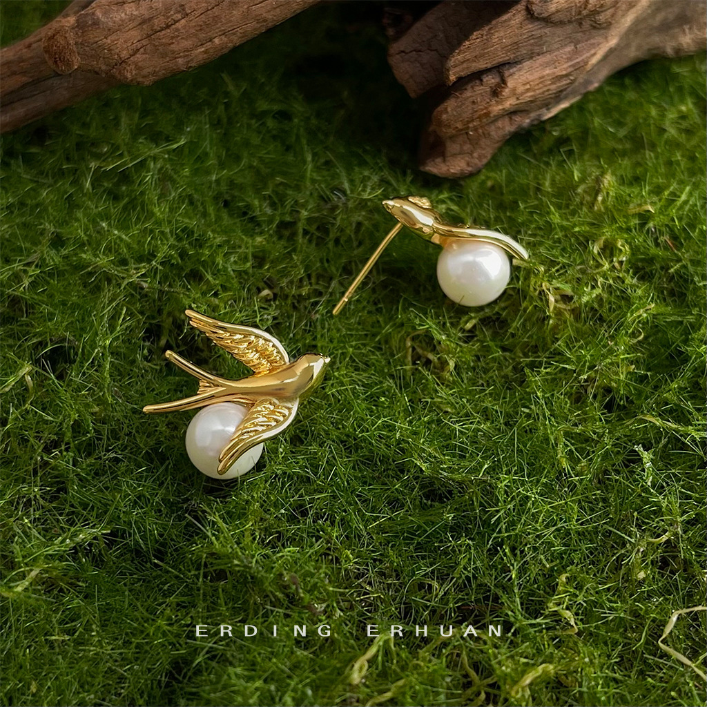 HELN124100020 【飛鳥集】設計925銀針鍍14K玻璃爆款珍珠飛鳥耳飾高級感耳釘