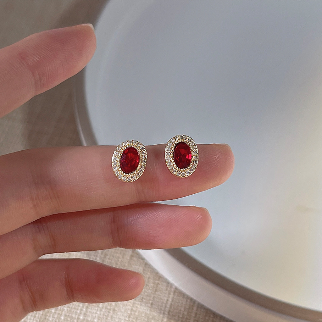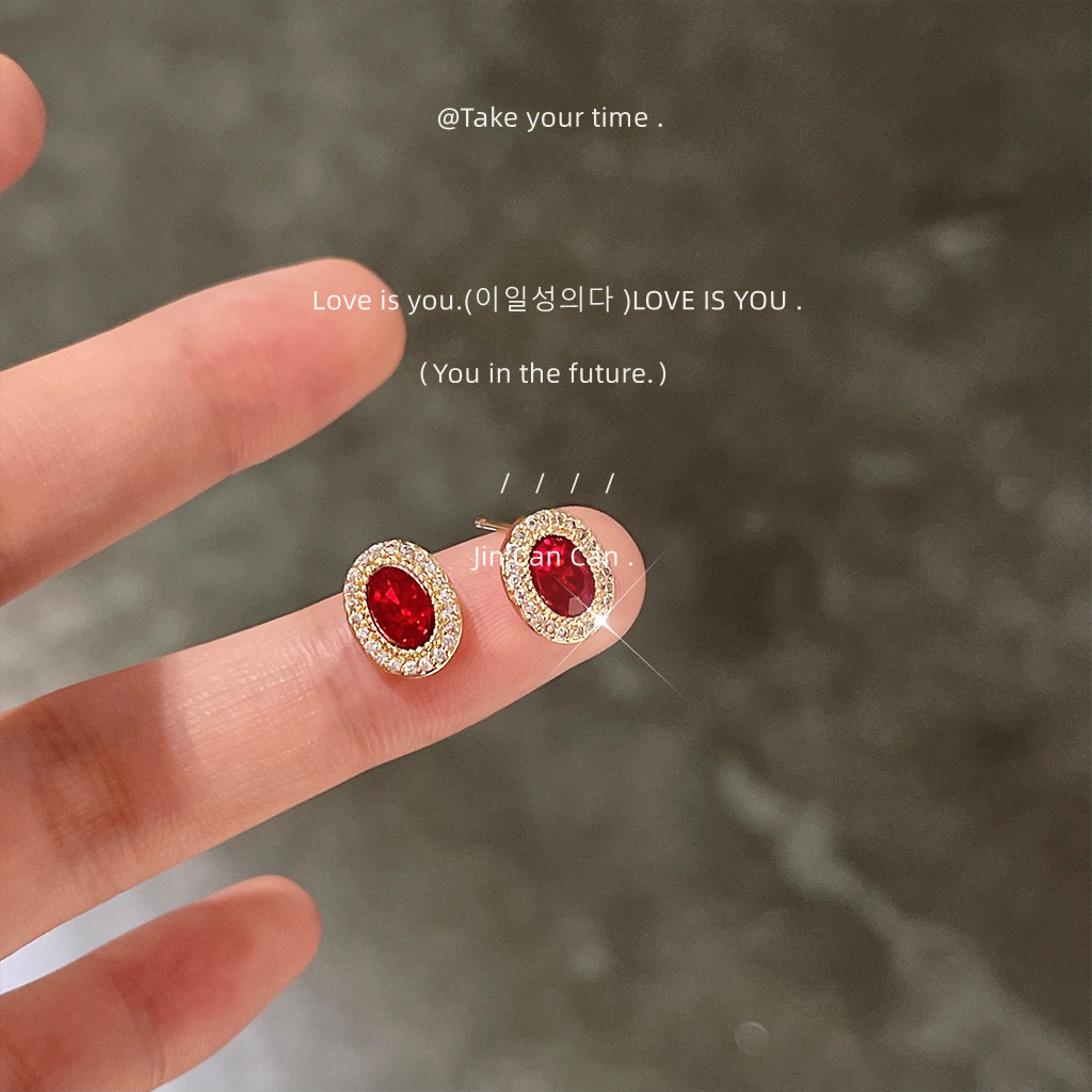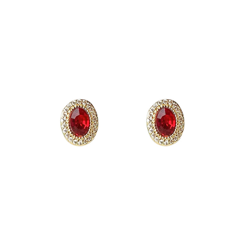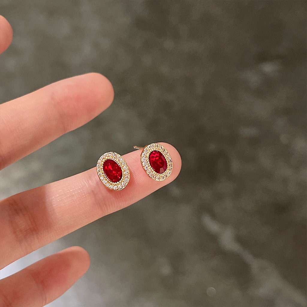 HELN124100022 微鑲鋯石~鵝蛋紅色爆閃925銀針鍍14K橢圓耳釘 小巧輕奢耳飾 耳環