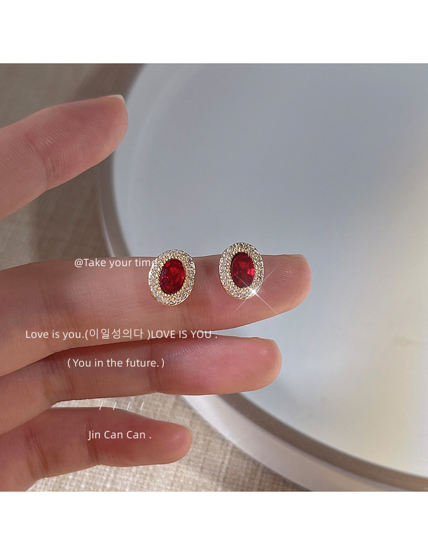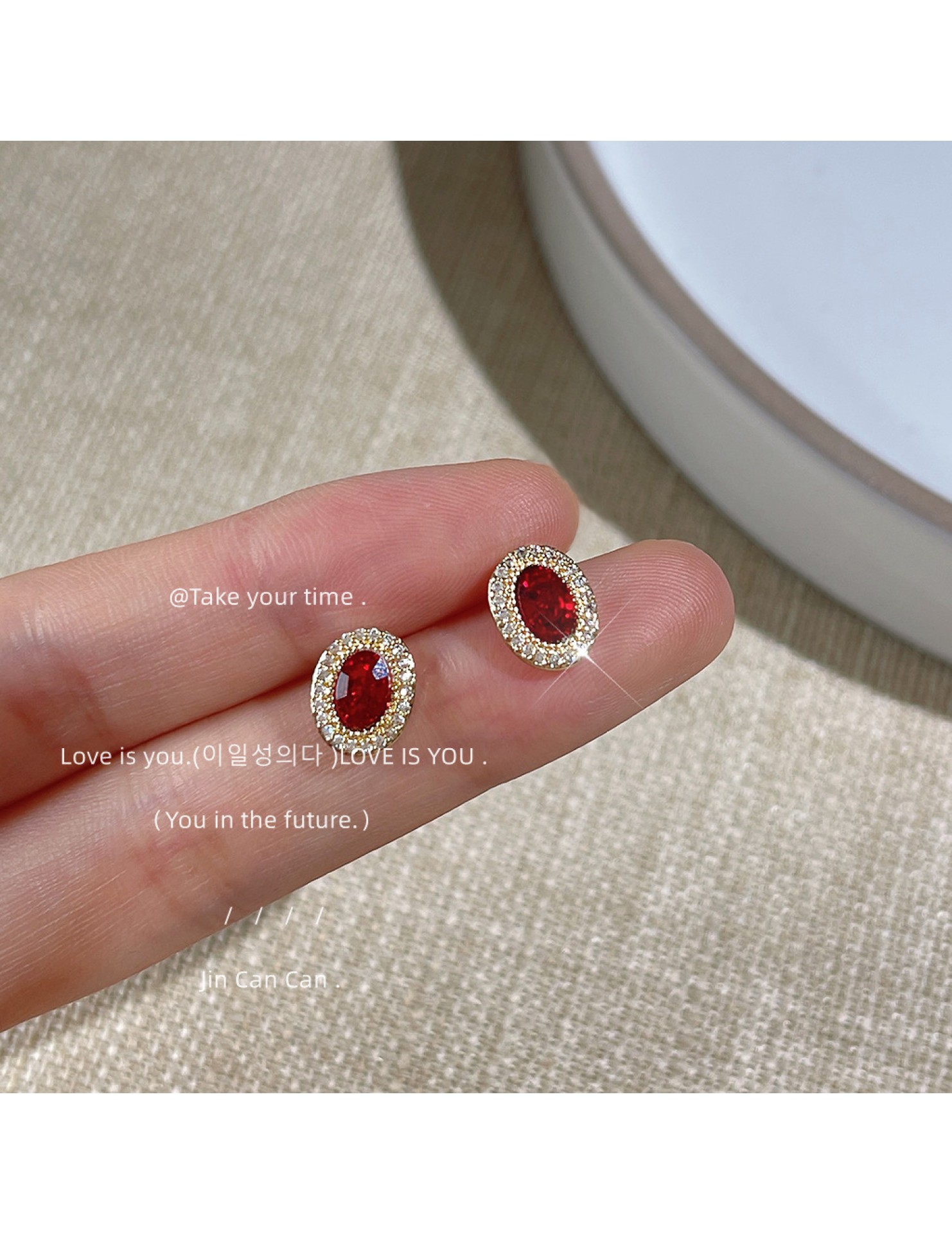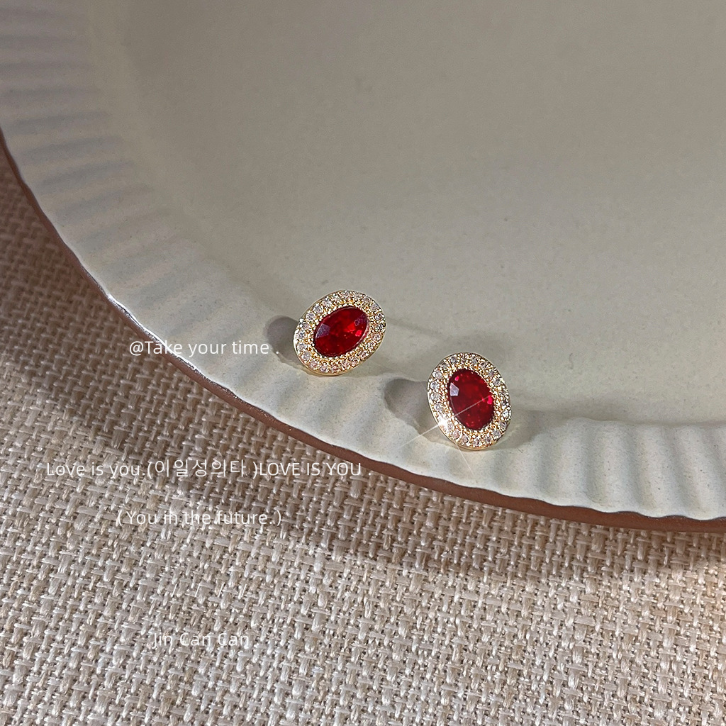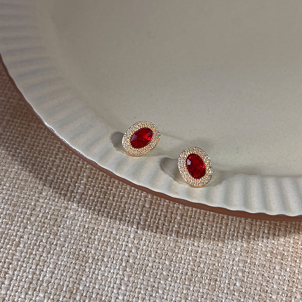 HELN124100022 微鑲鋯石~鵝蛋紅色爆閃925銀針鍍14K橢圓耳釘 小巧輕奢耳飾 耳環