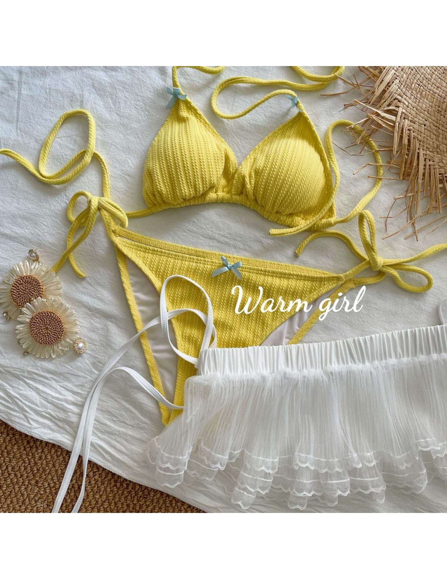 HSPN129100002 【奶油泡芙】新款荷葉邊少女小奶黃純欲比基尼三件套溫泉度假泳衣