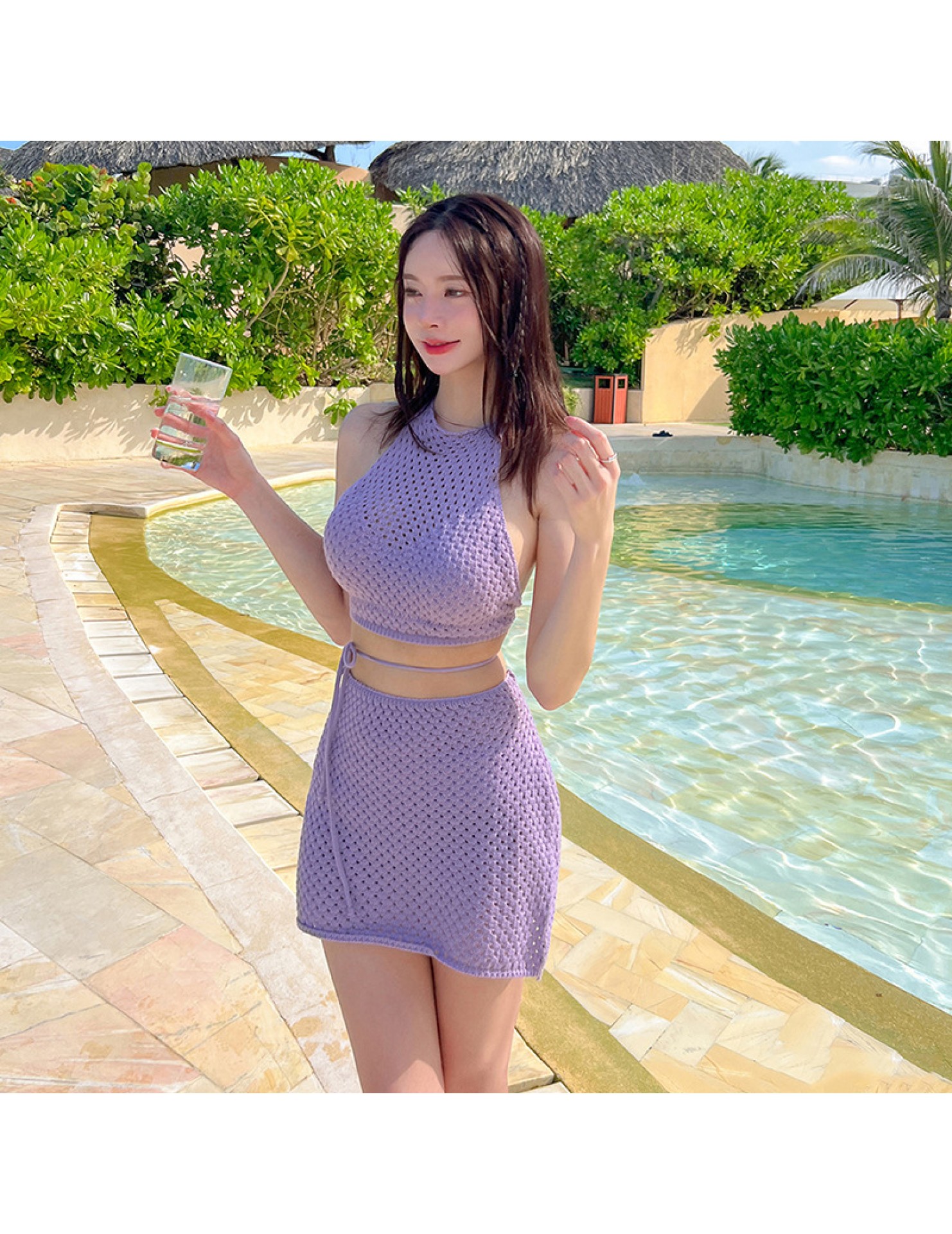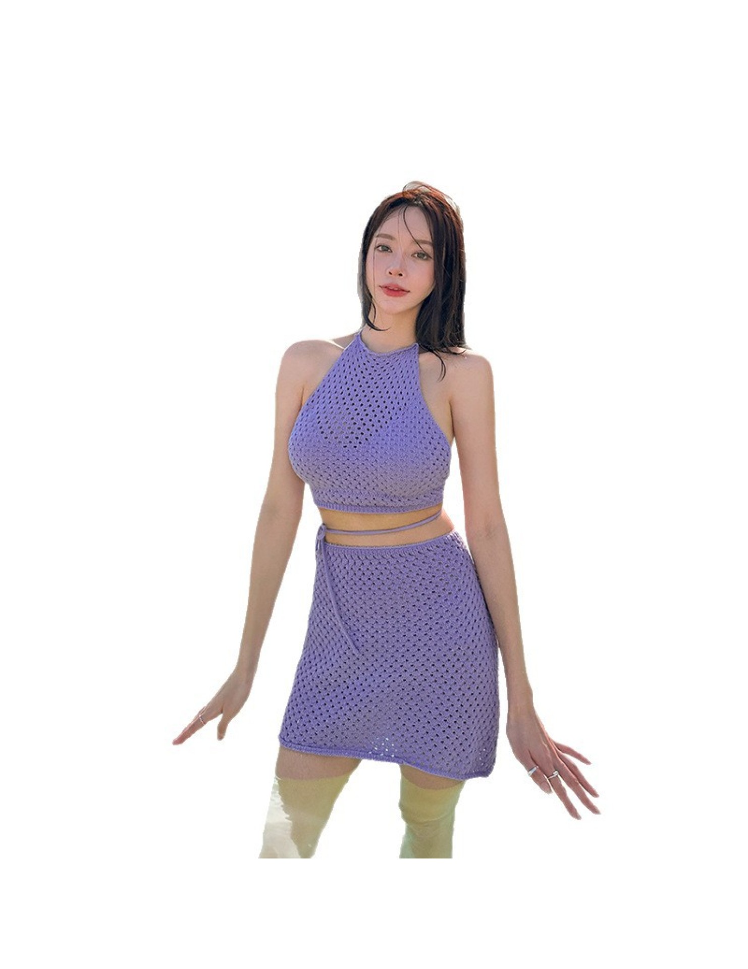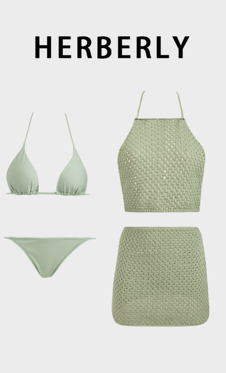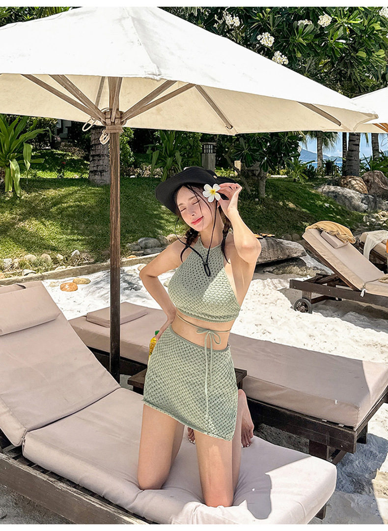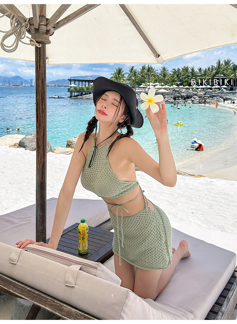 HSPN129100005 豆沙綠韓系掛脖鏤空比基尼四件套遮肉顯瘦高顏值度假分體泳衣