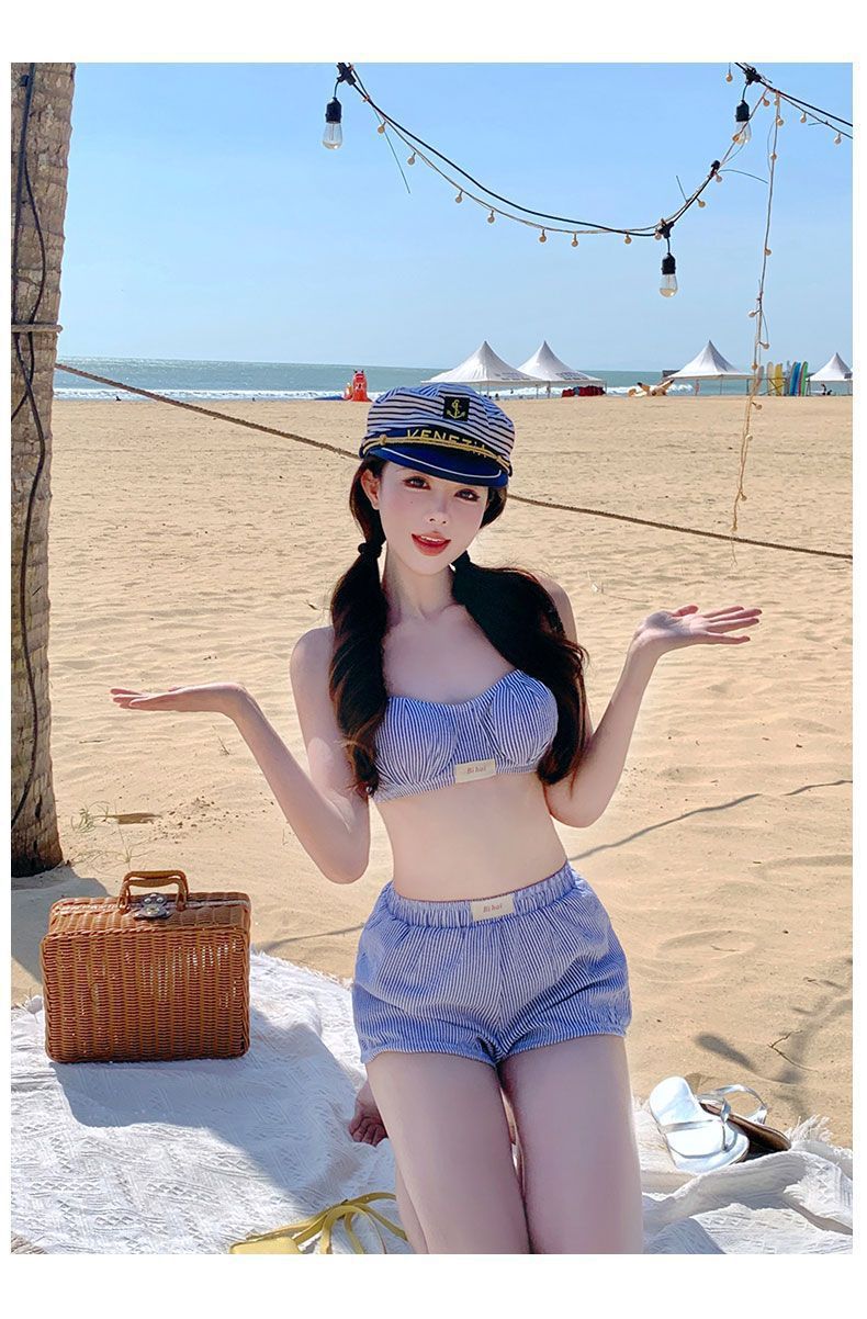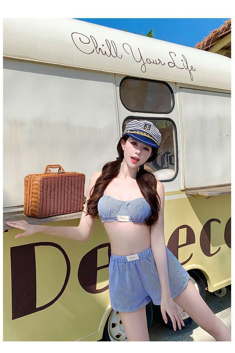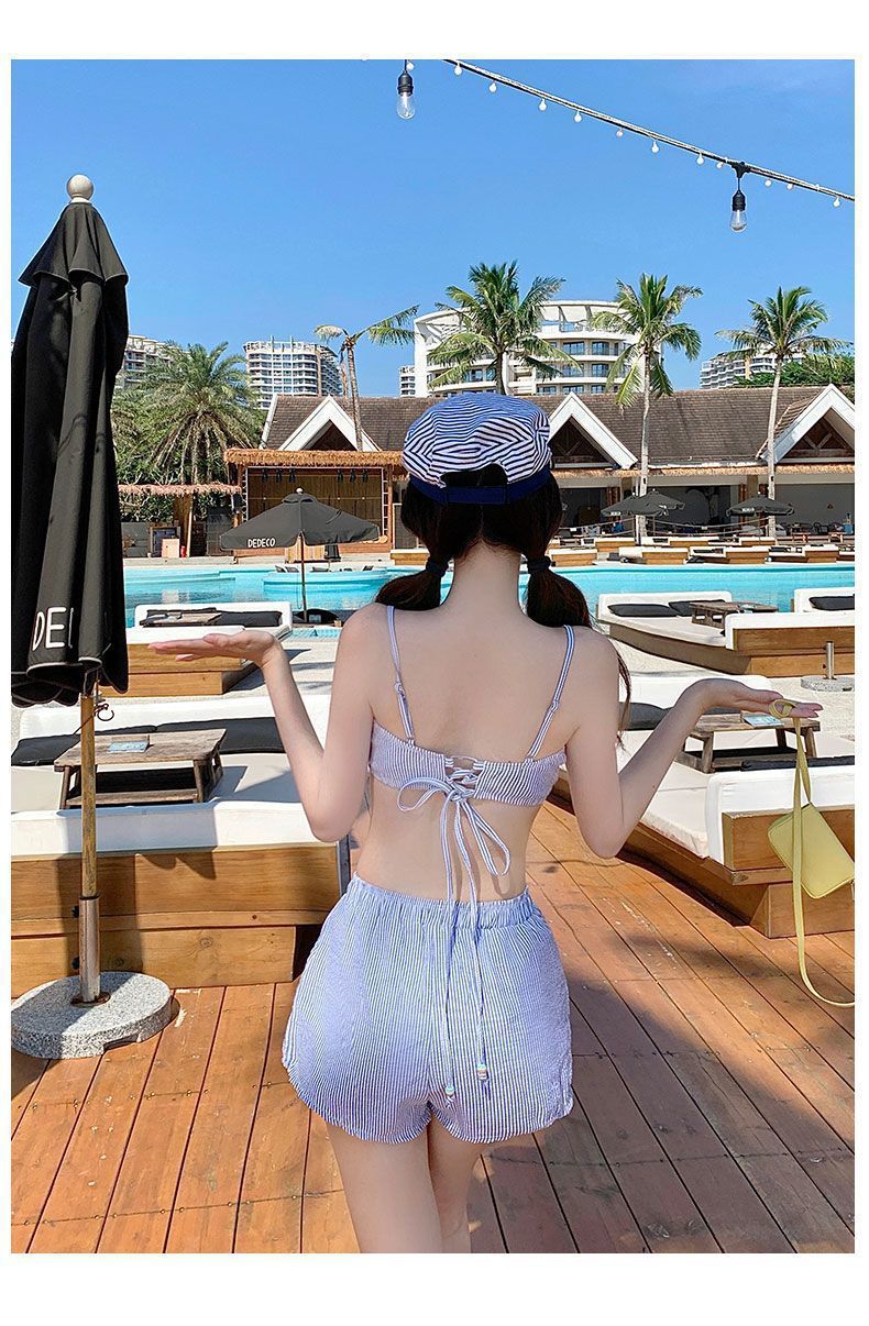 HSPN205100004 甜美少女藍白條可愛小胸保守沙灘褲三件套分體游泳衣女士溫泉度假