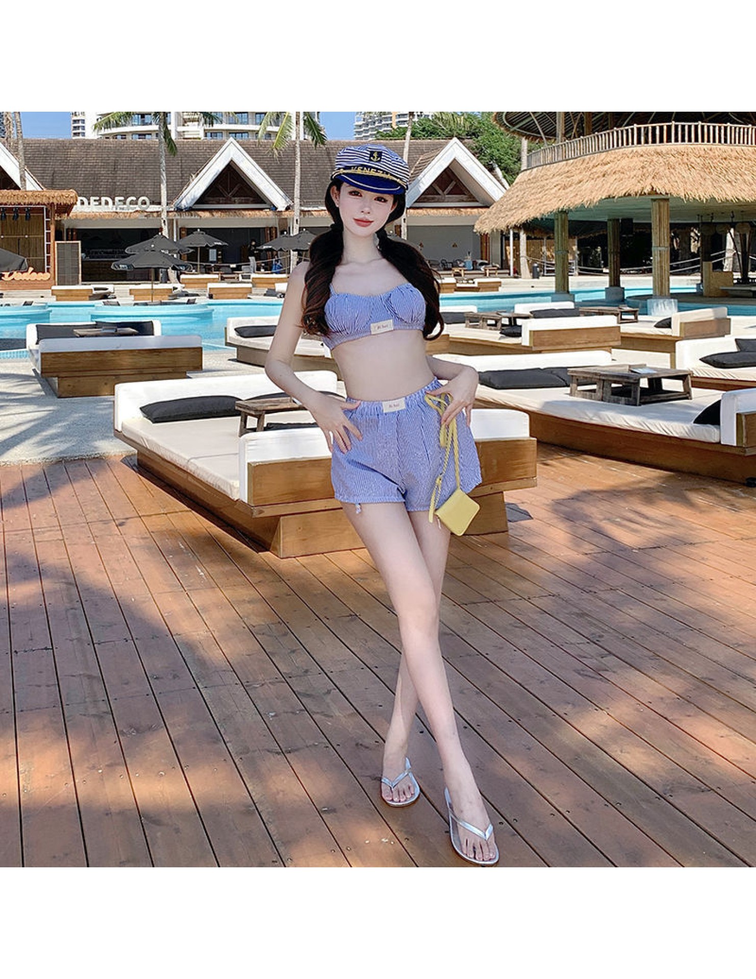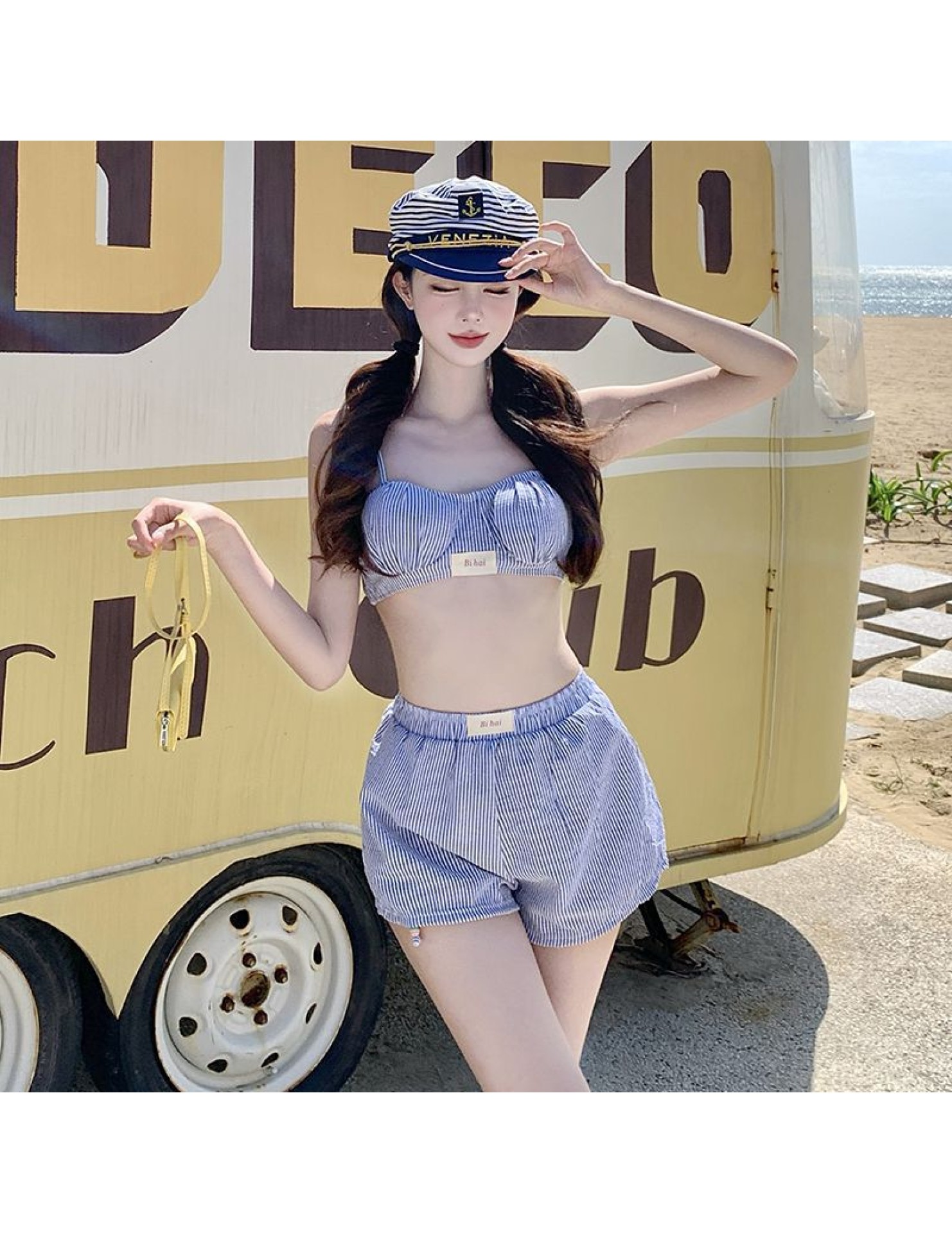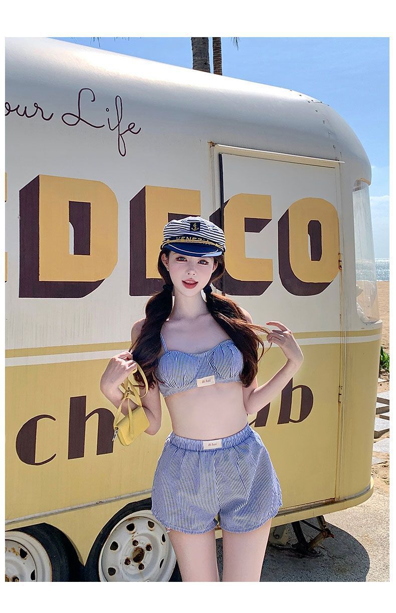 HSPN205100004 甜美少女藍白條可愛小胸保守沙灘褲三件套分體游泳衣女士溫泉度假