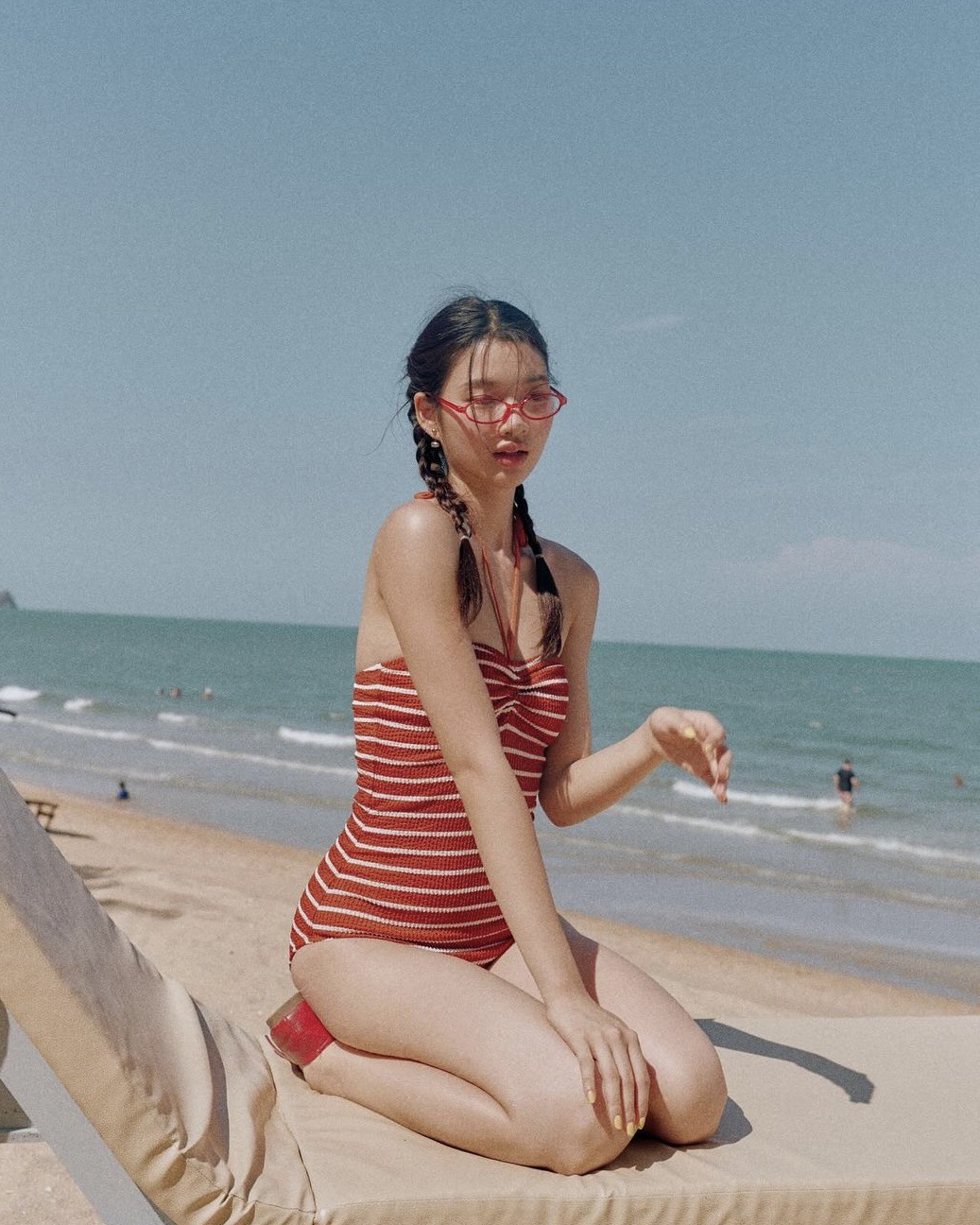 HSPN205100007 復古肌理條紋掛脖抹胸比基尼海邊度假分體