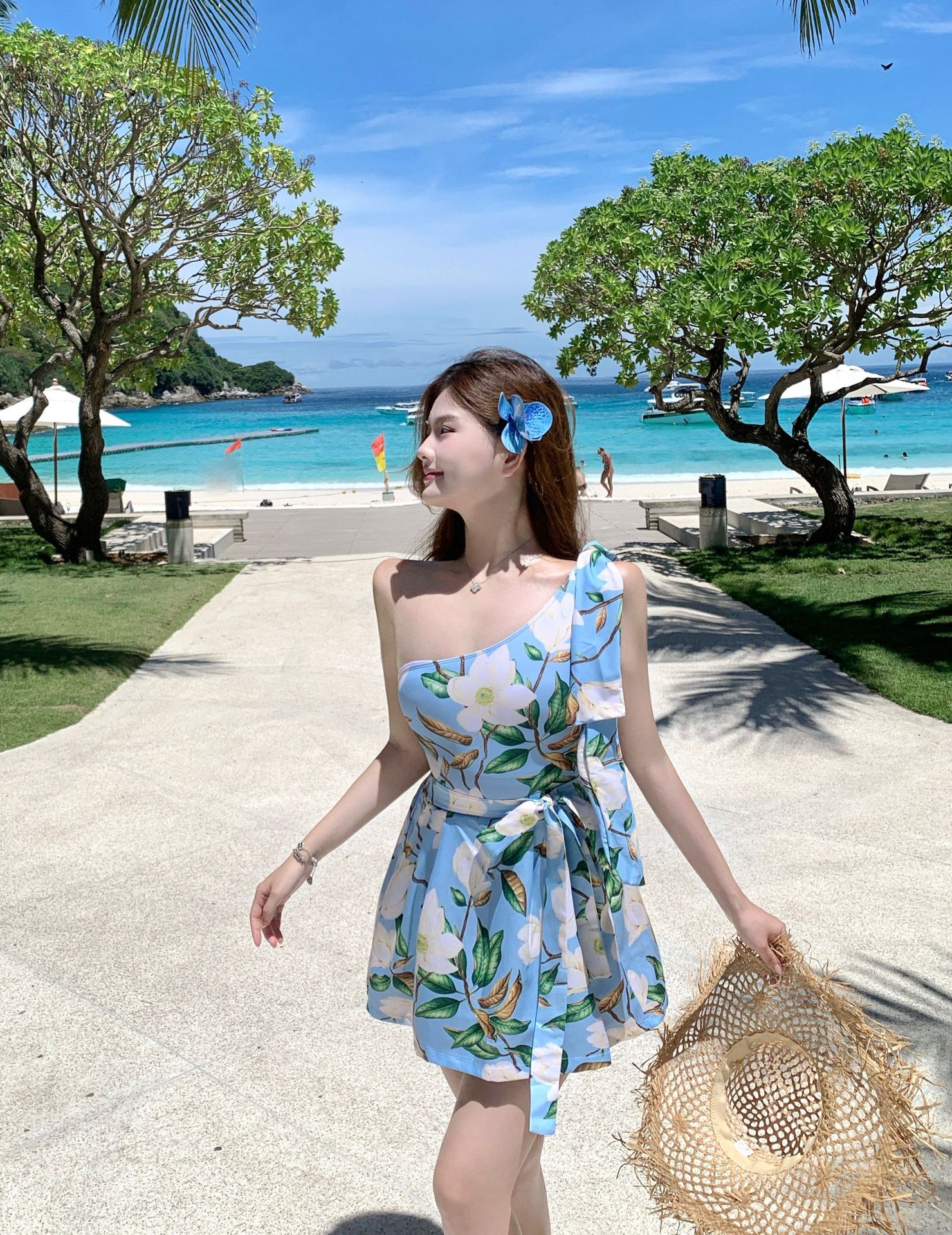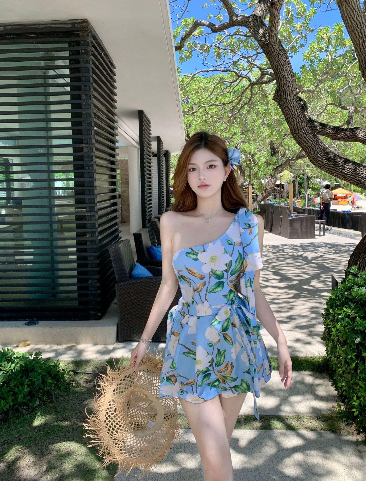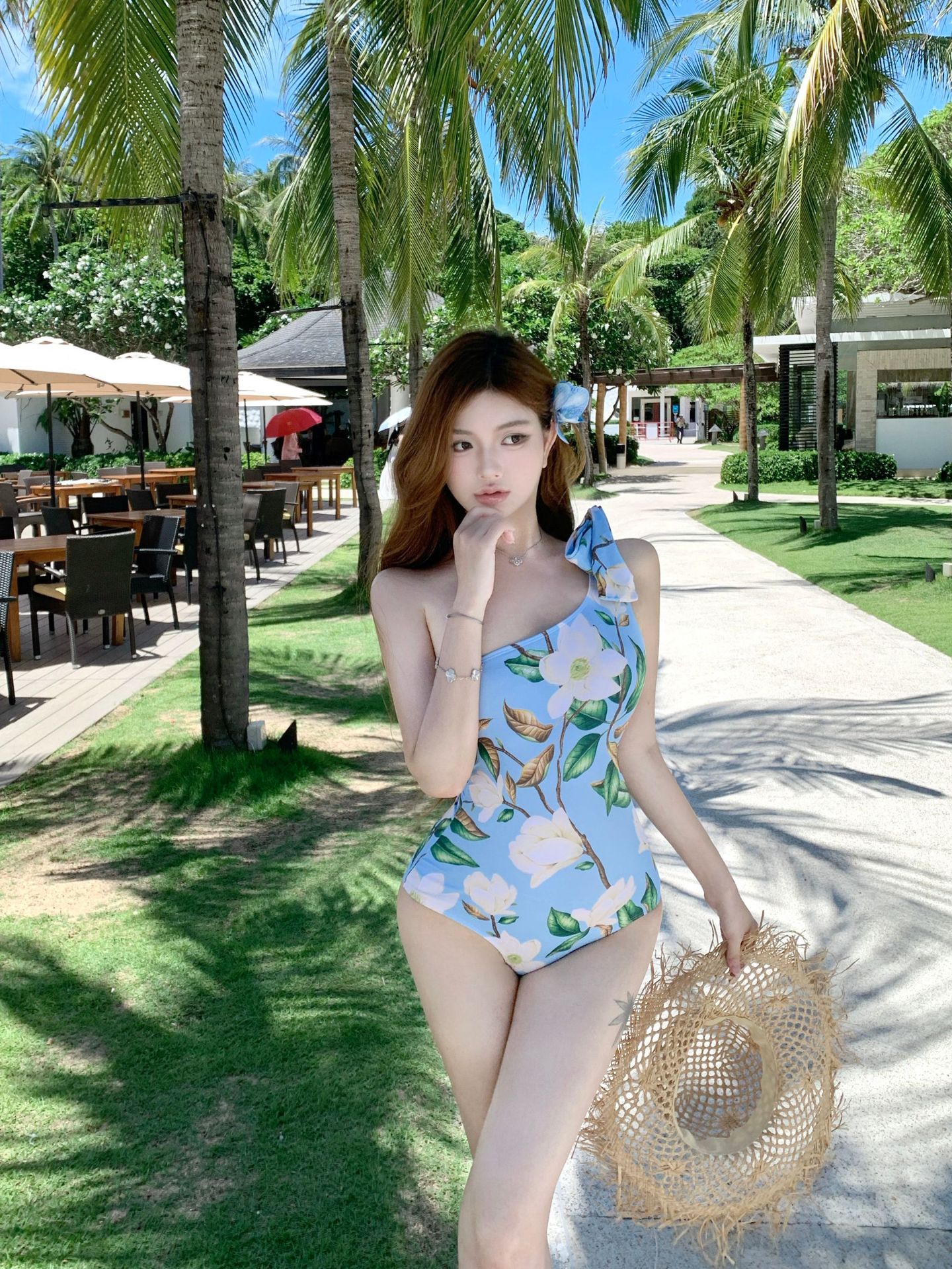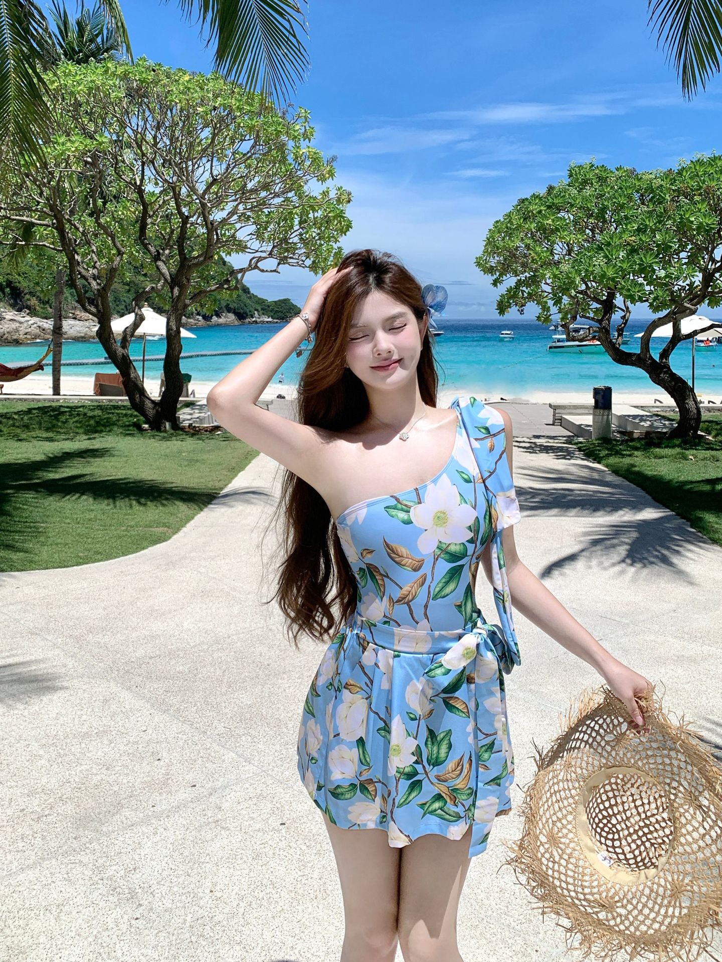 HSPN205B100002 新款藍色小清新碎花海邊度假連體泳衣