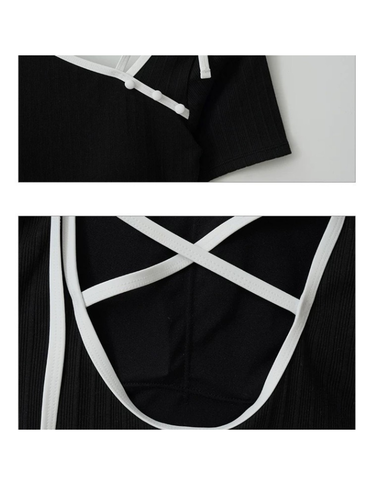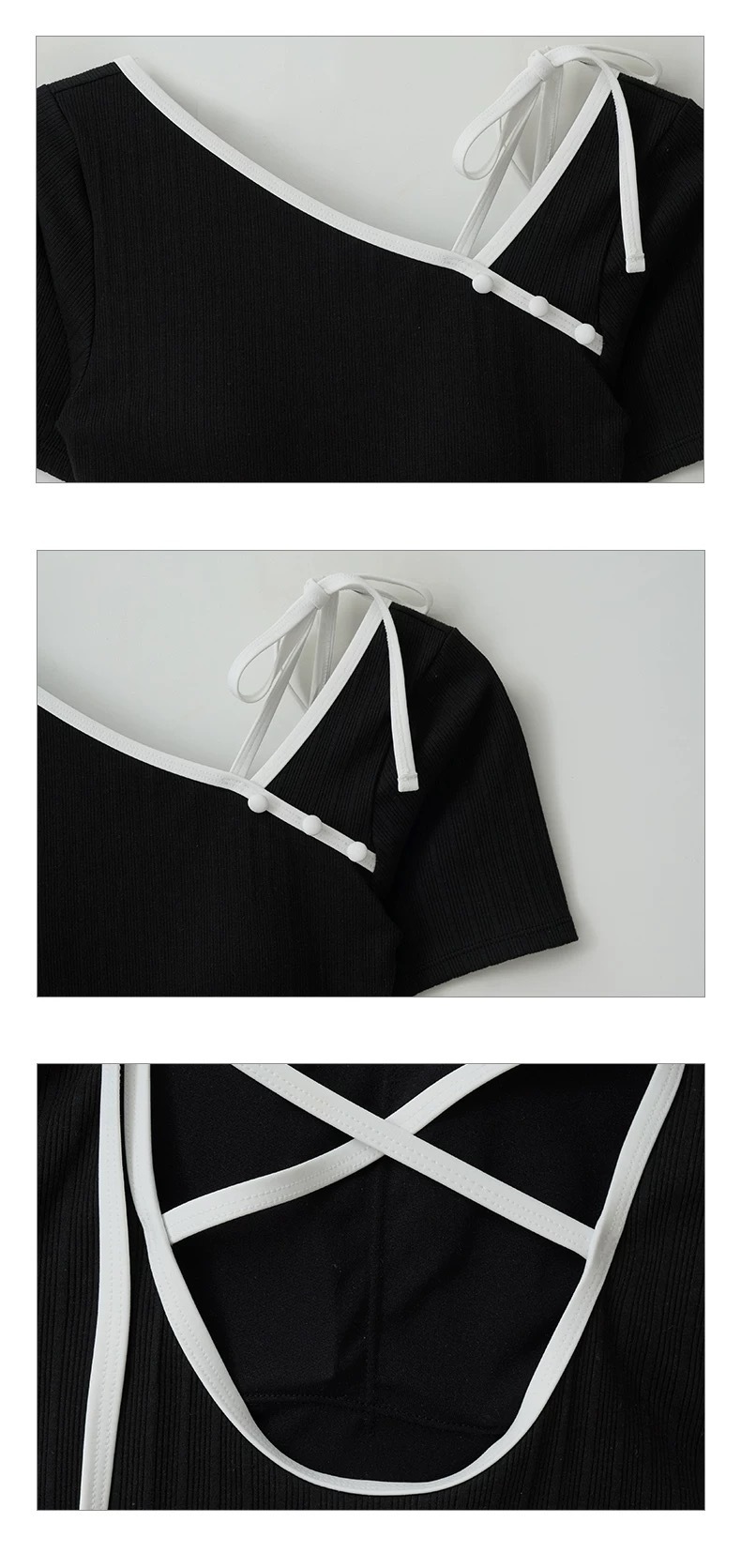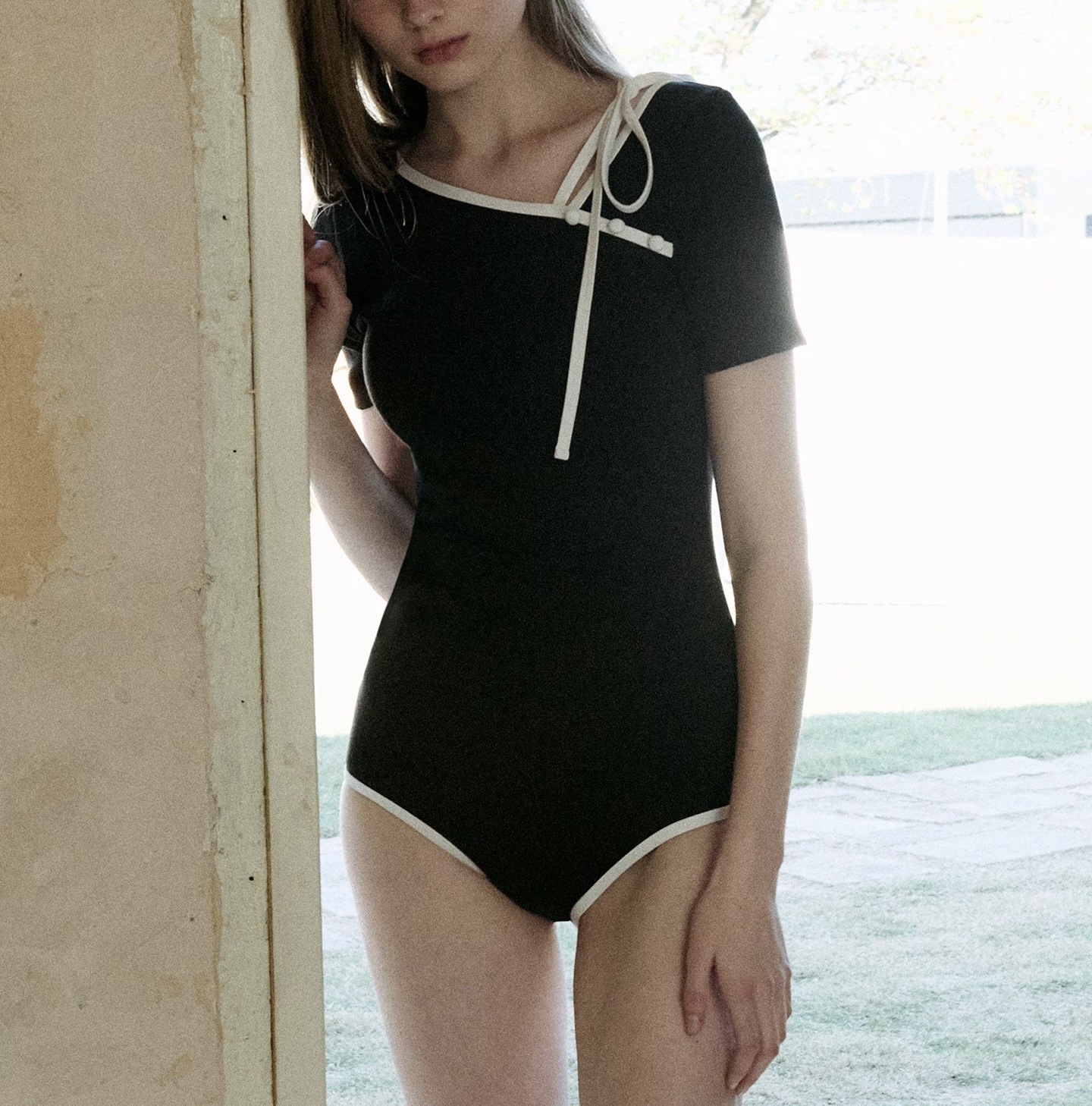 HSPN6321100003 新中式斜肩豆扣露背綁帶連體泳衣女短袖修身帶胸墊