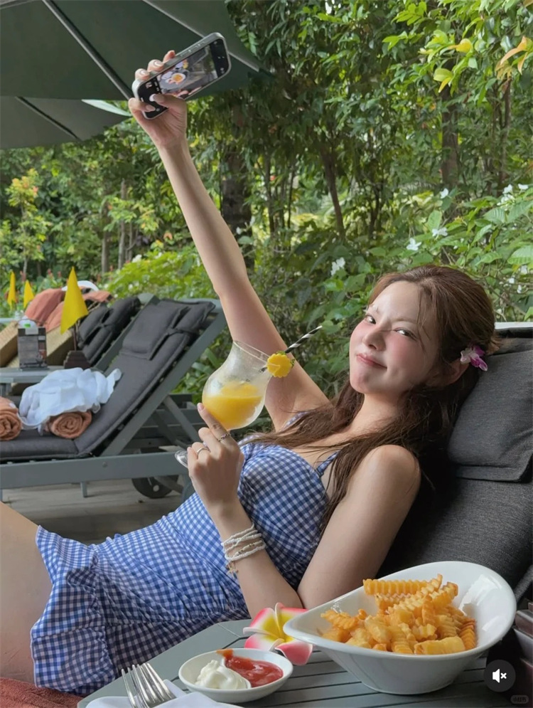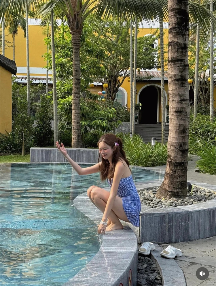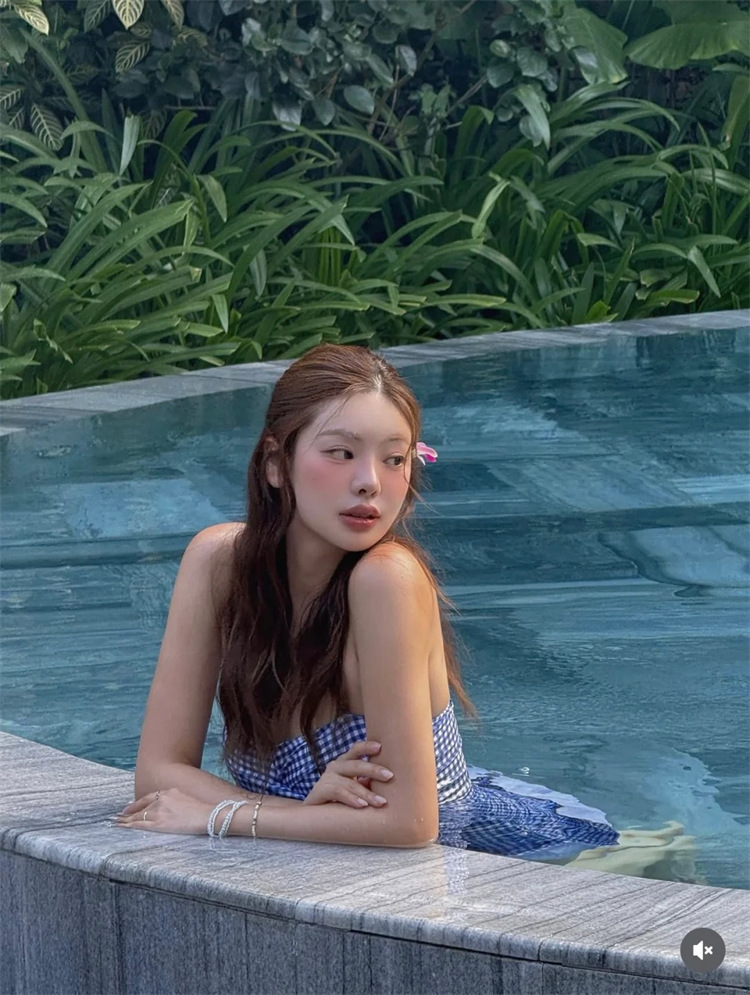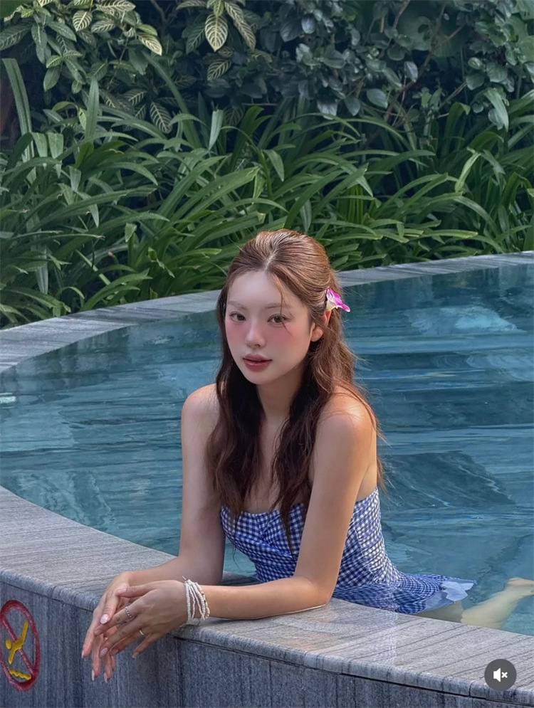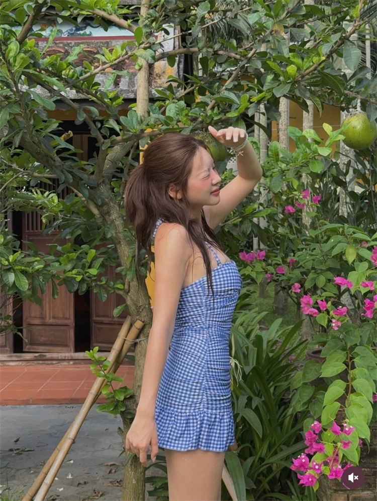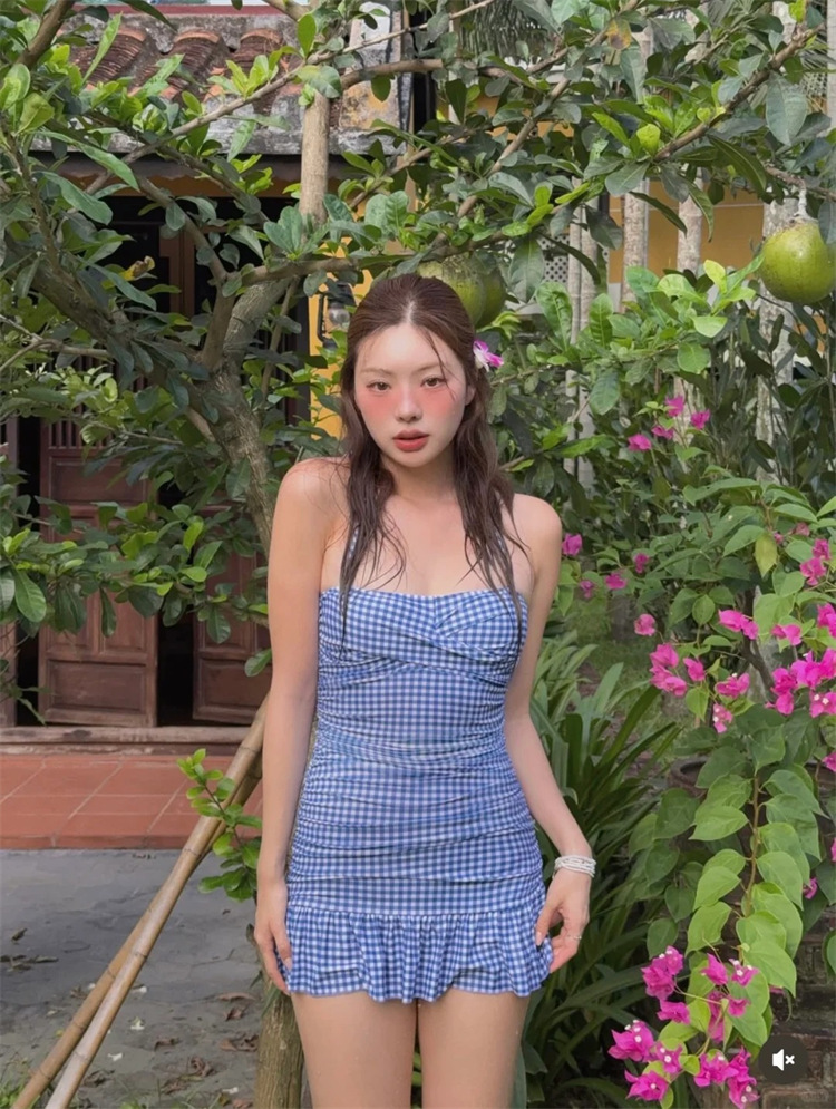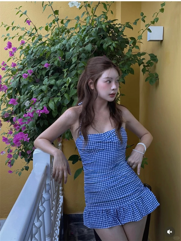 HSPN6321100011 藍白格紋掛脖抽褶分體泳衣度假清新島嶼百搭拍照超出片