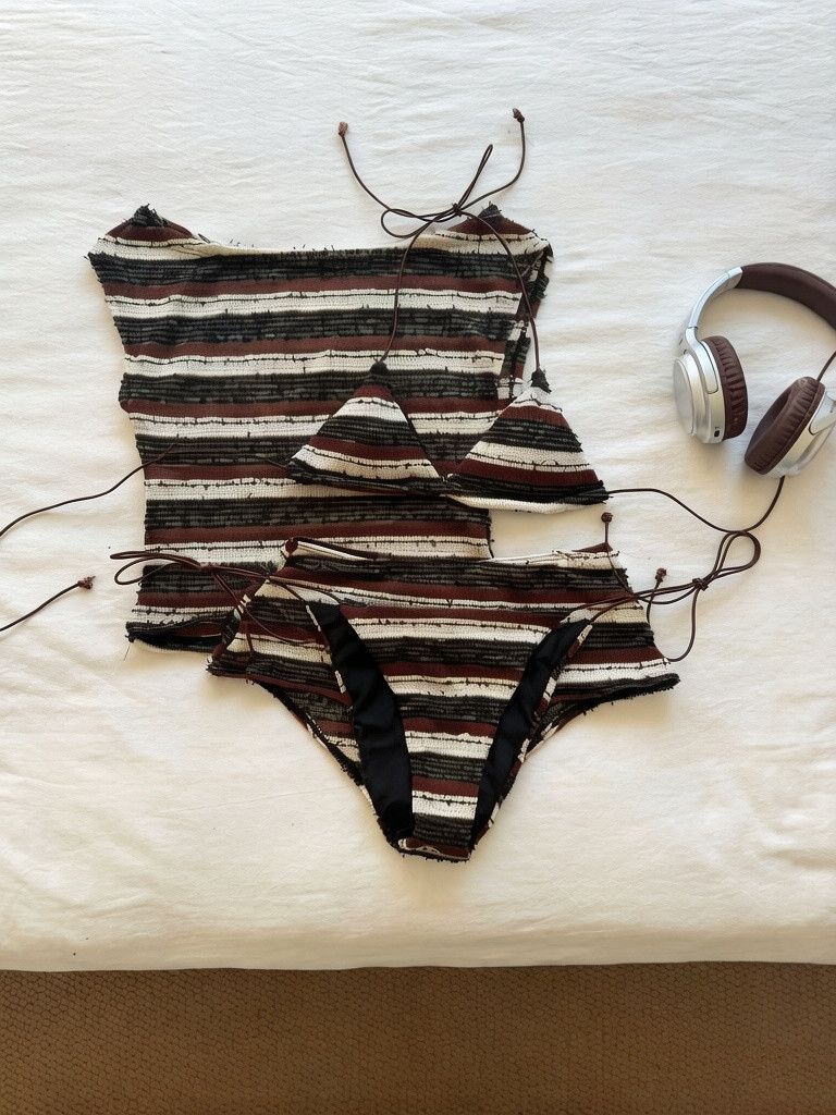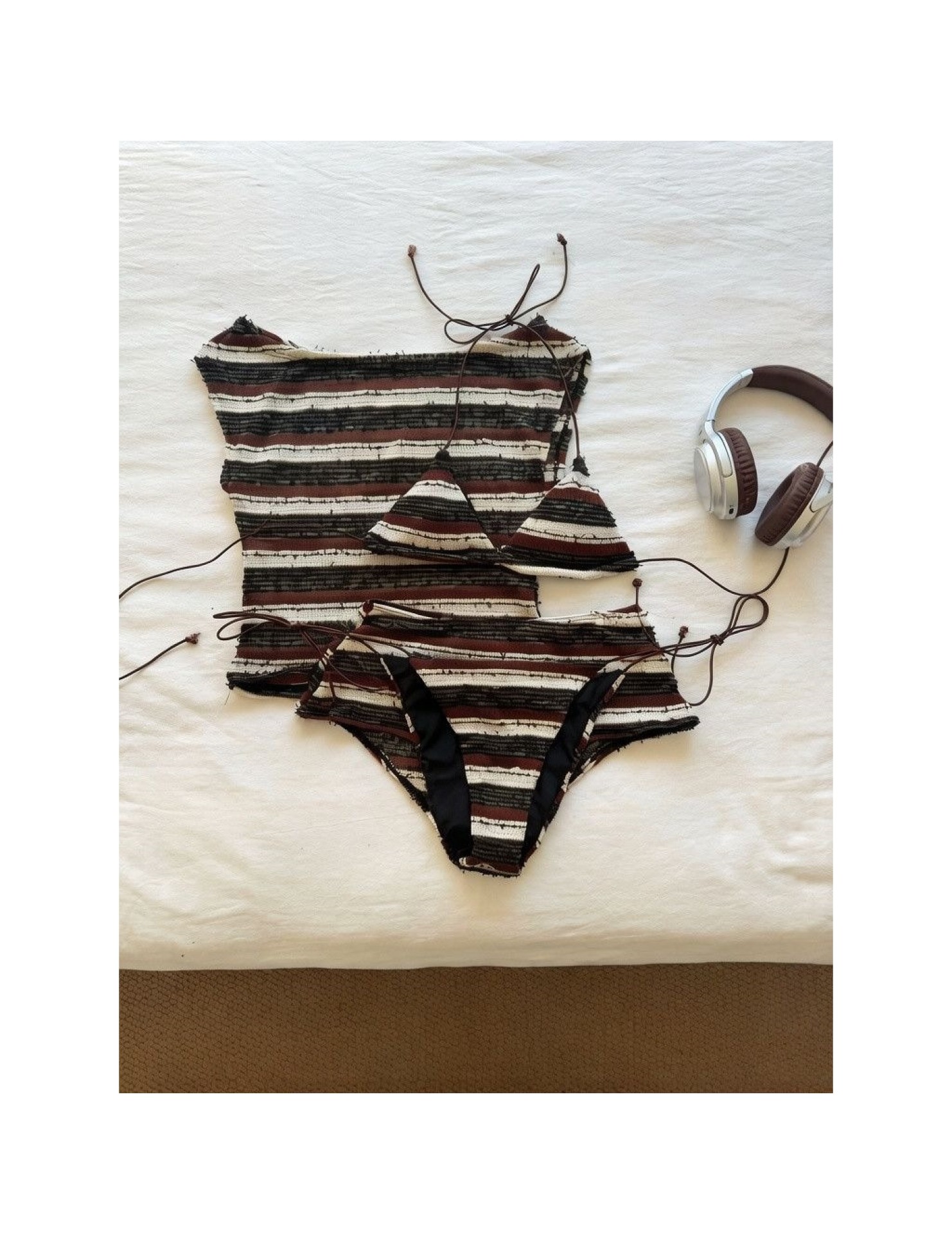HSPN6328100001 加州辣妹性感條紋斜肩針織分體泳衣海島度假溫泉
