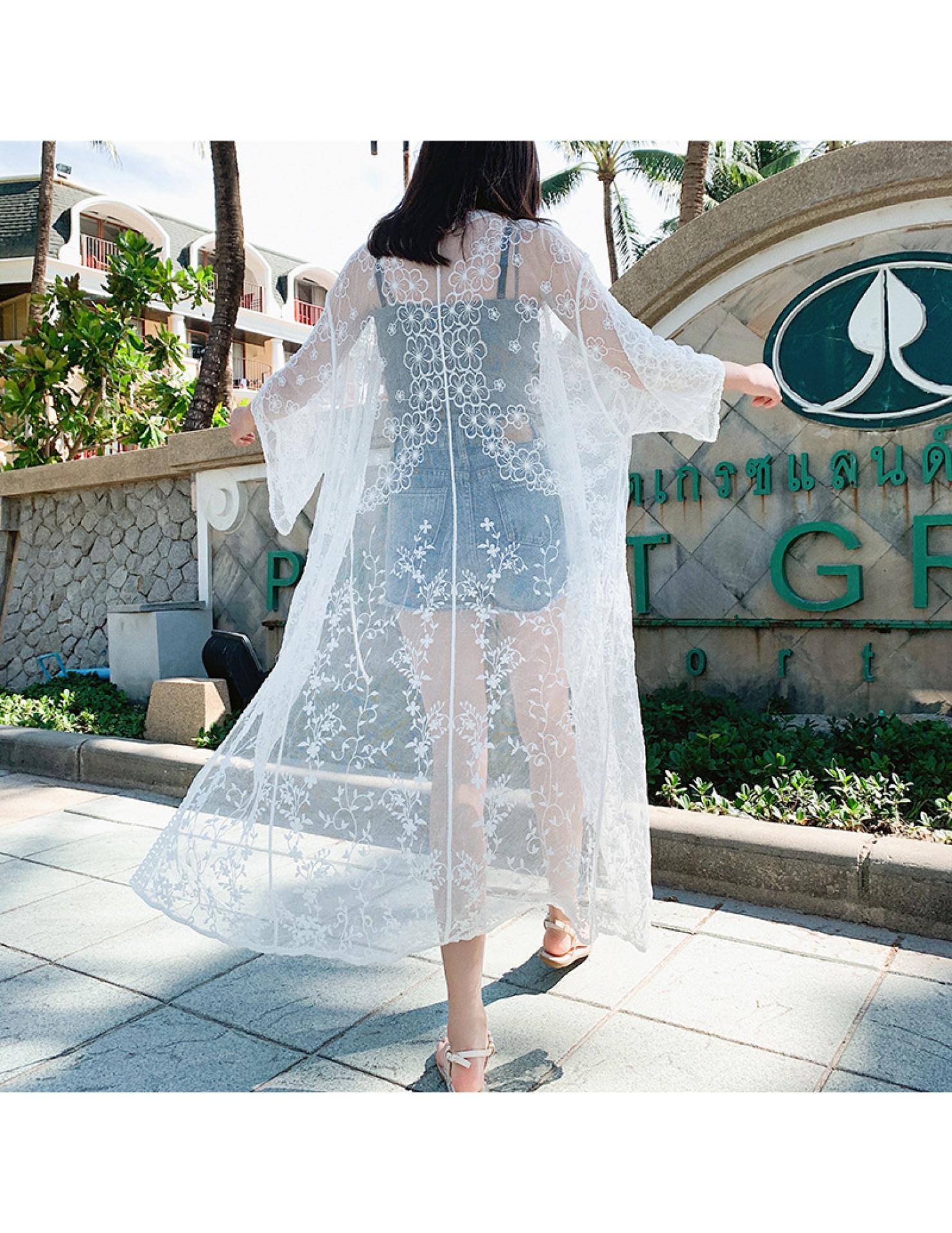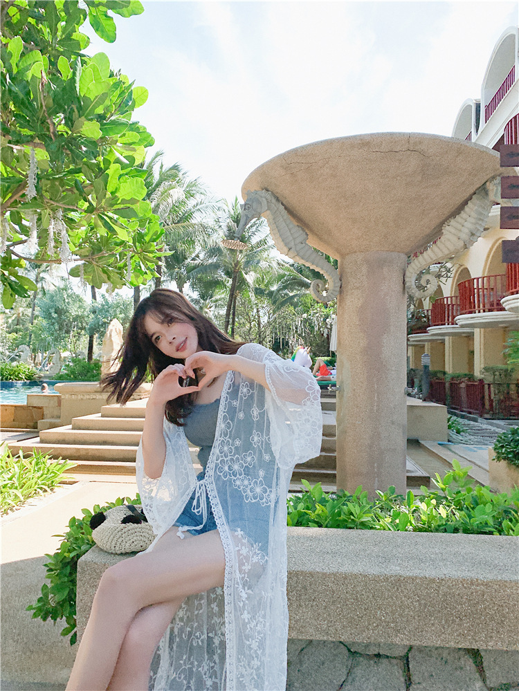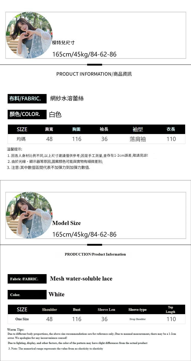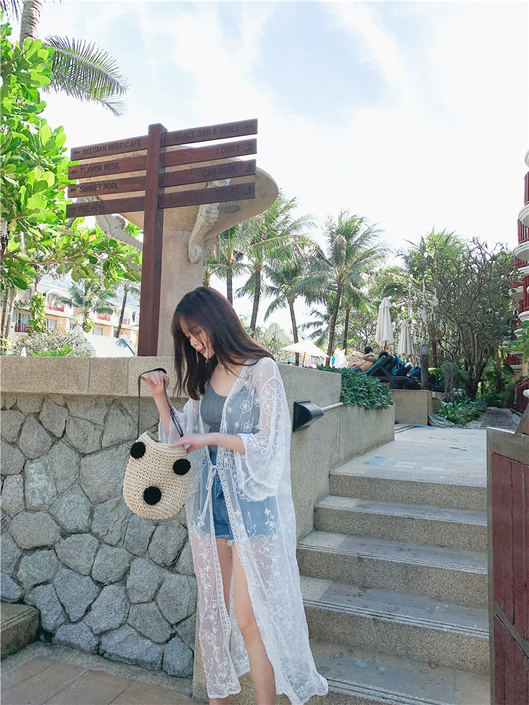 LWBC6326100057 蕾絲網紗刺繡透視輕盈長款闊袖防曬衣蕾絲衫開衫