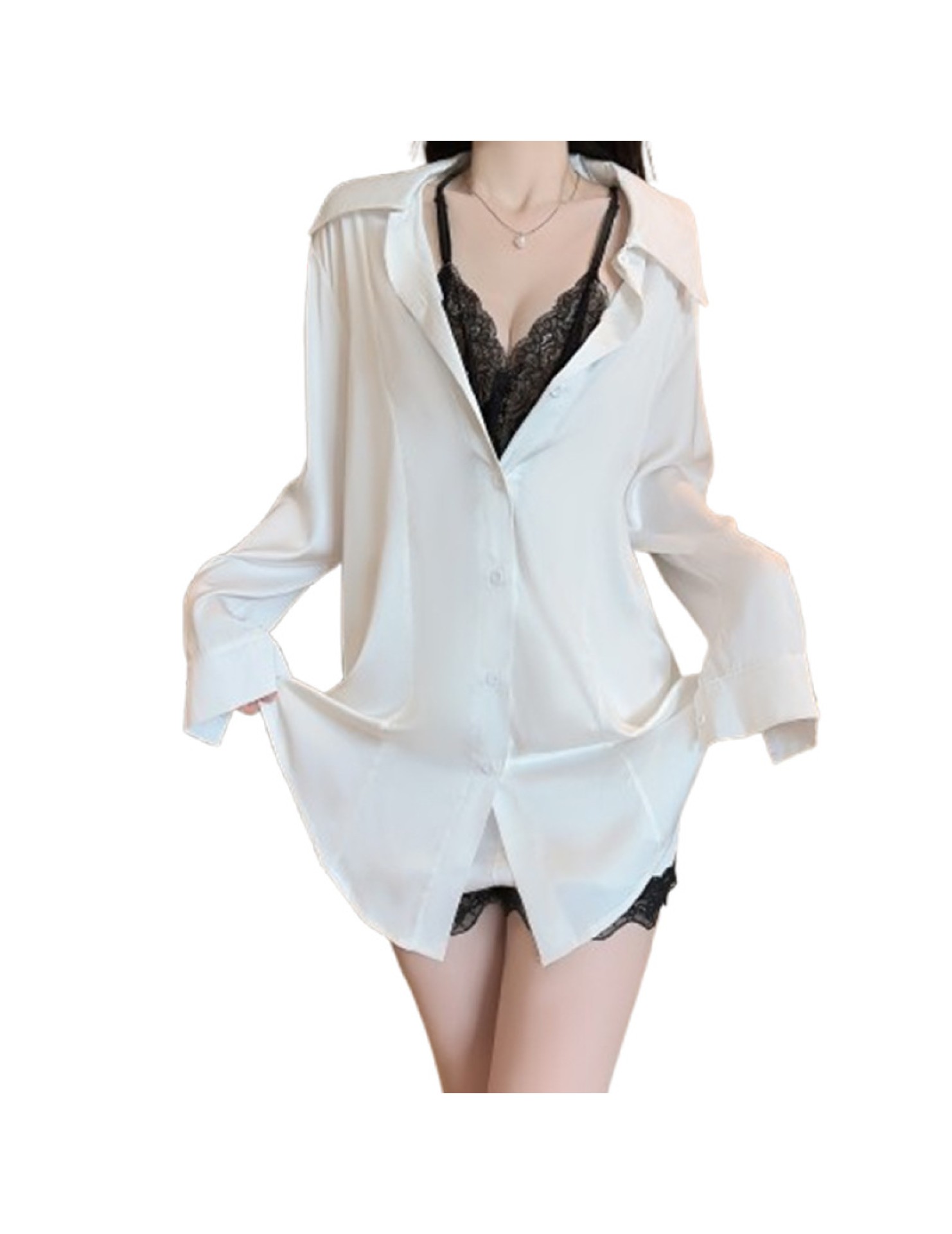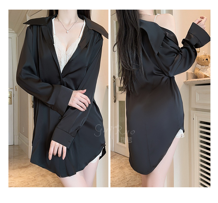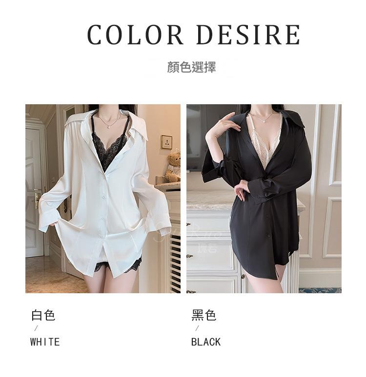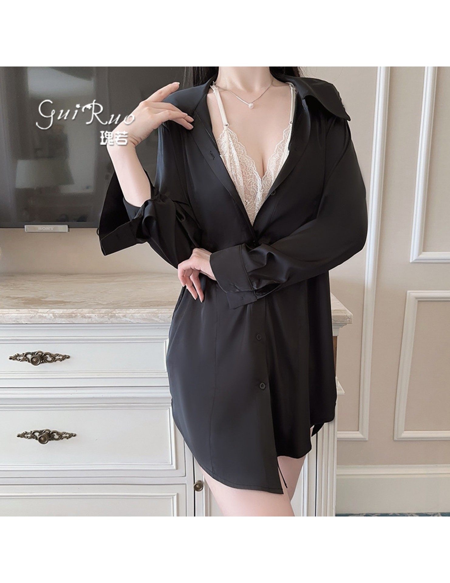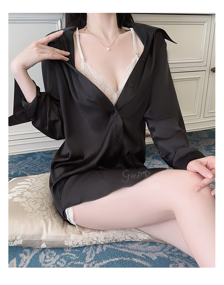 LPLT6319100089 性感深V慵懶開襟襯衫甜美誘惑蕾絲寬松男友風睡裙套裝