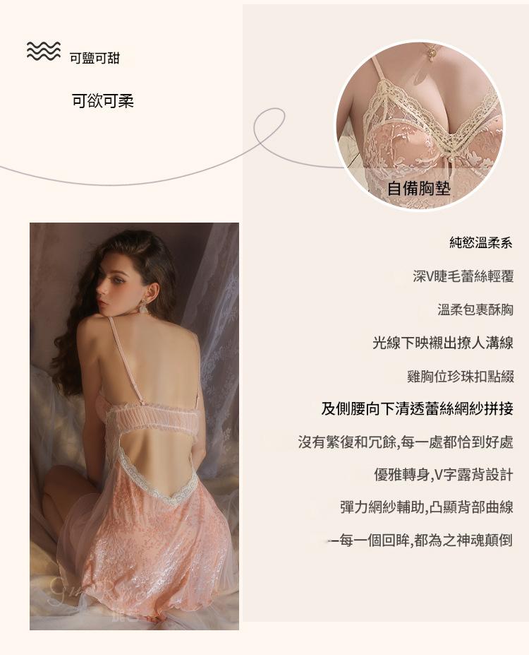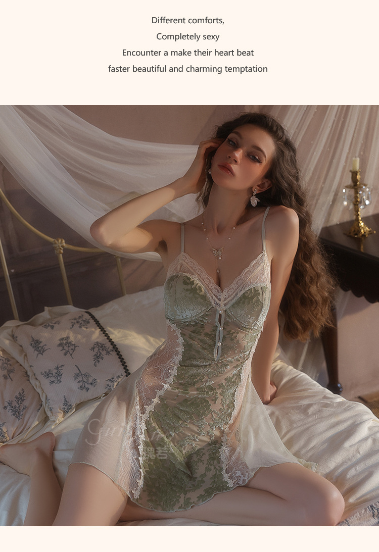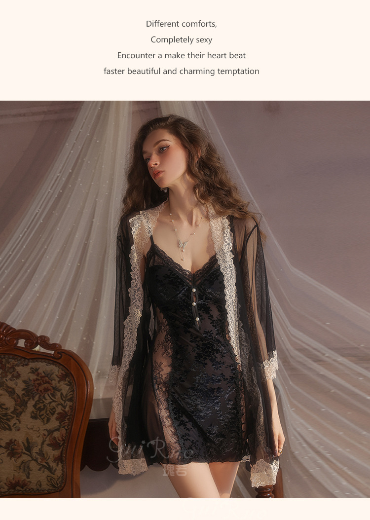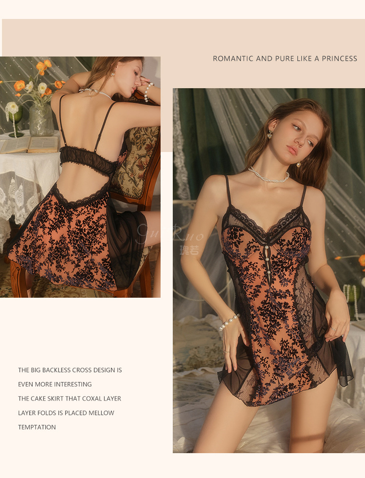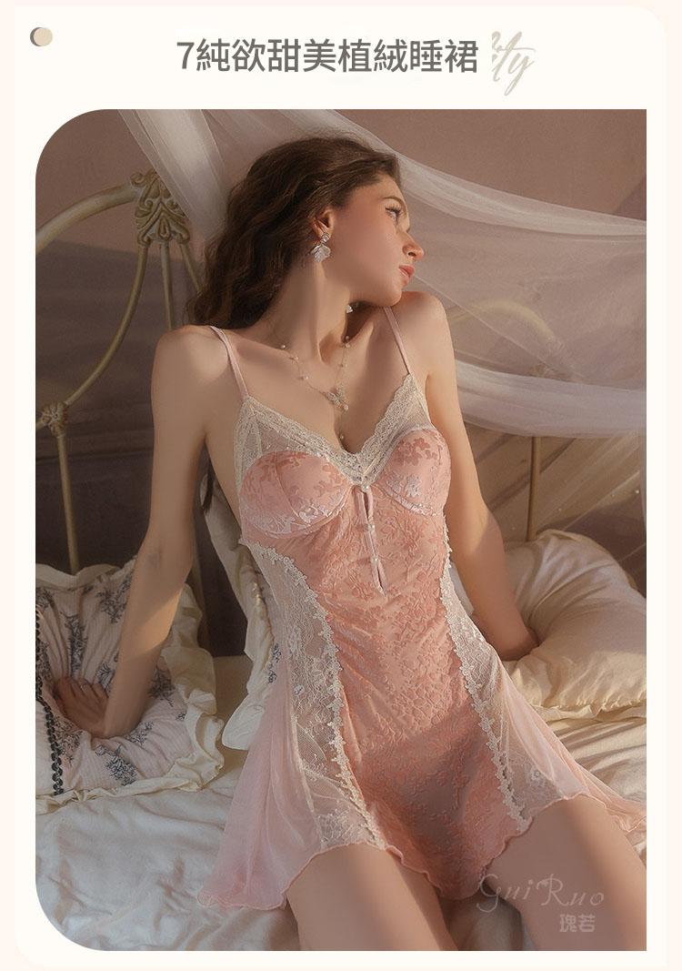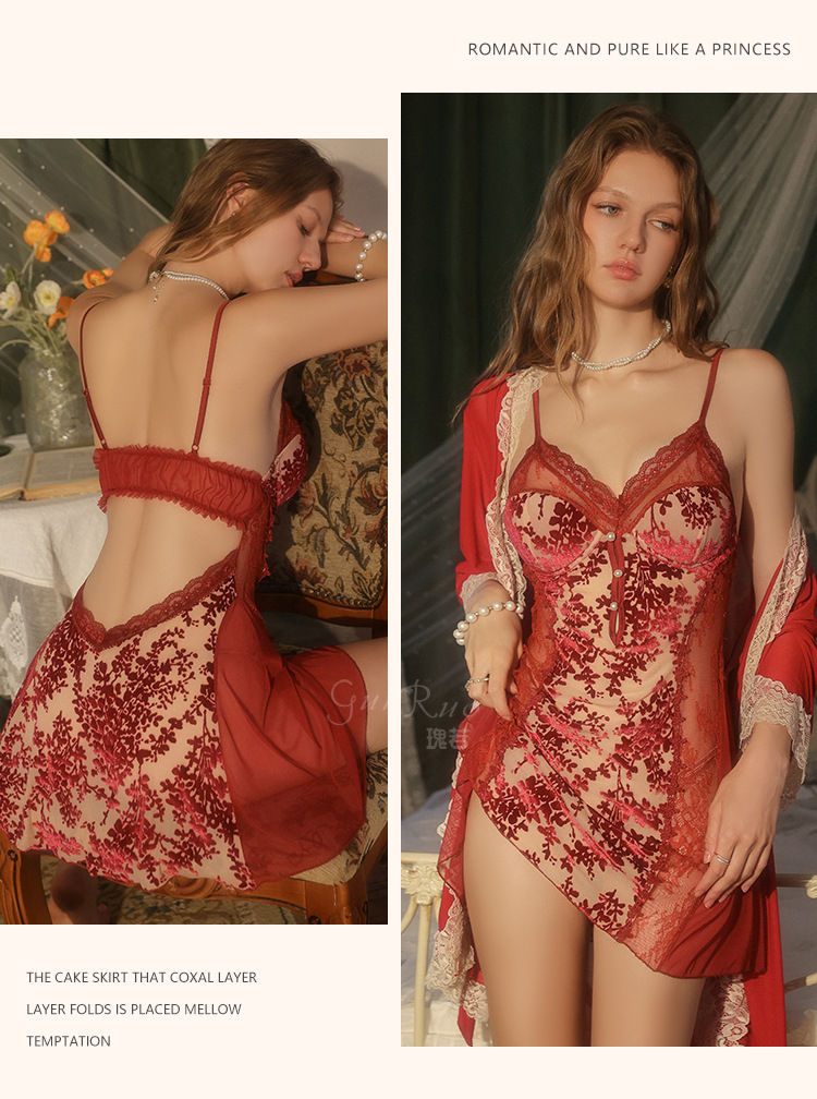 LPLT6319100061 純欲誘惑絲絨睡衣激情深V加胸墊性感睡裙網紗外袍女套裝