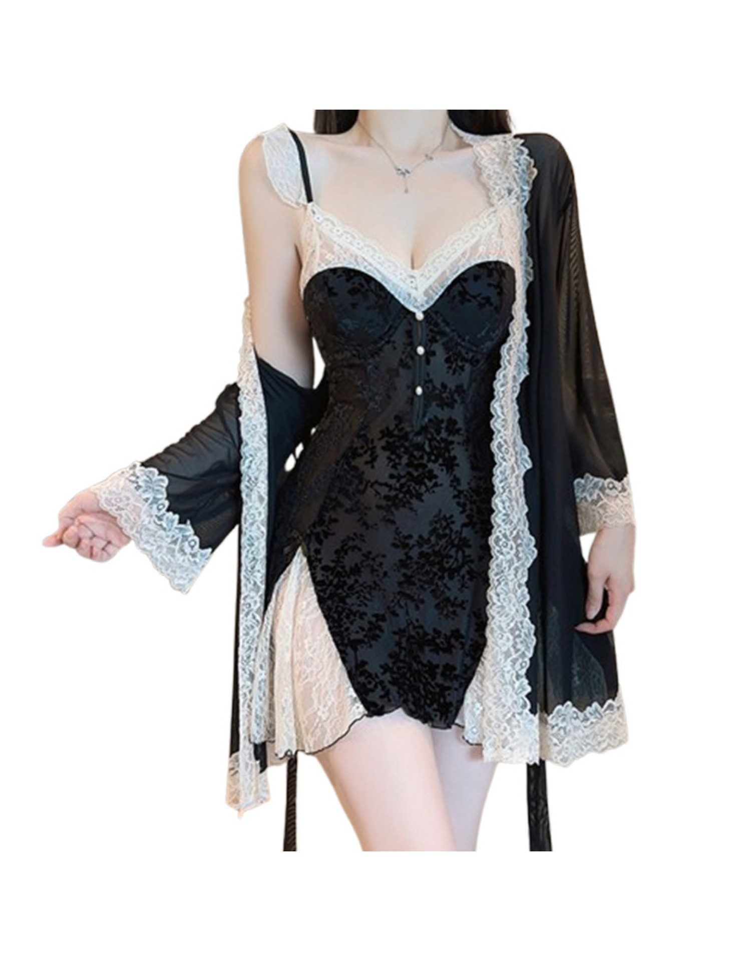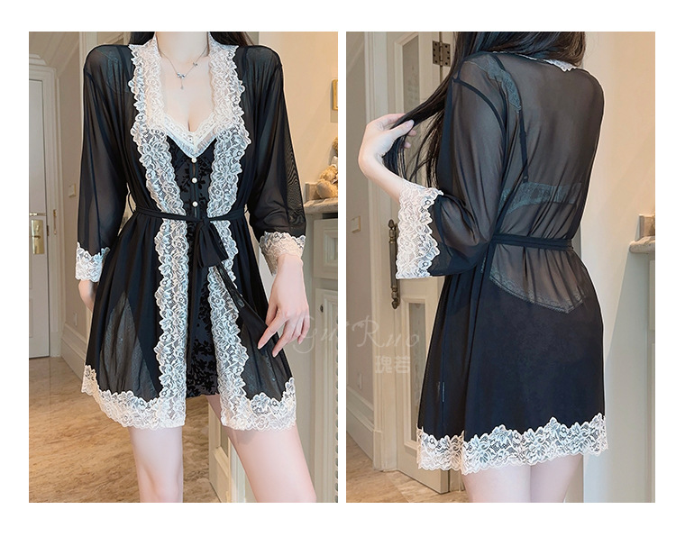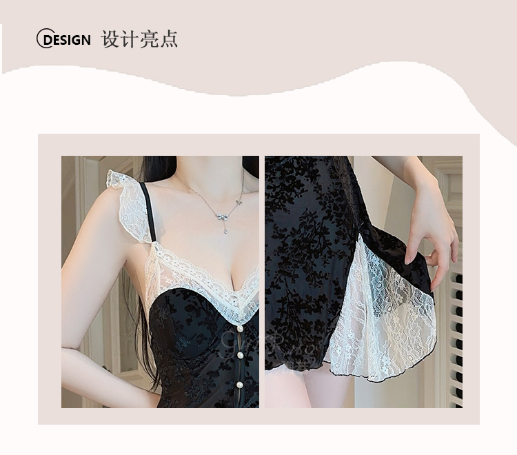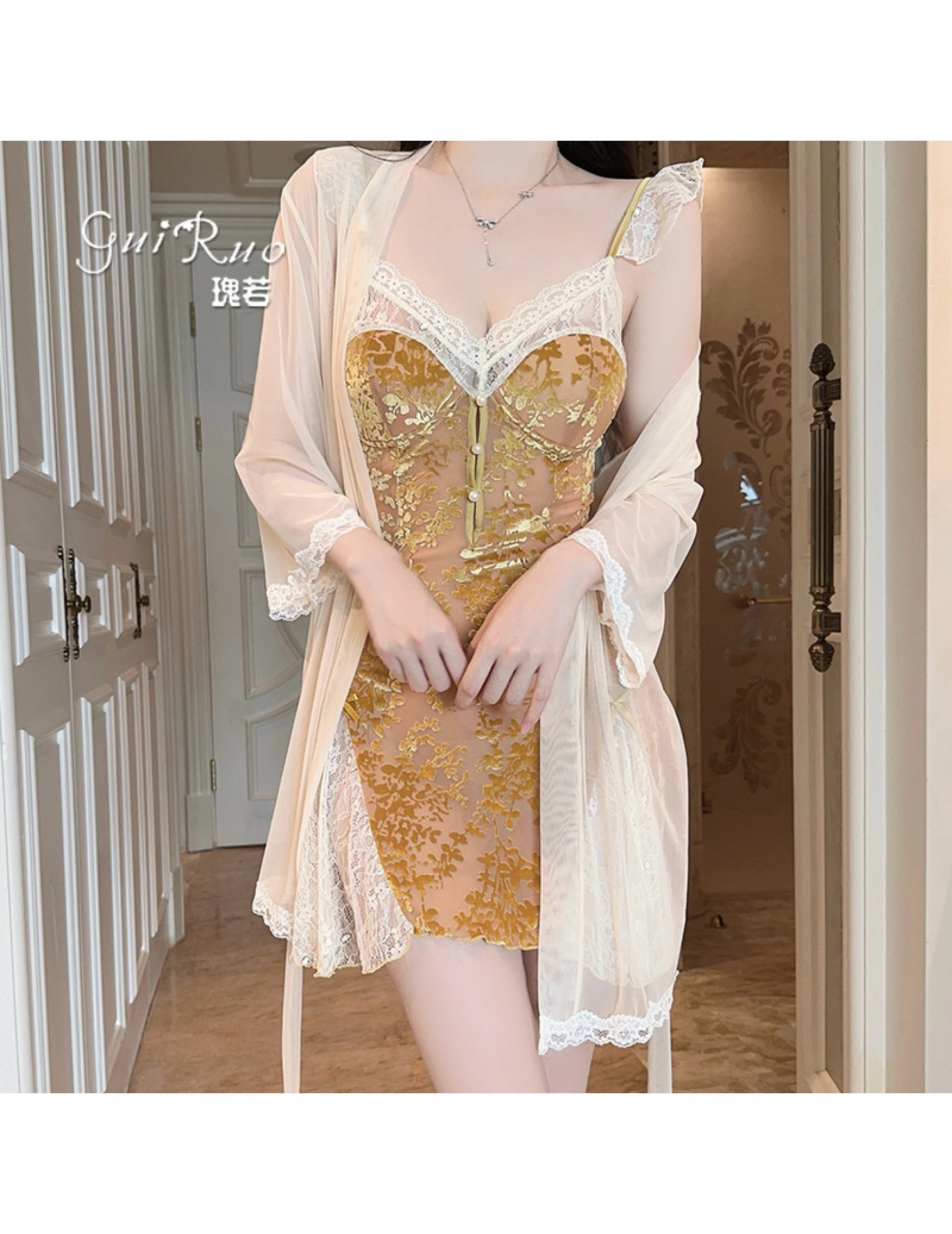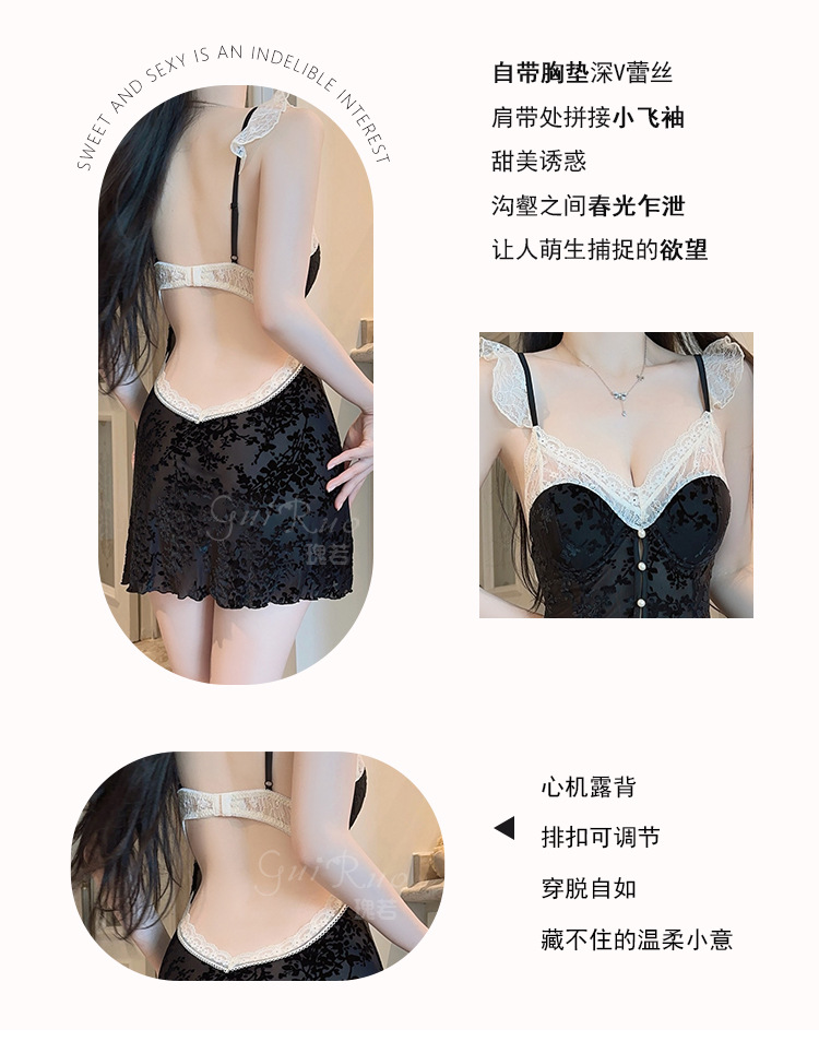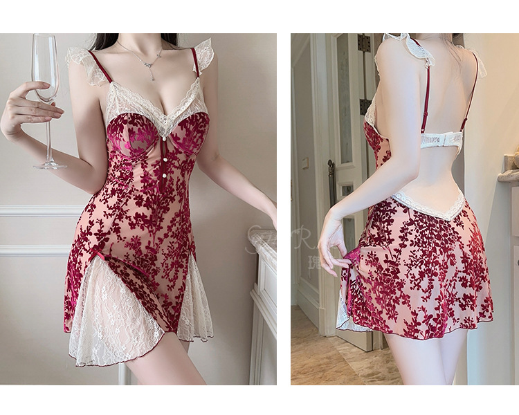 LPLT6319100087 內衣甜美誘惑飛袖深V露背加胸墊絲絨睡裙外袍女套裝