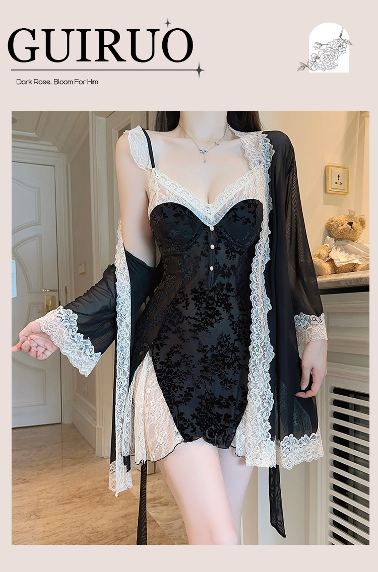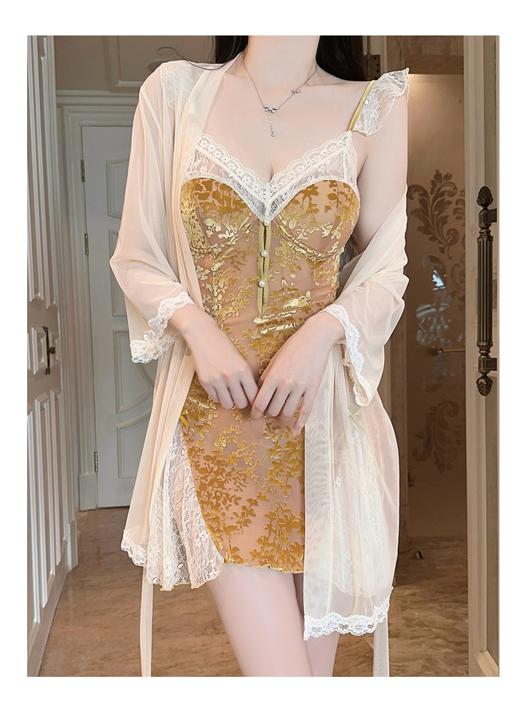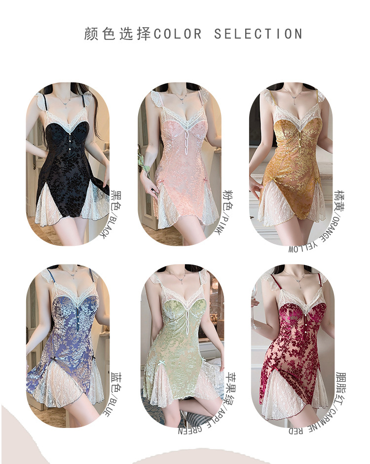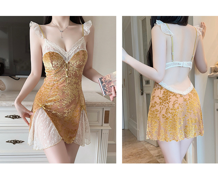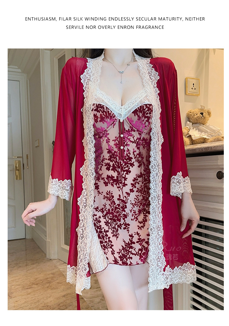 LPLT6319100087 內衣甜美誘惑飛袖深V露背加胸墊絲絨睡裙外袍女套裝