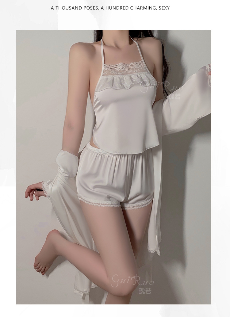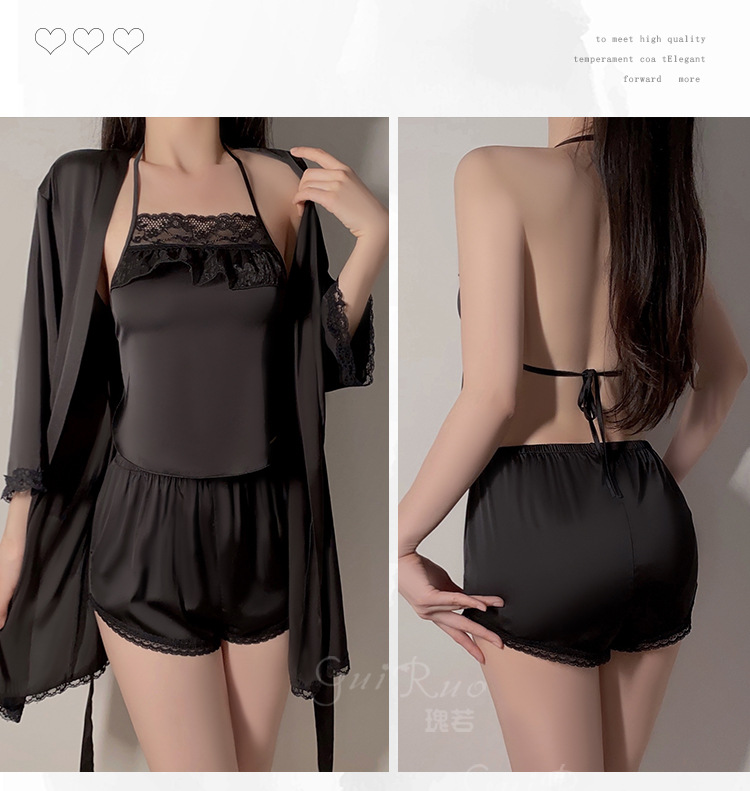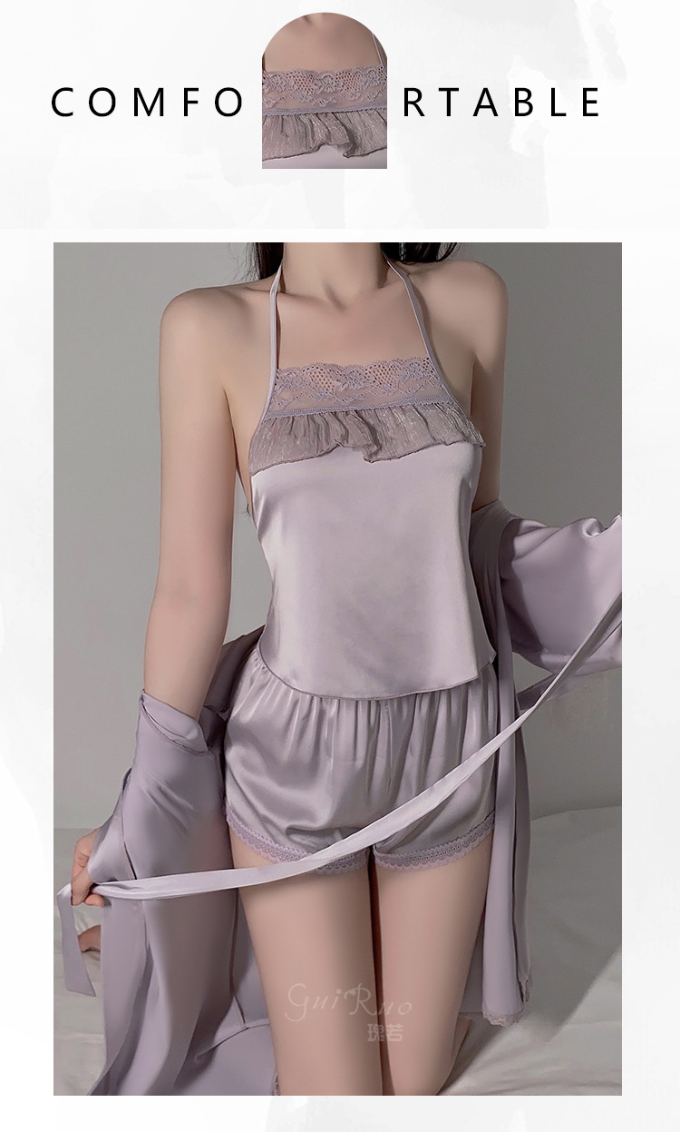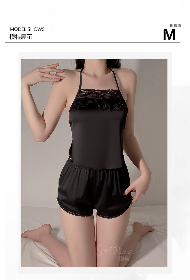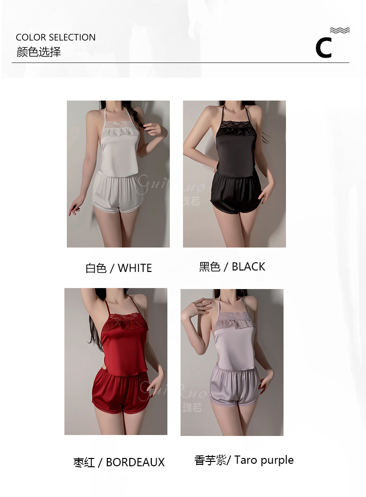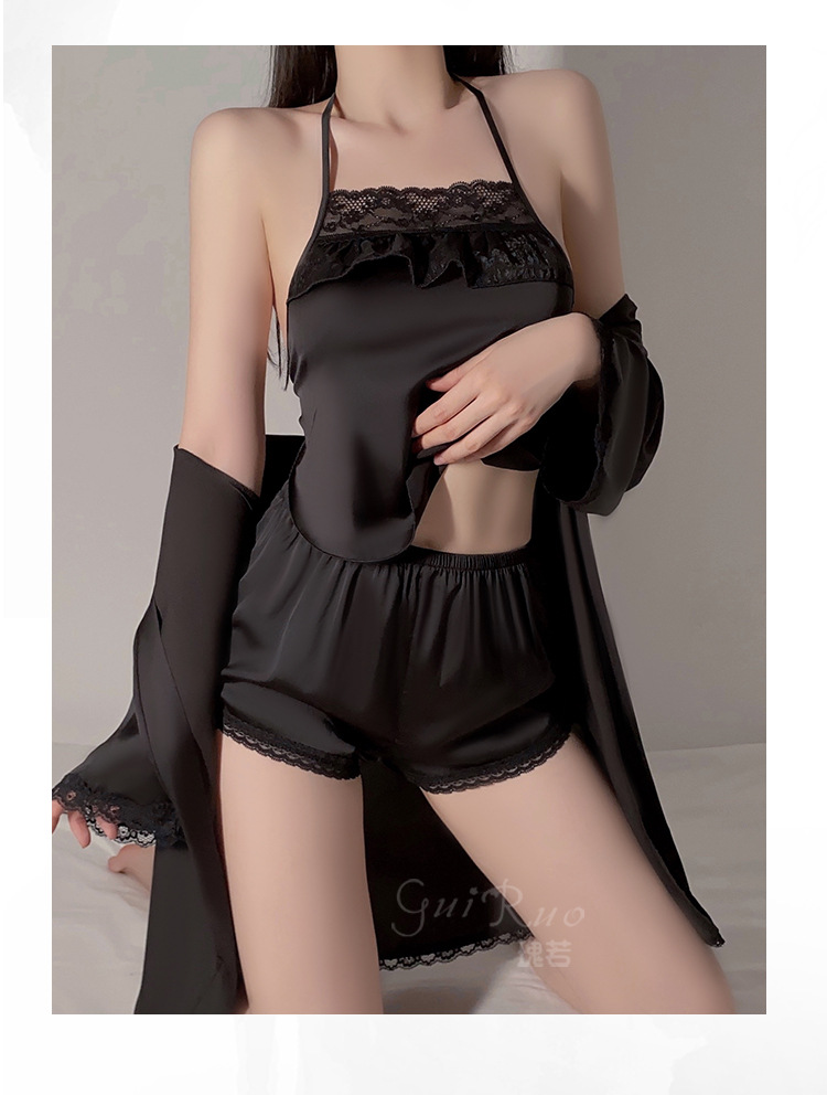 LPLT6319100092 絲滑緞面性感掛脖系帶蕾絲拼接肚兜短褲外袍女家居服套裝