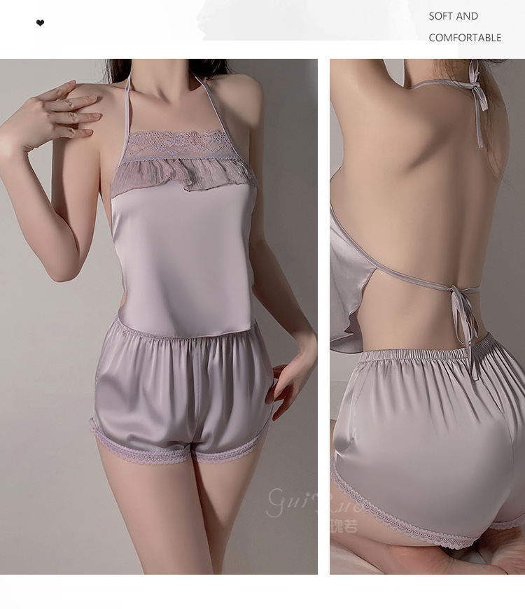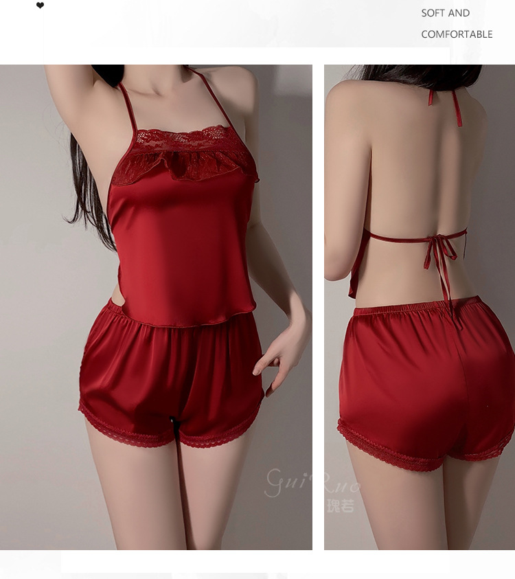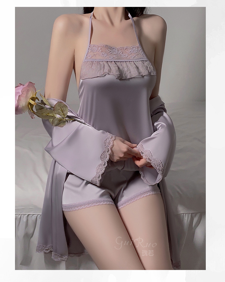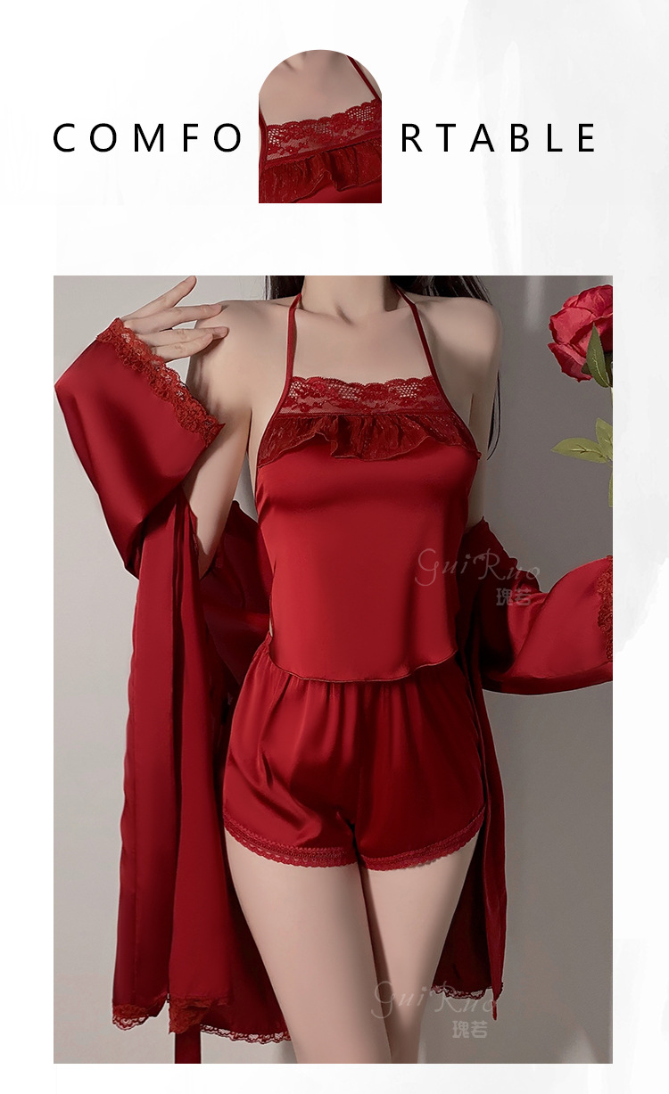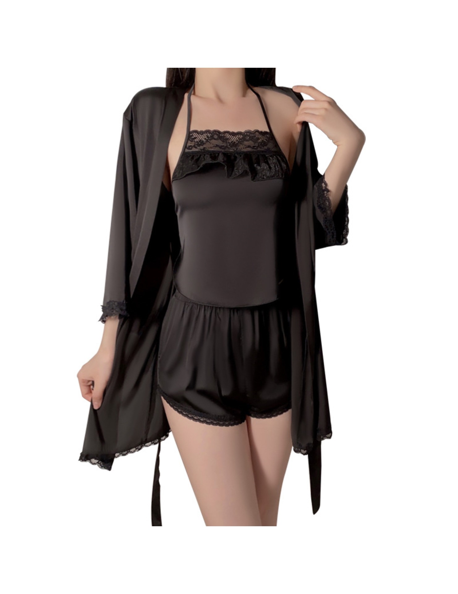 LPLT6319100092 絲滑緞面性感掛脖系帶蕾絲拼接肚兜短褲外袍女家居服套裝