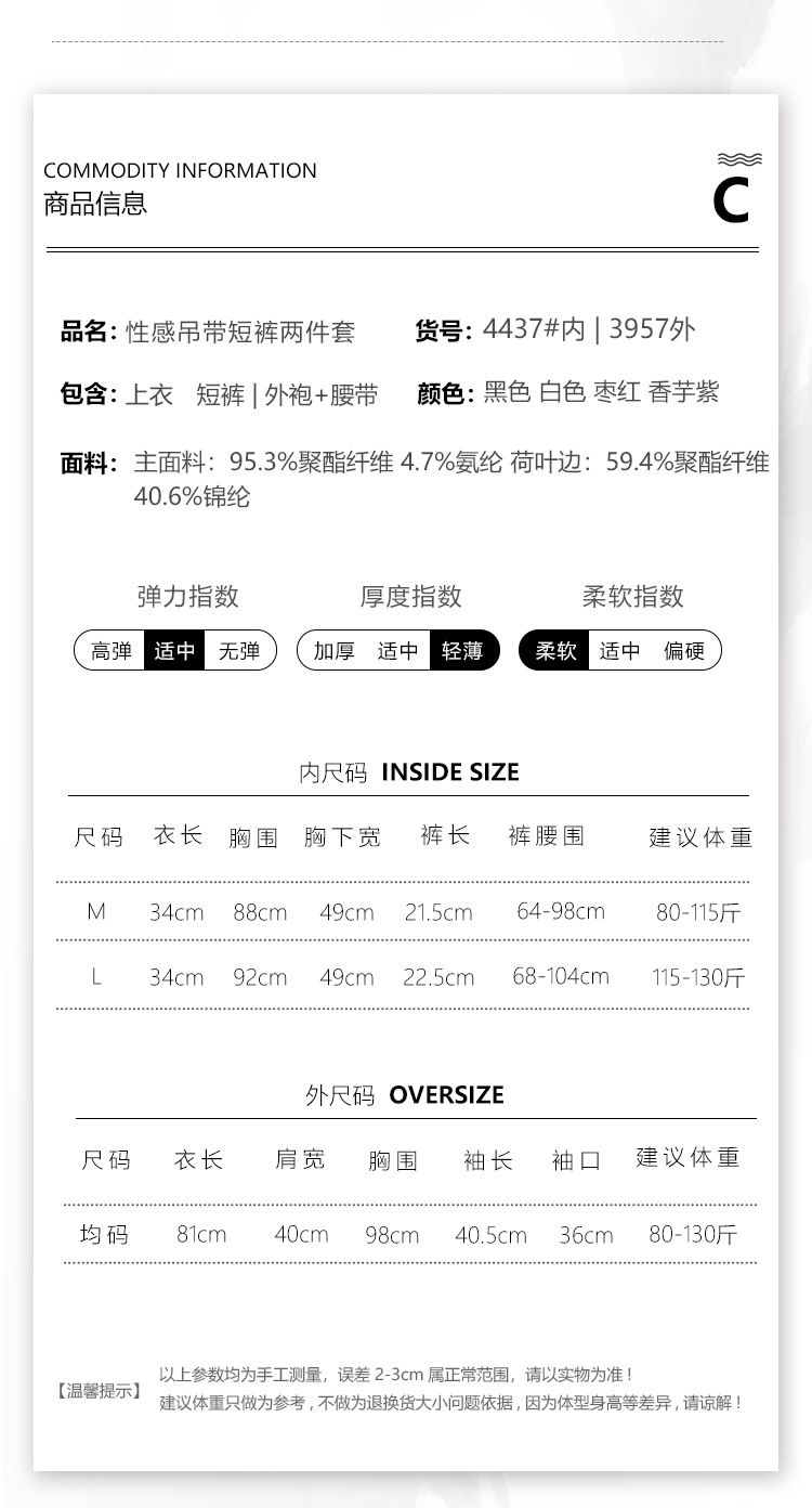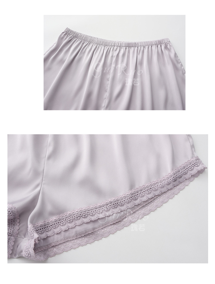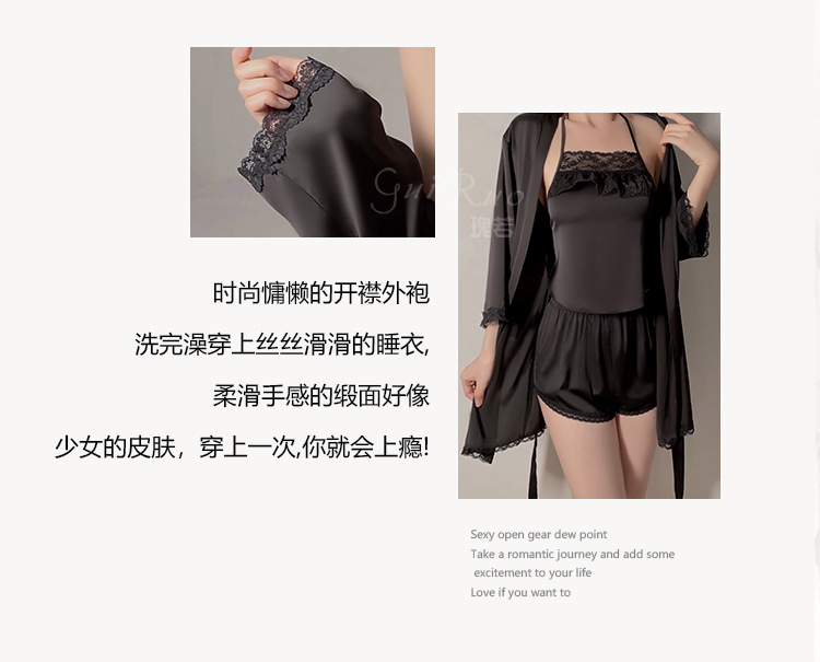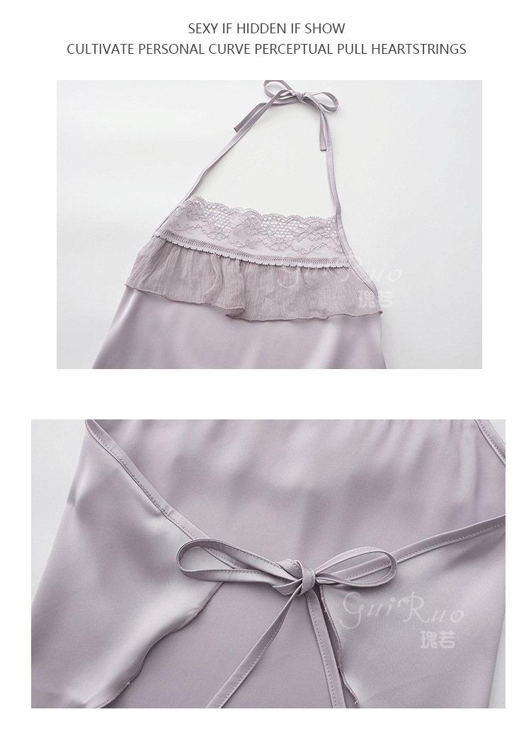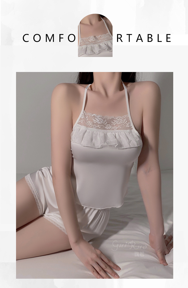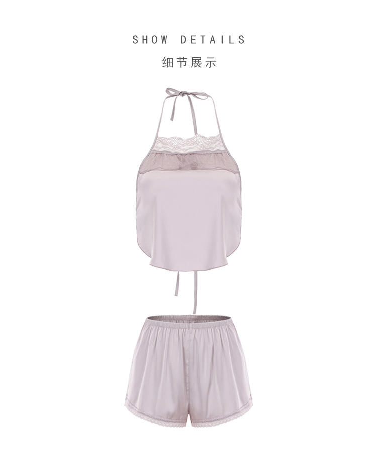 LPLT6319100092 絲滑緞面性感掛脖系帶蕾絲拼接肚兜短褲外袍女家居服套裝