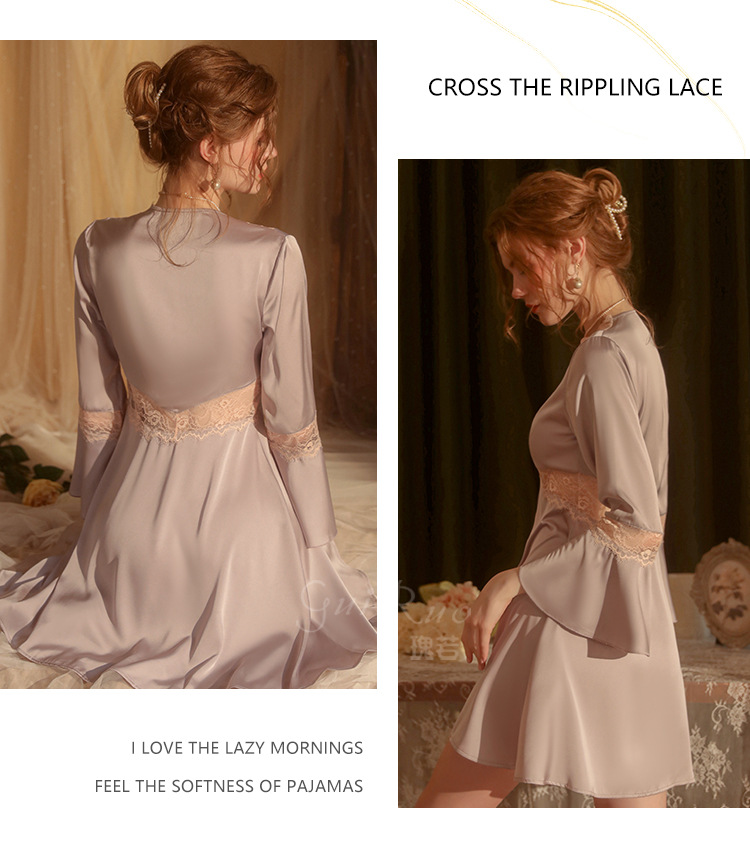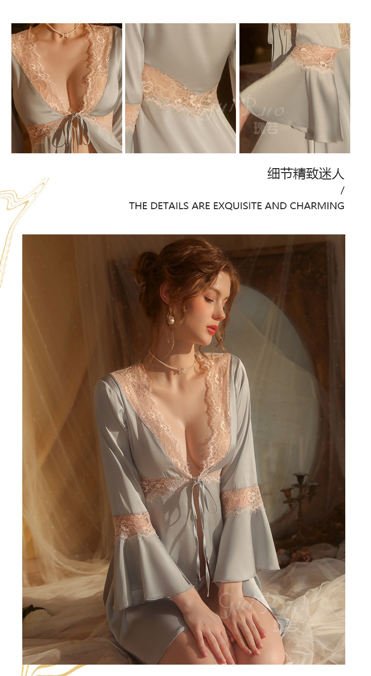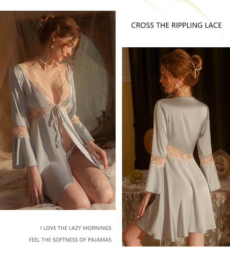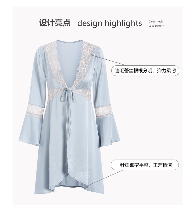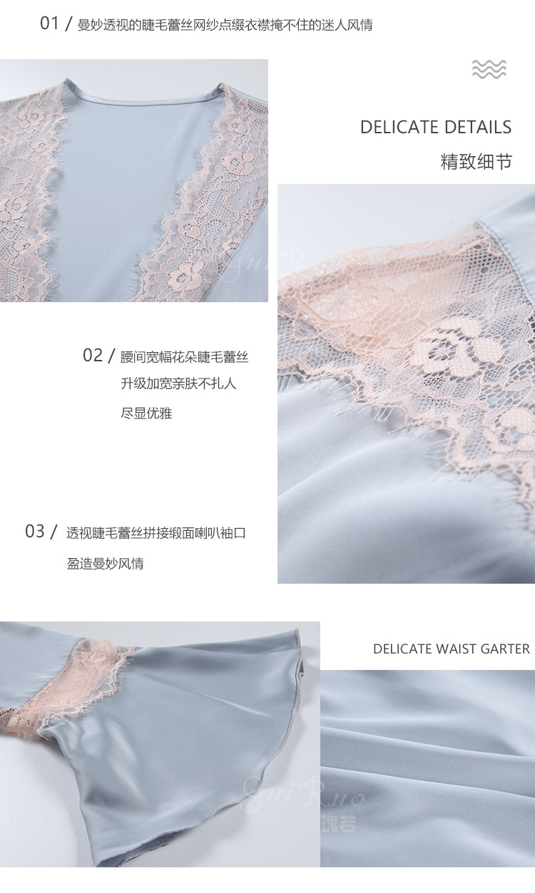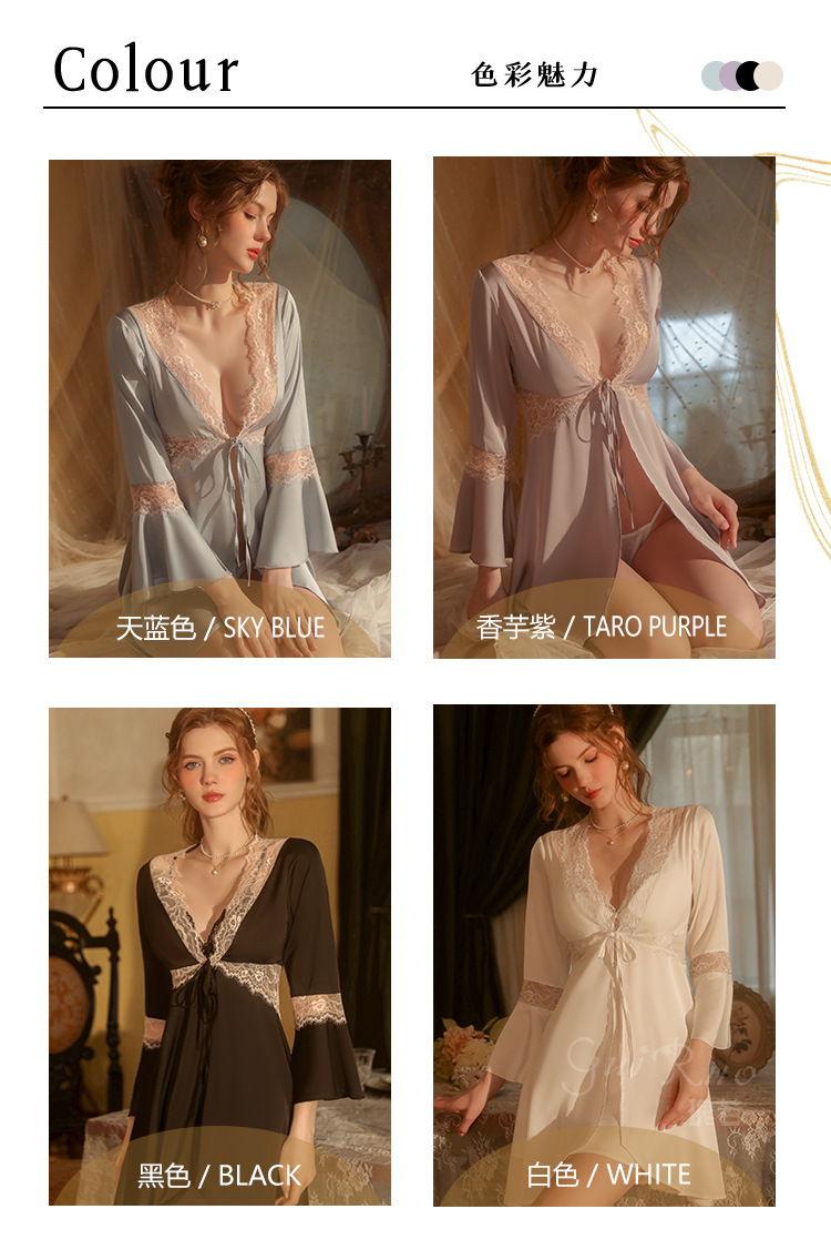 LPLT6319100099 春夏新款純色睡衣甜美蕾絲開衫系帶外袍浴袍女家居服套裝