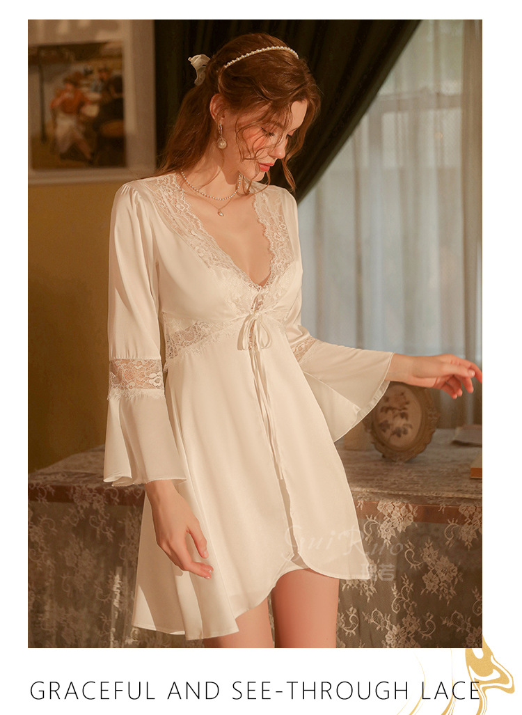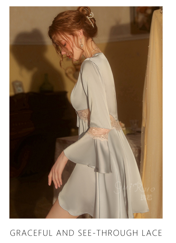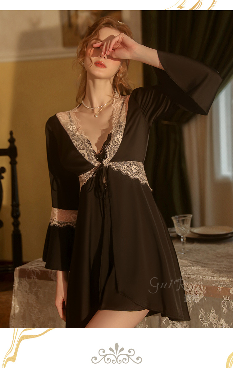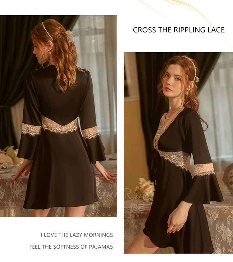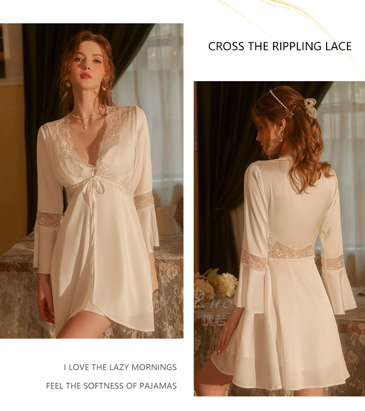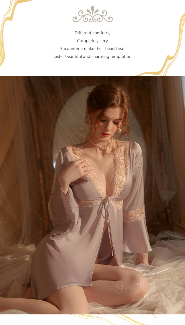 LPLT6319100099 春夏新款純色睡衣甜美蕾絲開衫系帶外袍浴袍女家居服套裝