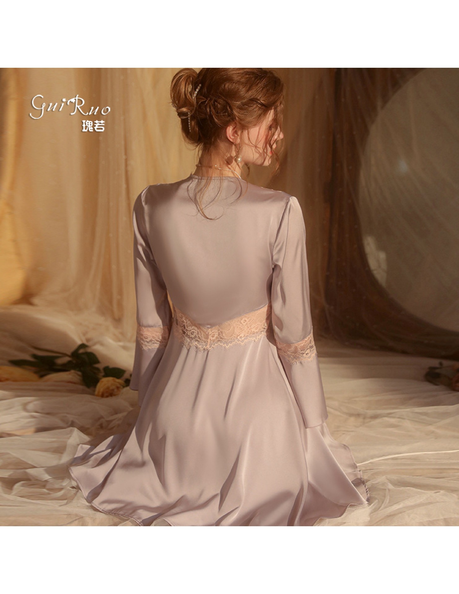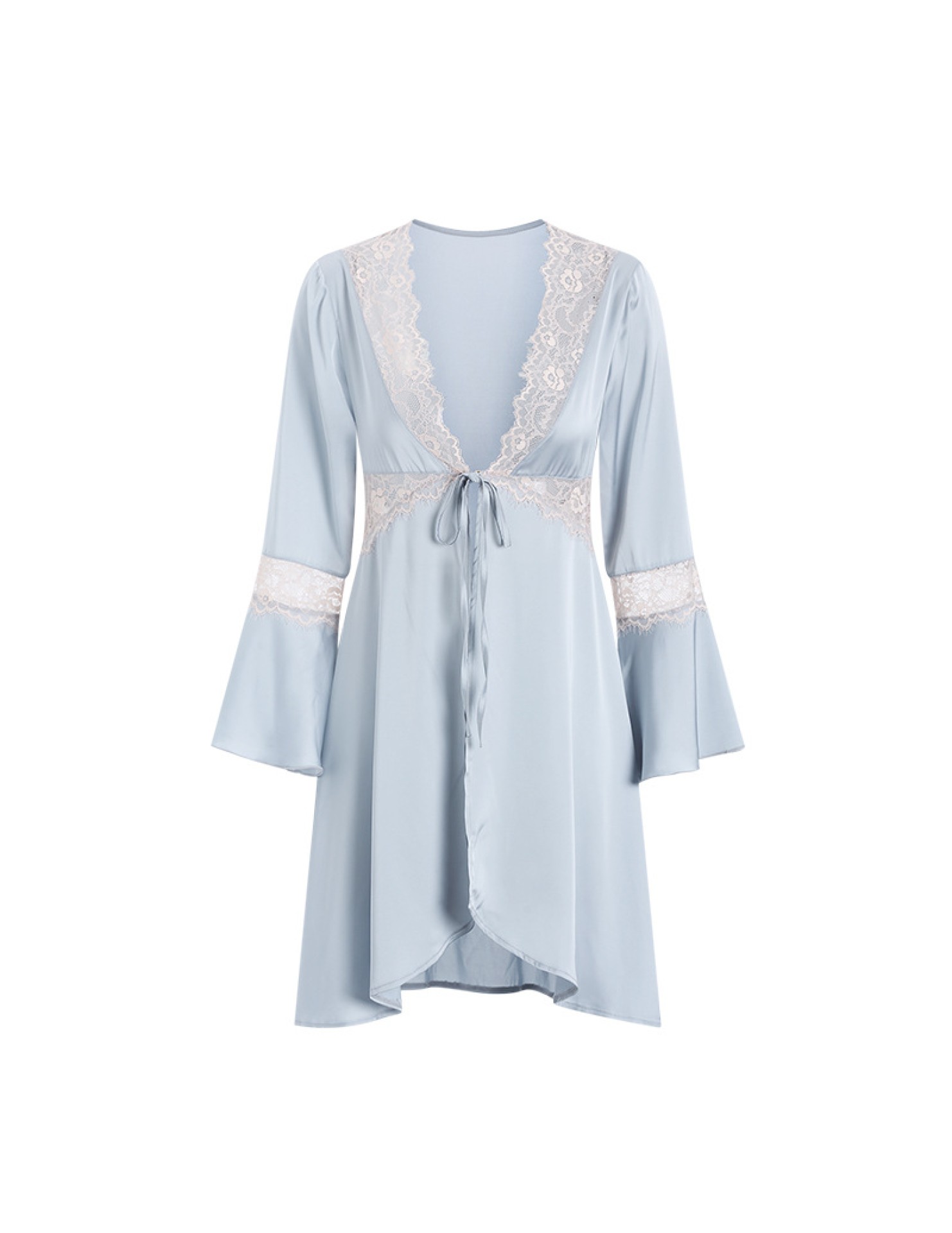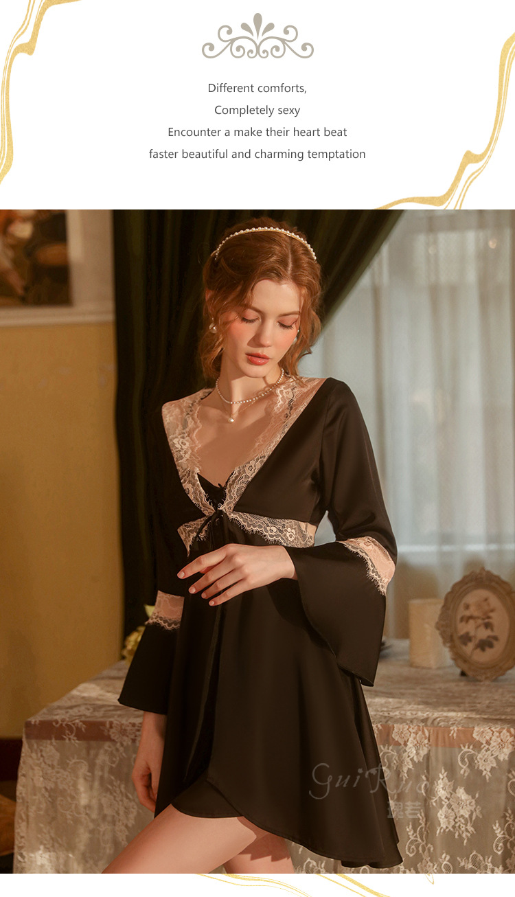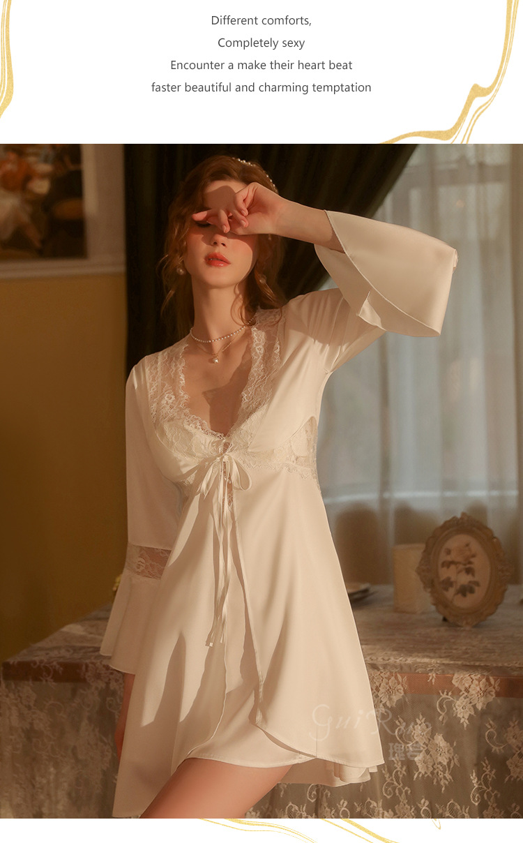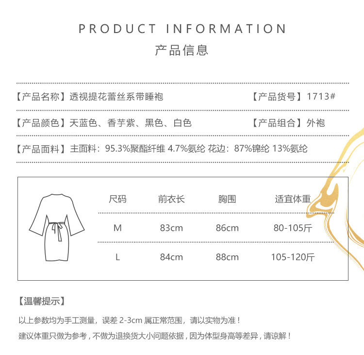 LPLT6319100099 春夏新款純色睡衣甜美蕾絲開衫系帶外袍浴袍女家居服套裝
