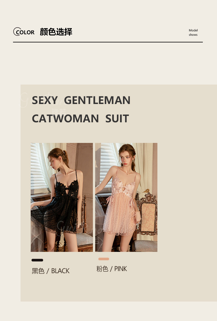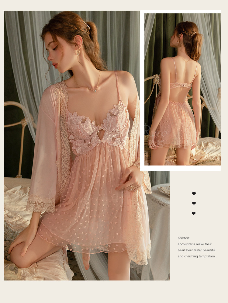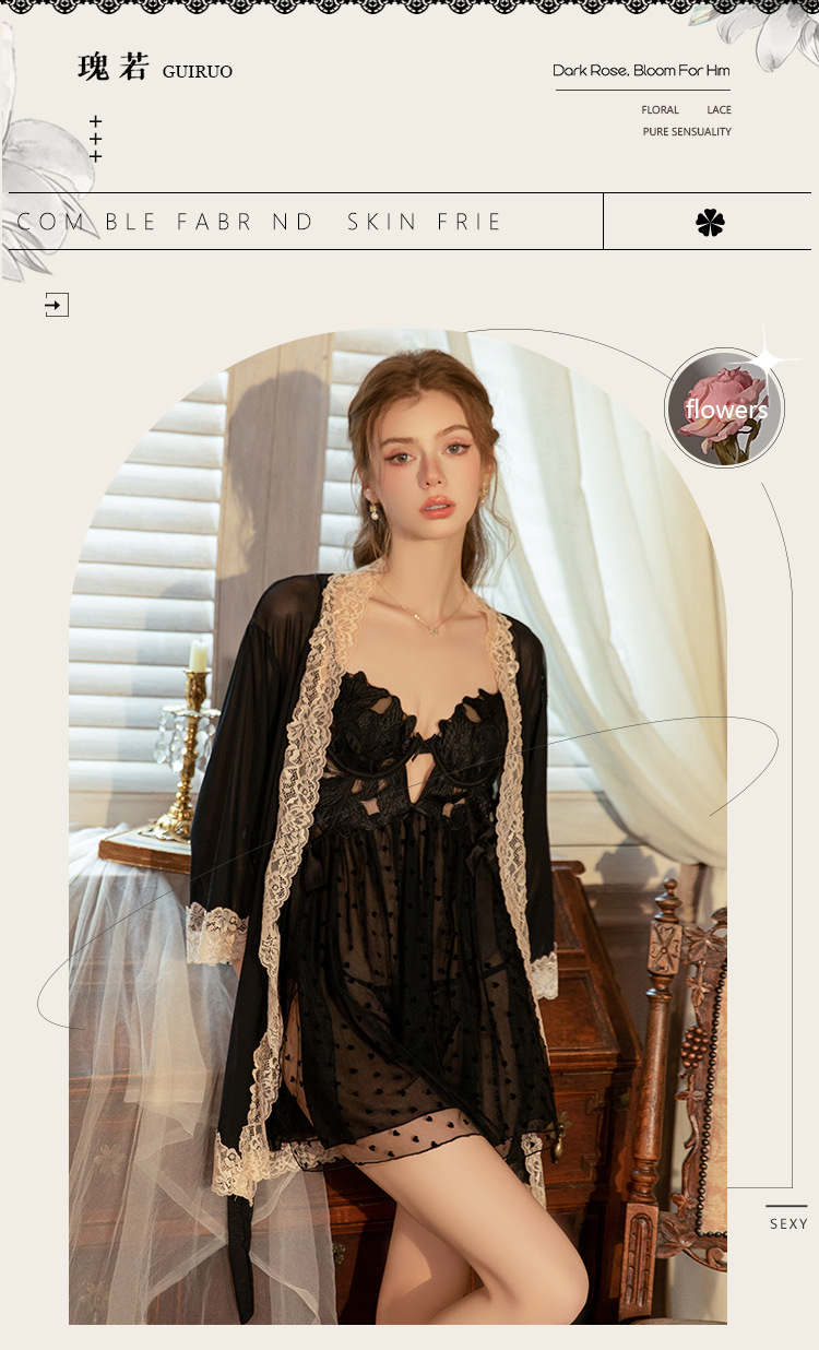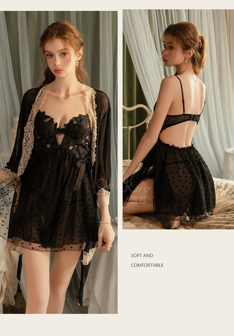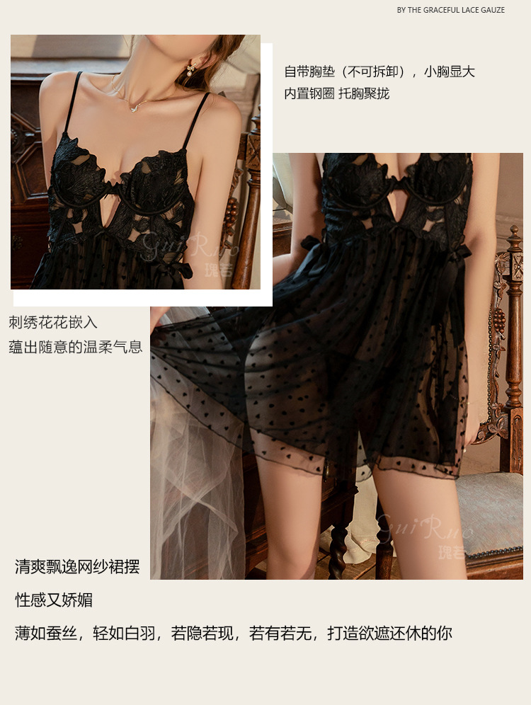 LPLT6319100101 情趣內衣純欲網紗刺繡鋼圈聚攏胸墊側開衩睡裙外袍套裝