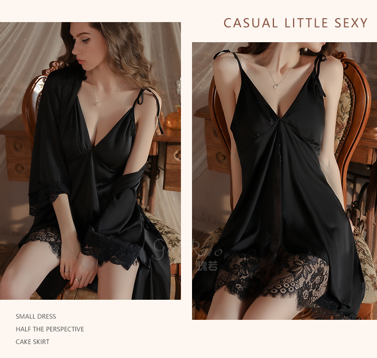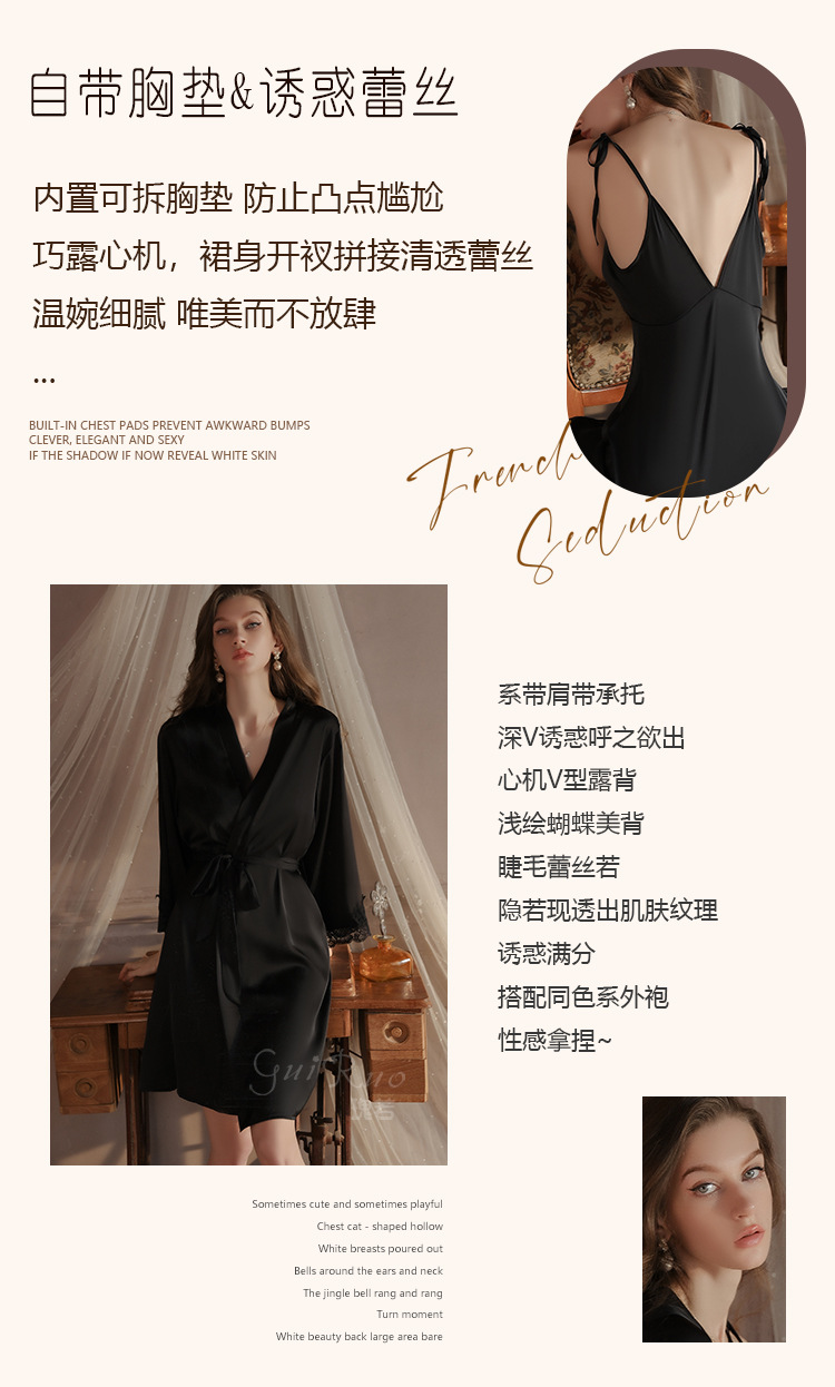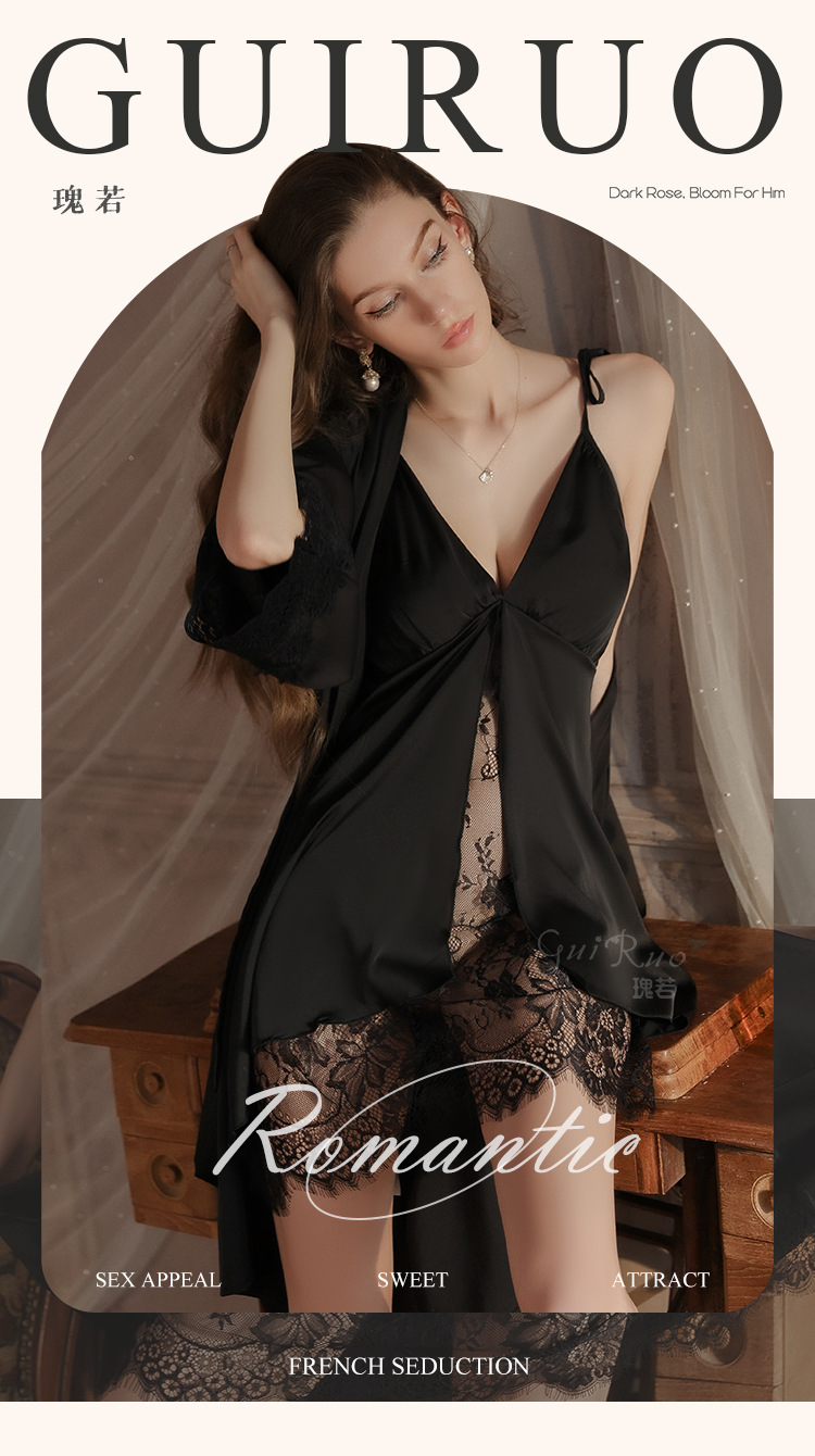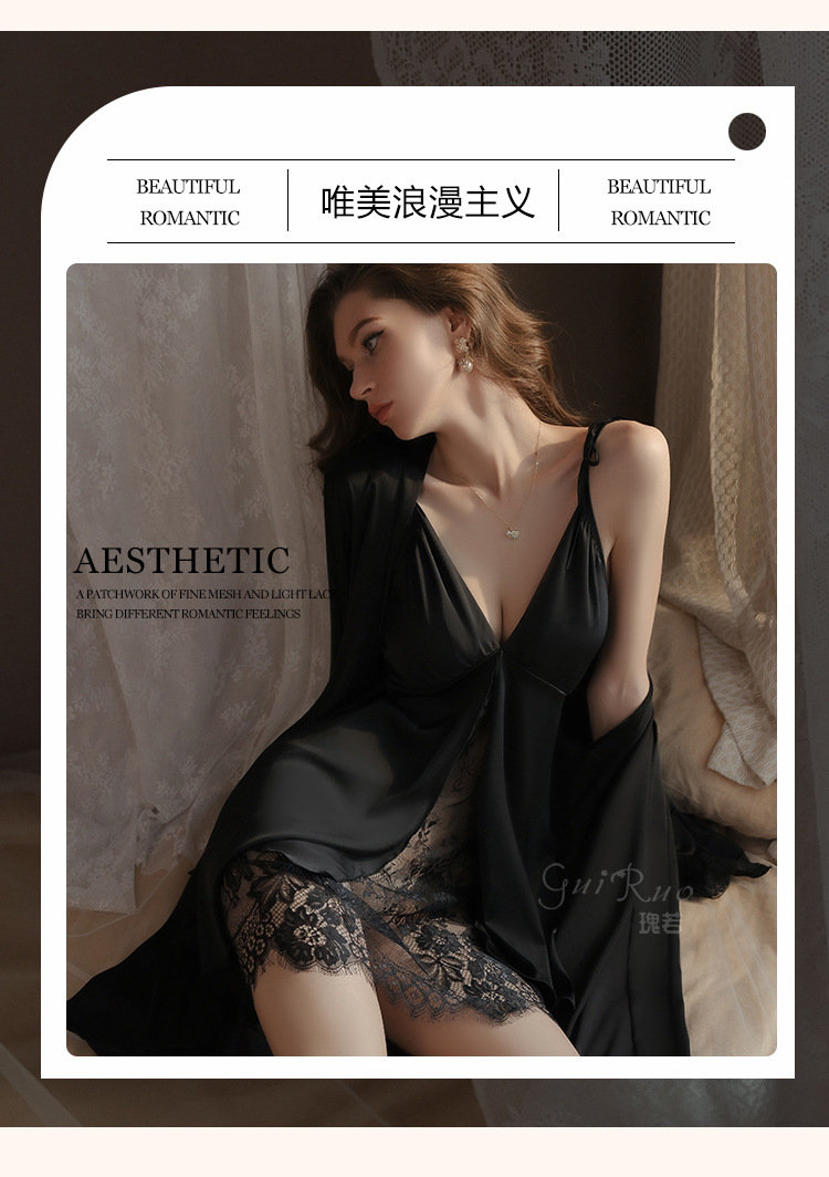 LPLT6319100102 深V聚攏加胸墊睡衣純欲開衩網紗蕾絲女吊帶睡裙外袍套裝