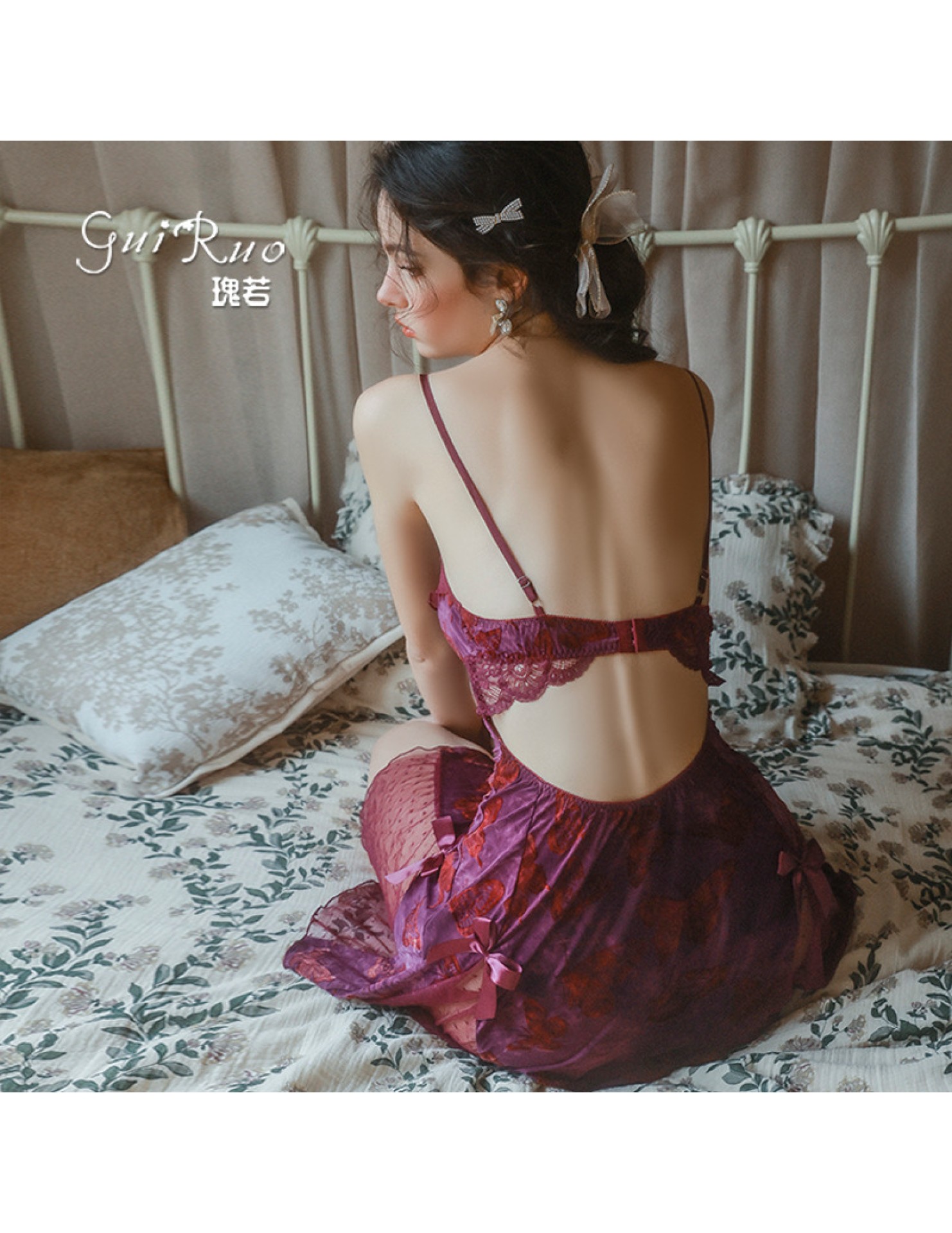 LPLT6319100110 內衣甜美蝴蝶印花火辣露背深V加胸墊睡裙外袍女套裝