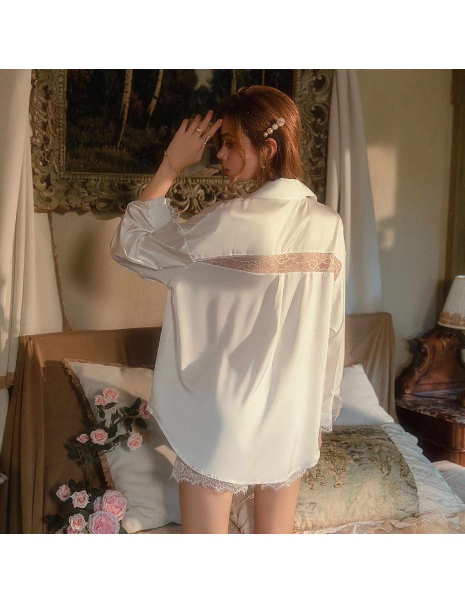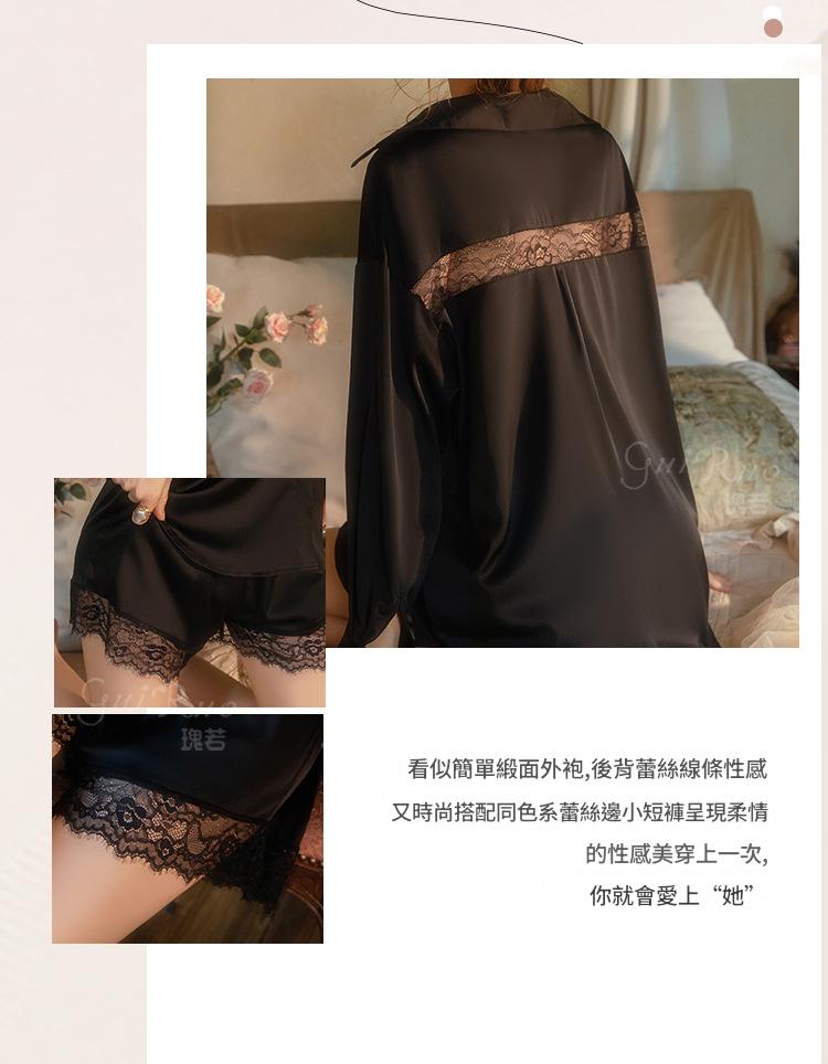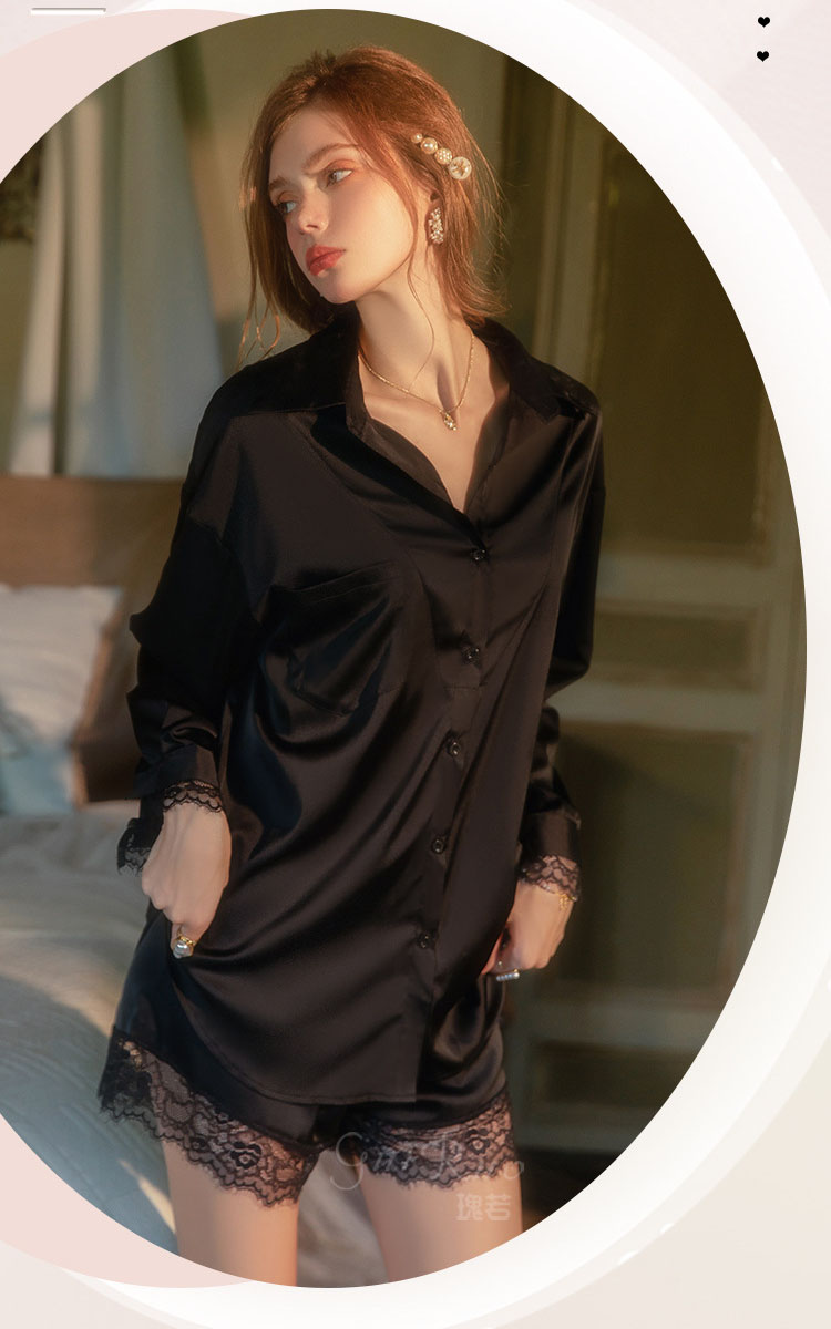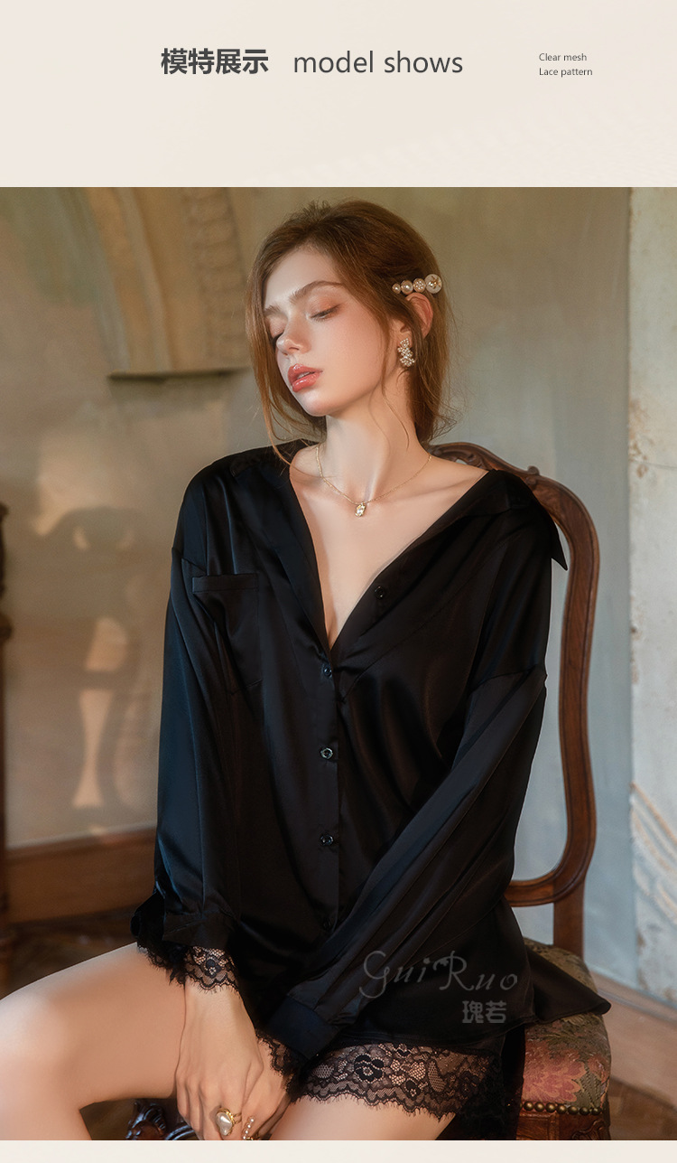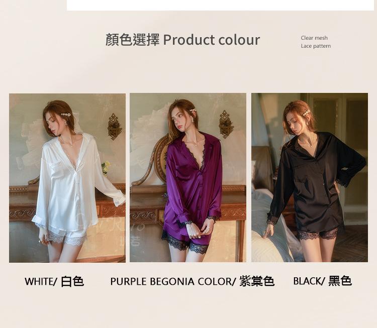 LPLT6319100117 火辣低胸開襟透視鏤空男友風襯衫絲滑緞面睡裙家居套裝