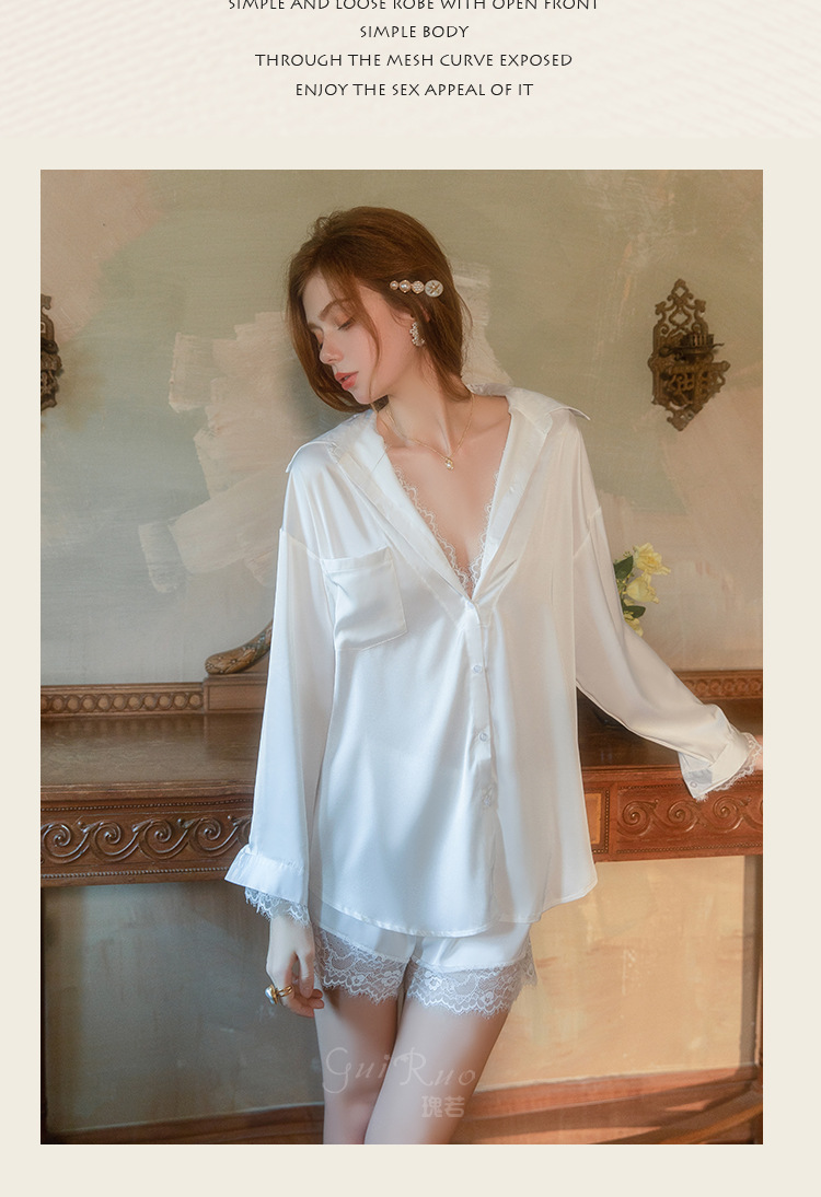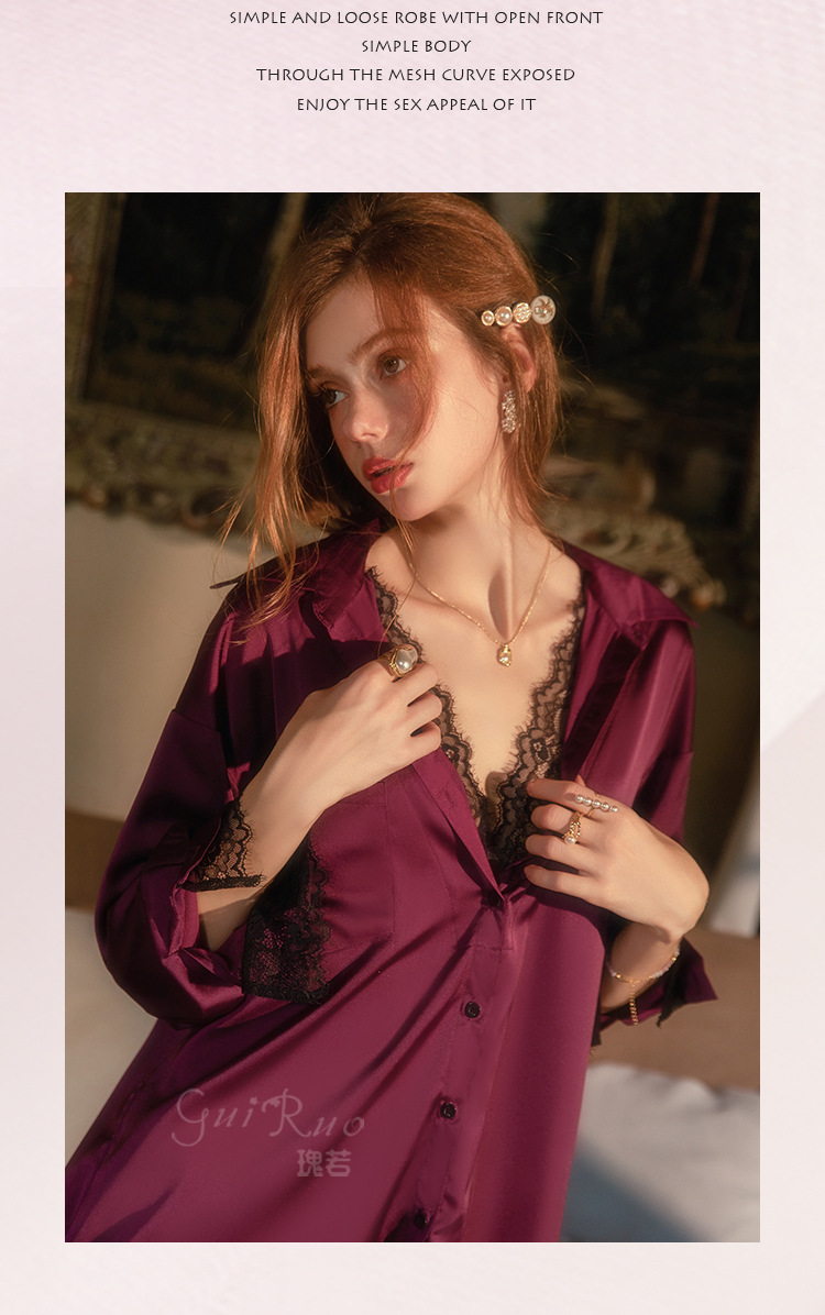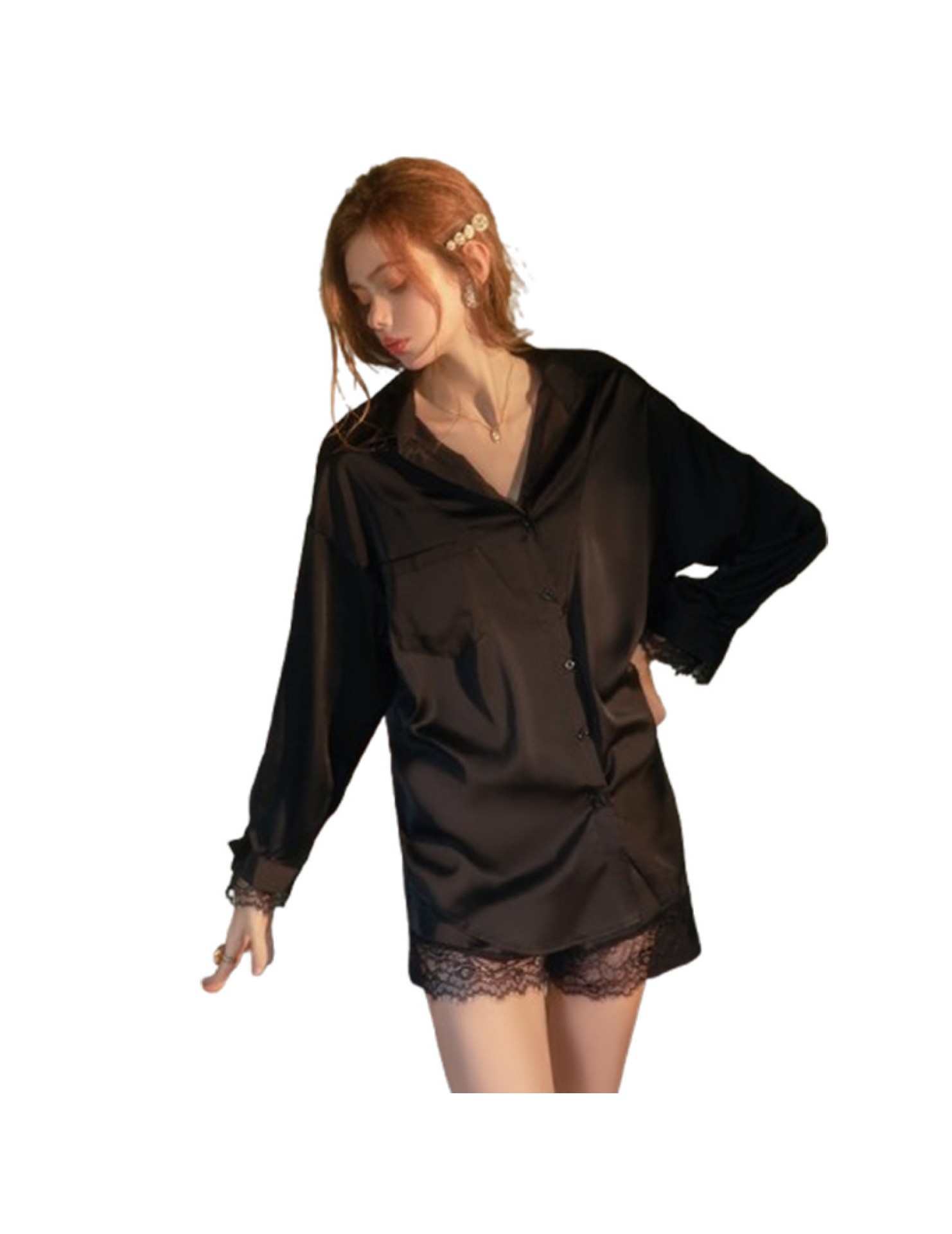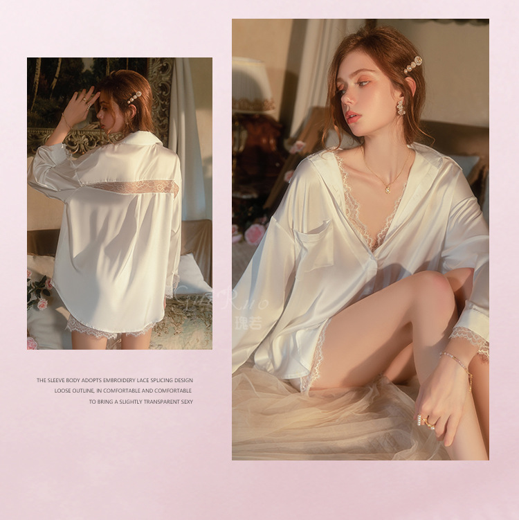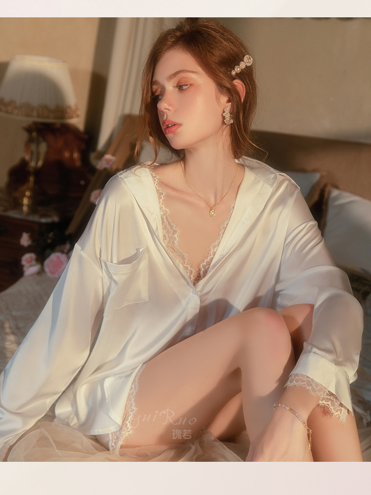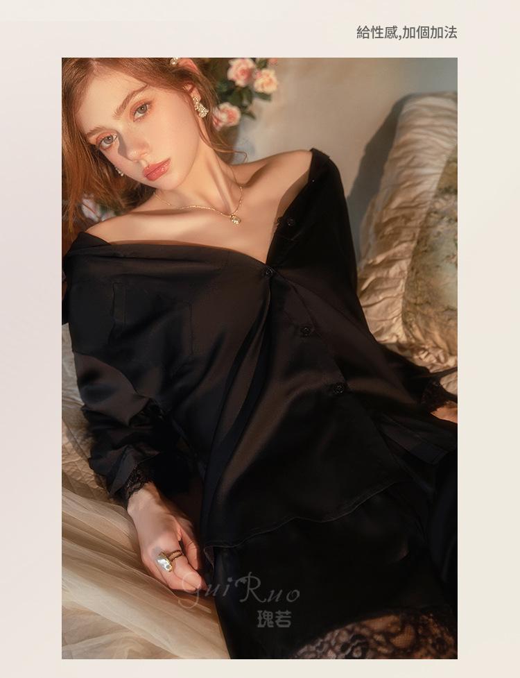 LPLT6319100117 火辣低胸開襟透視鏤空男友風襯衫絲滑緞面睡裙家居套裝