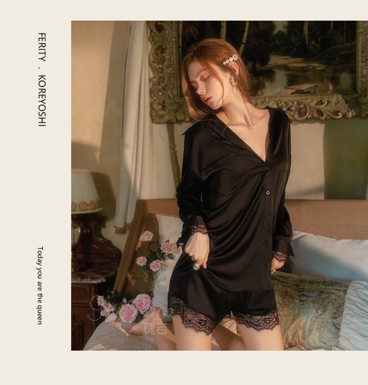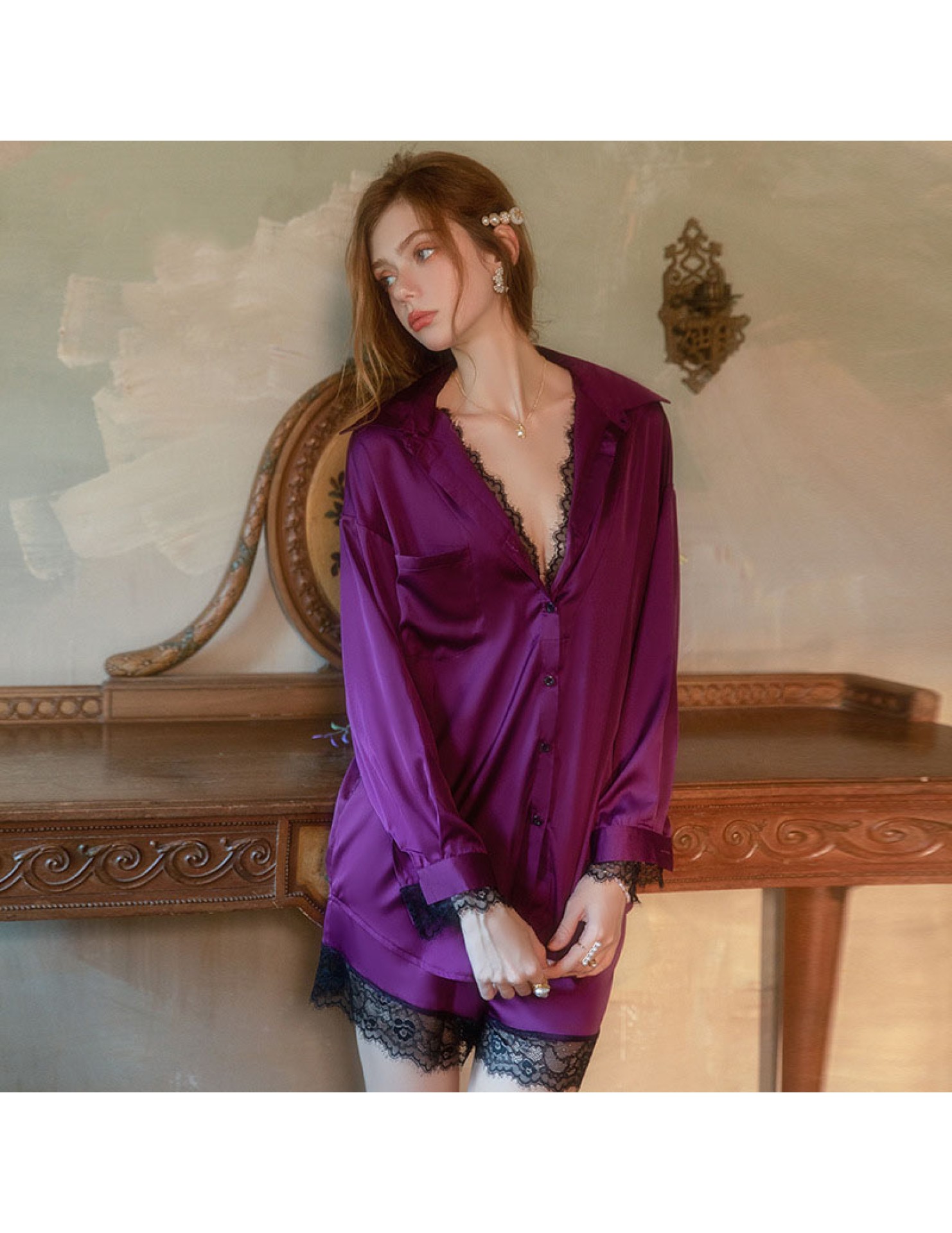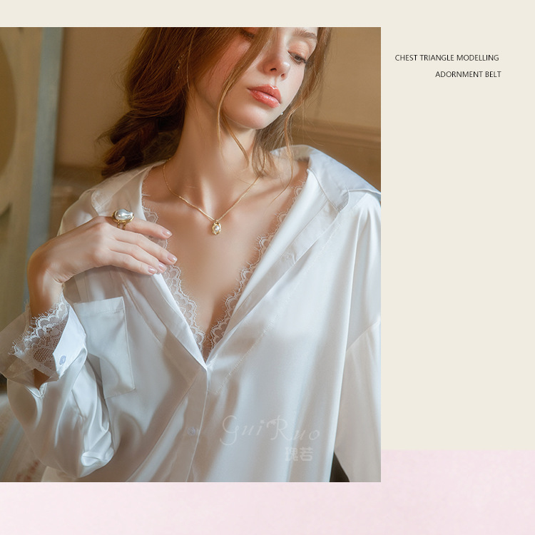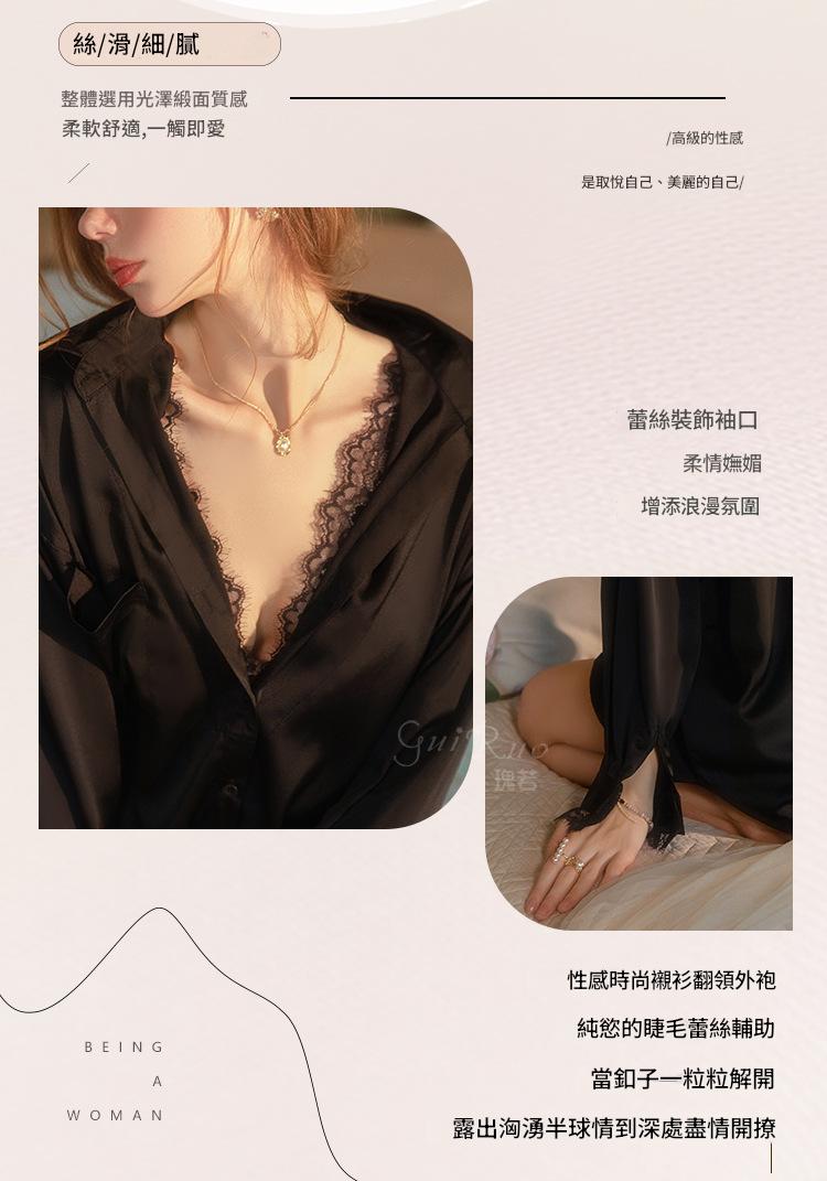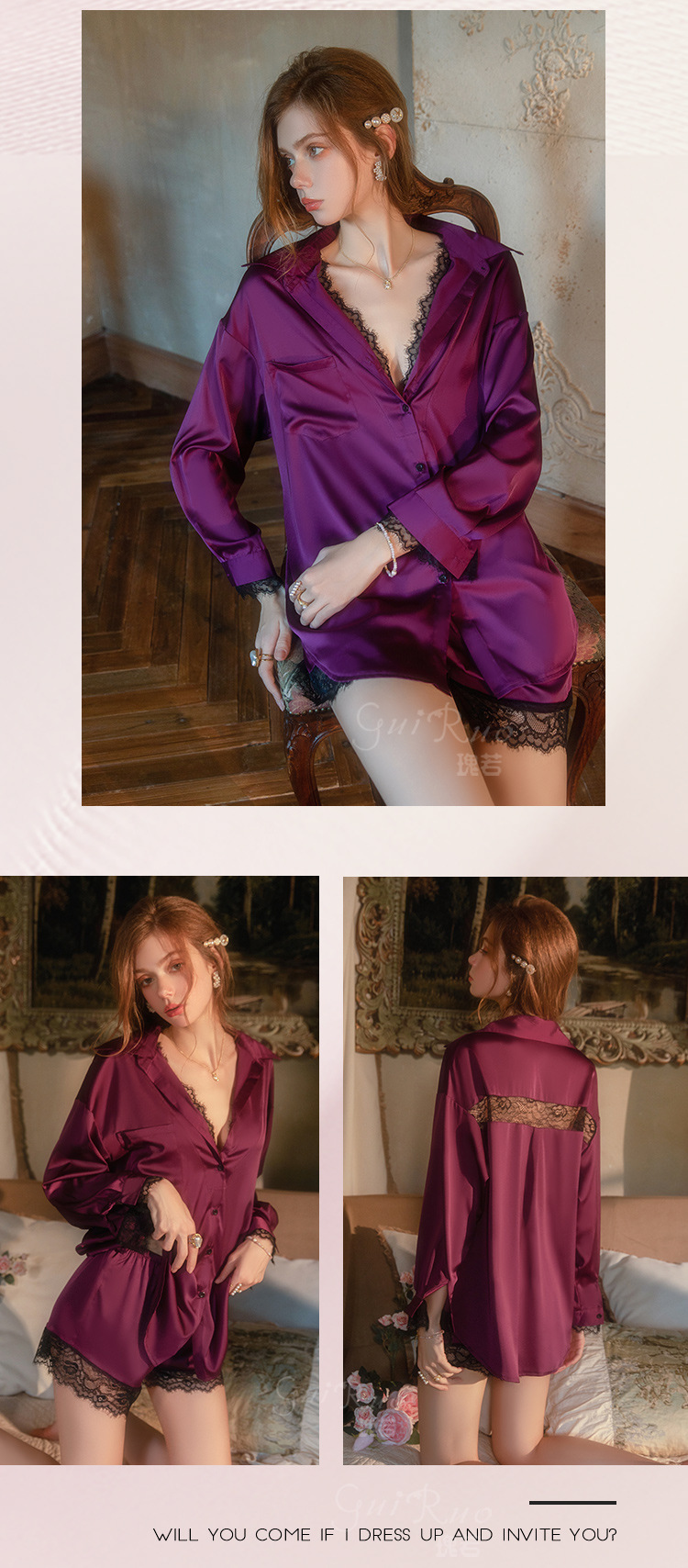 LPLT6319100117 火辣低胸開襟透視鏤空男友風襯衫絲滑緞面睡裙家居套裝