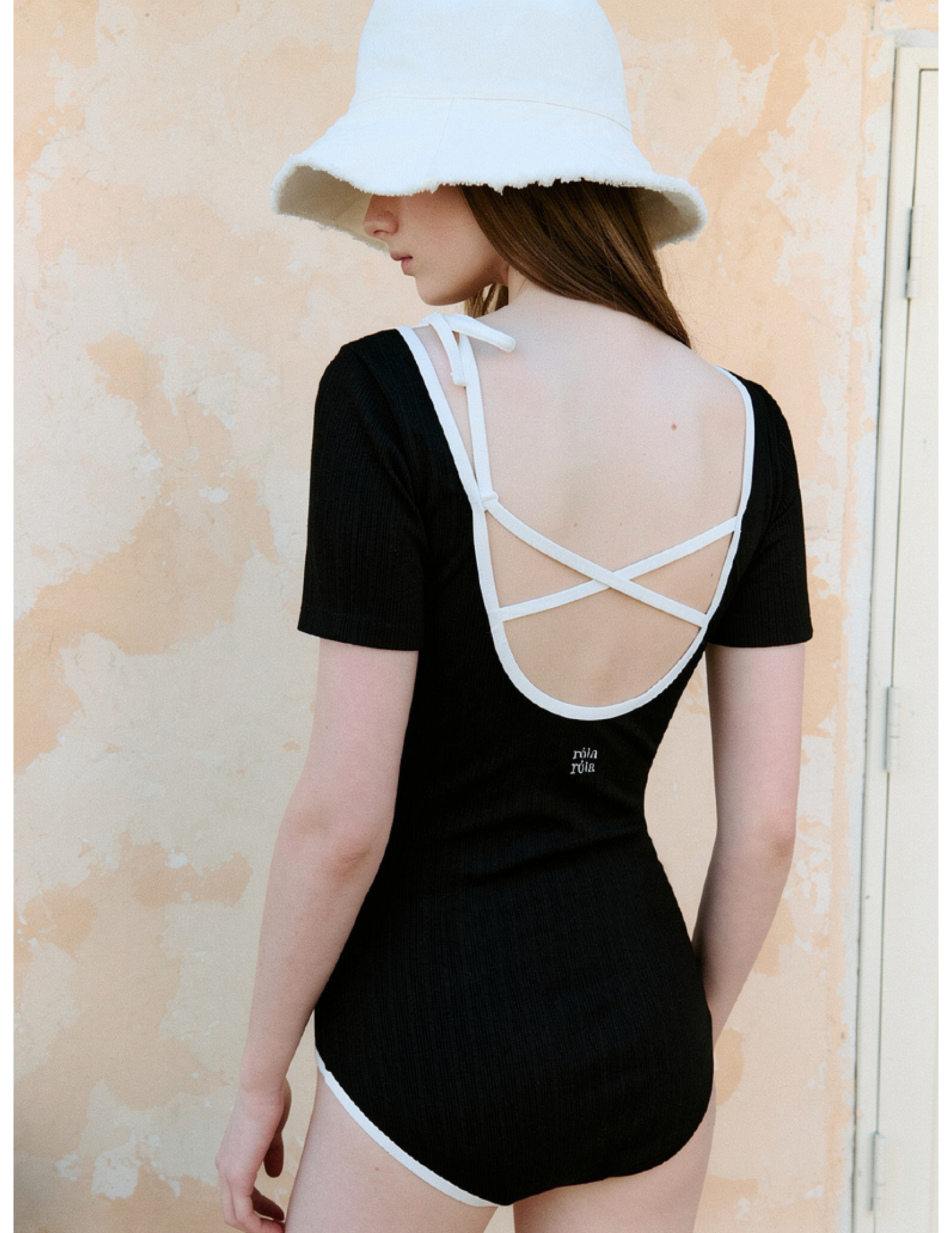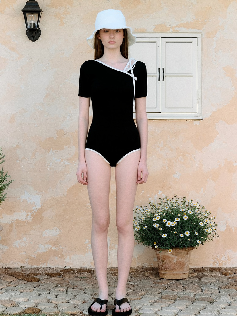 HSPN64061100005 新中式斜肩豆扣露背綁帶連體泳衣女短袖修身帶胸墊