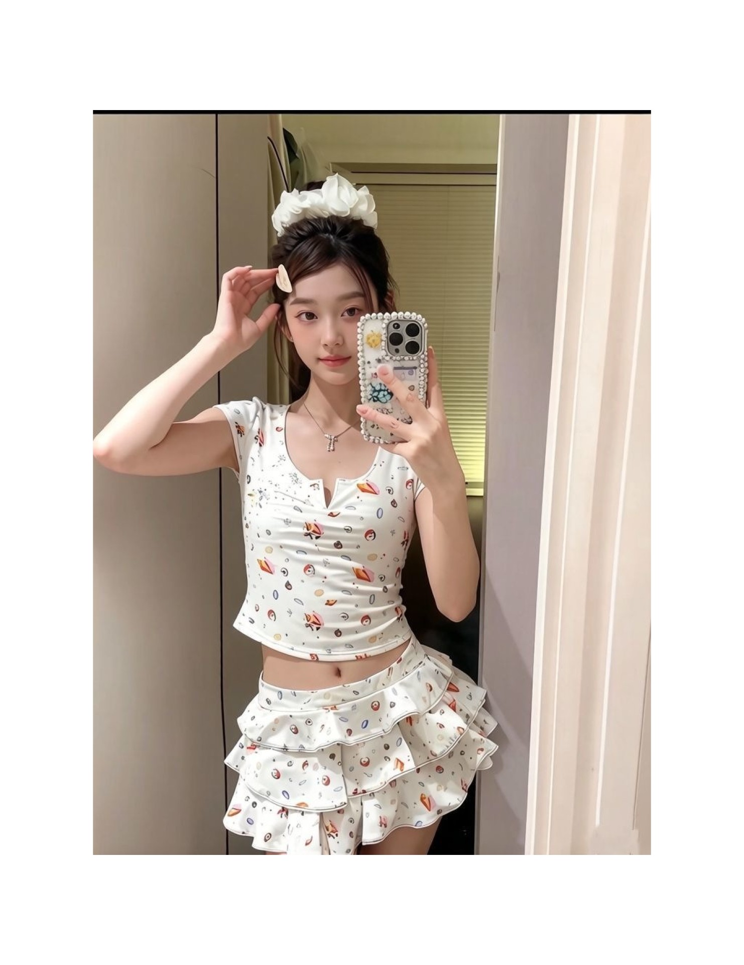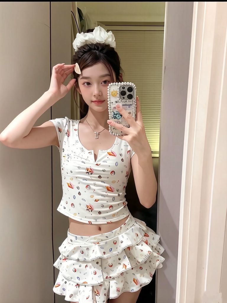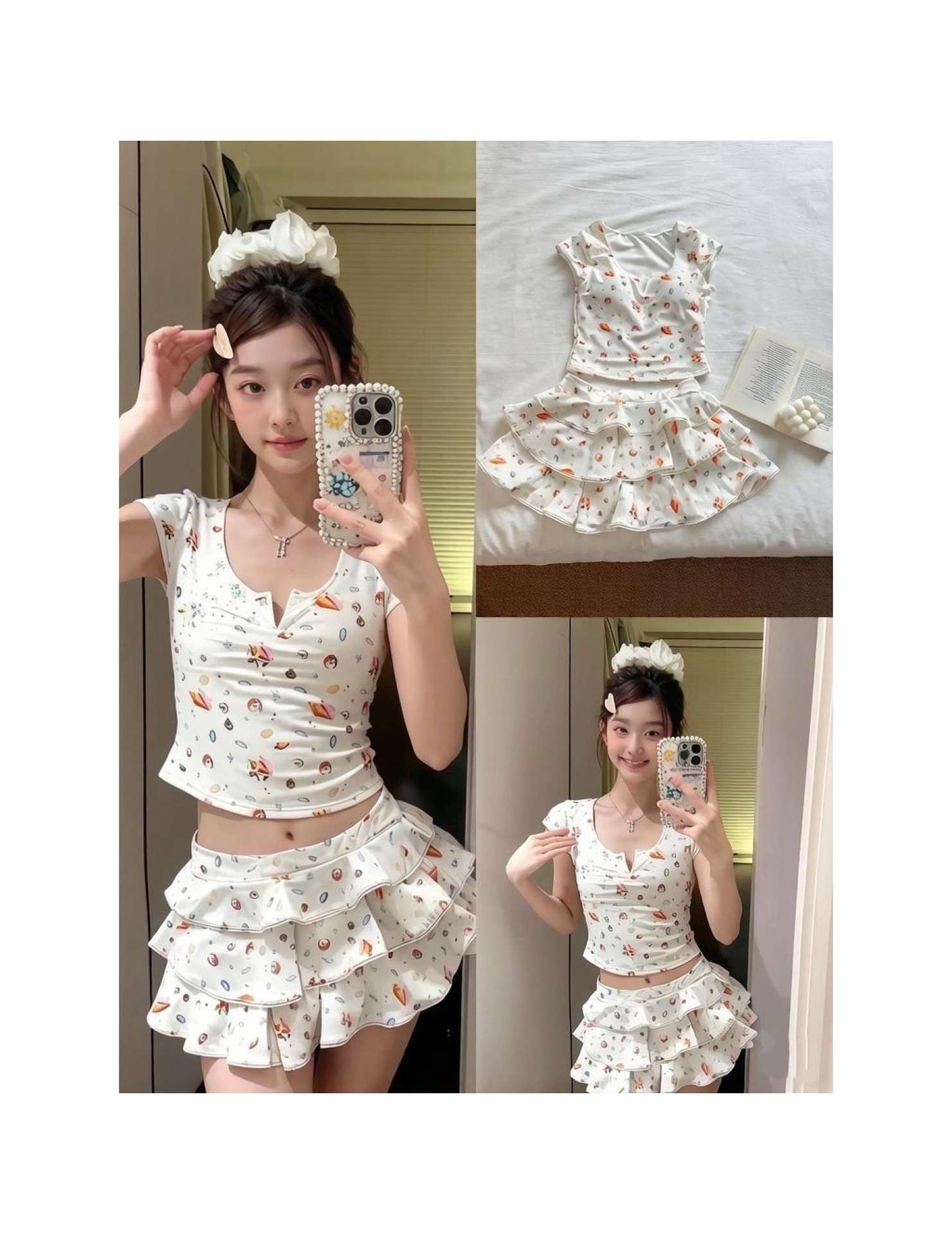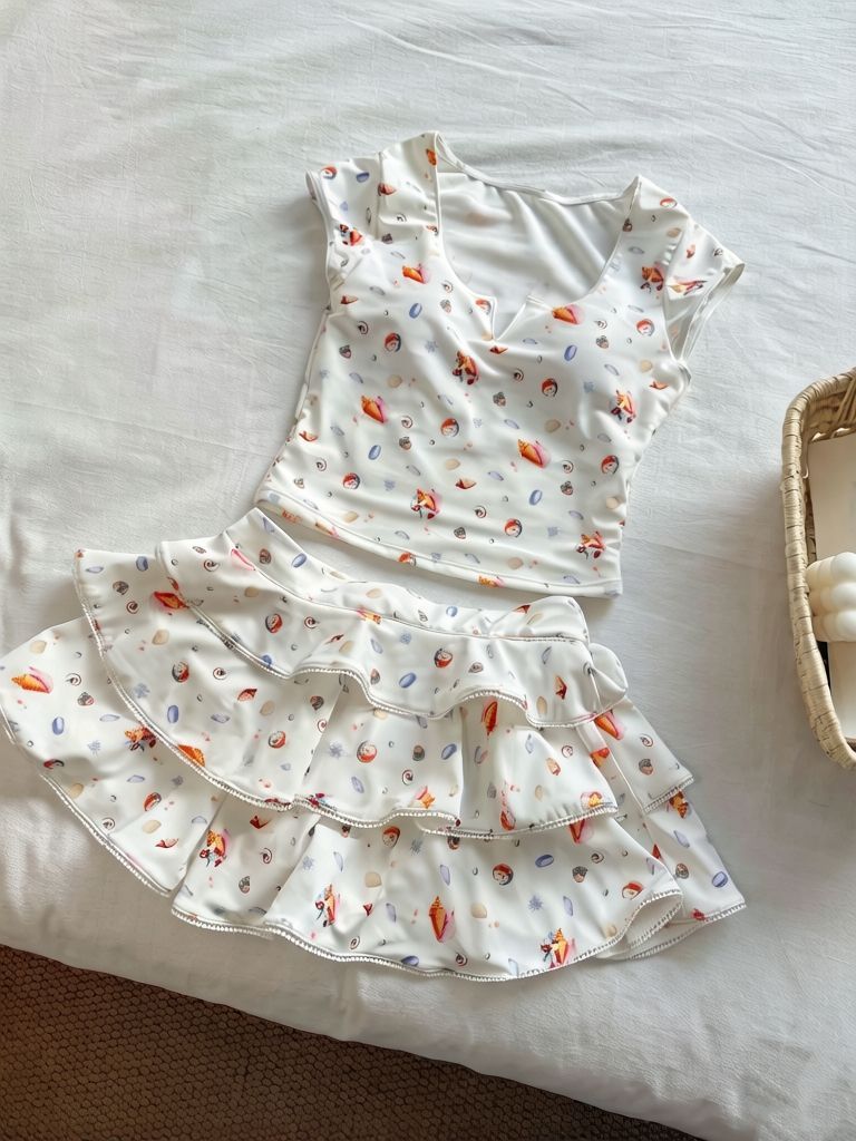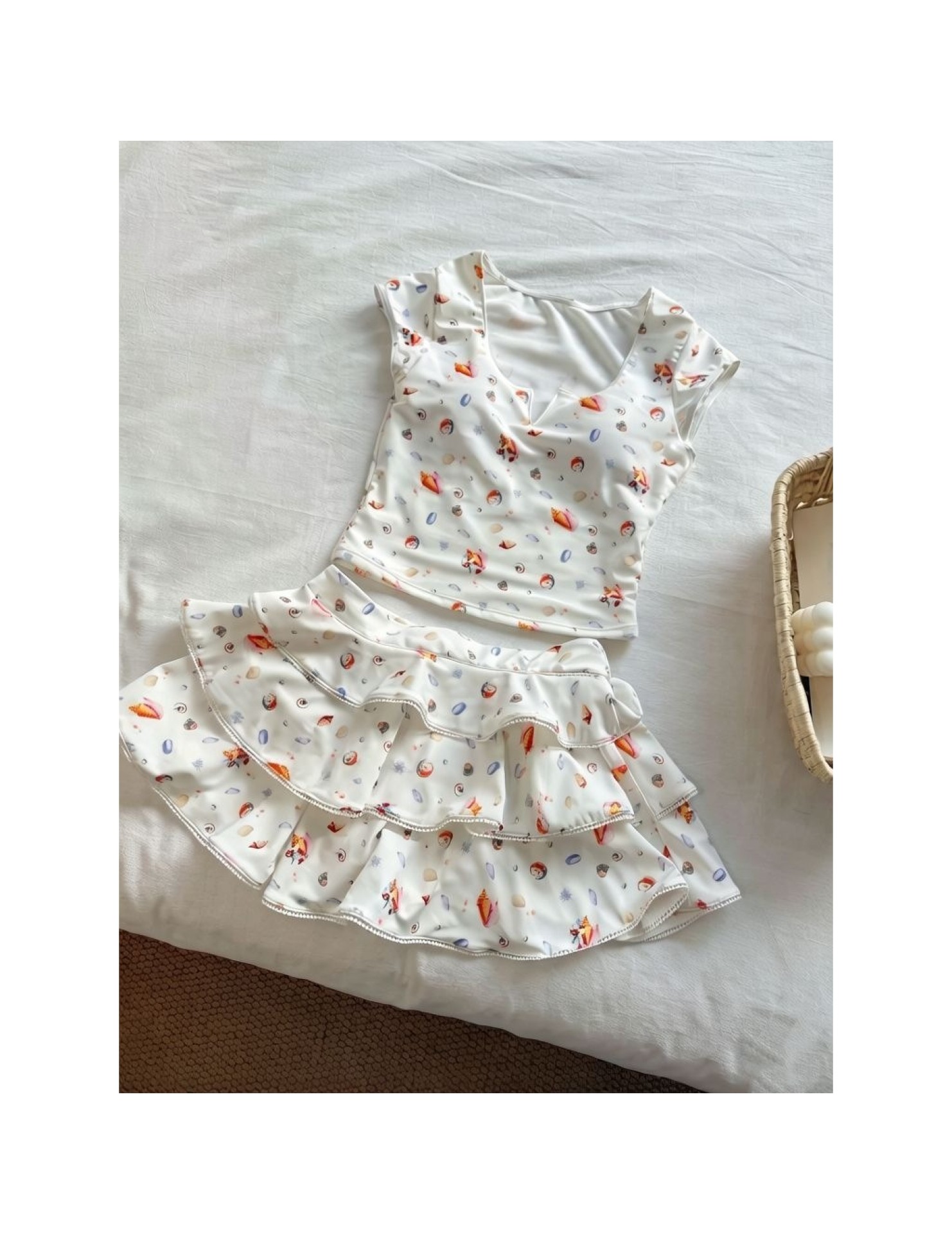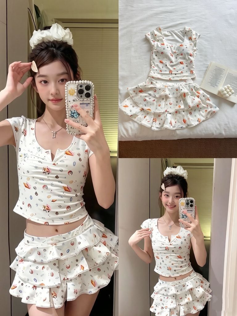 HSPN64061100006 貝殼印花正肩V領蛋糕半裙分體泳衣小心機搭配度假溫泉超出片