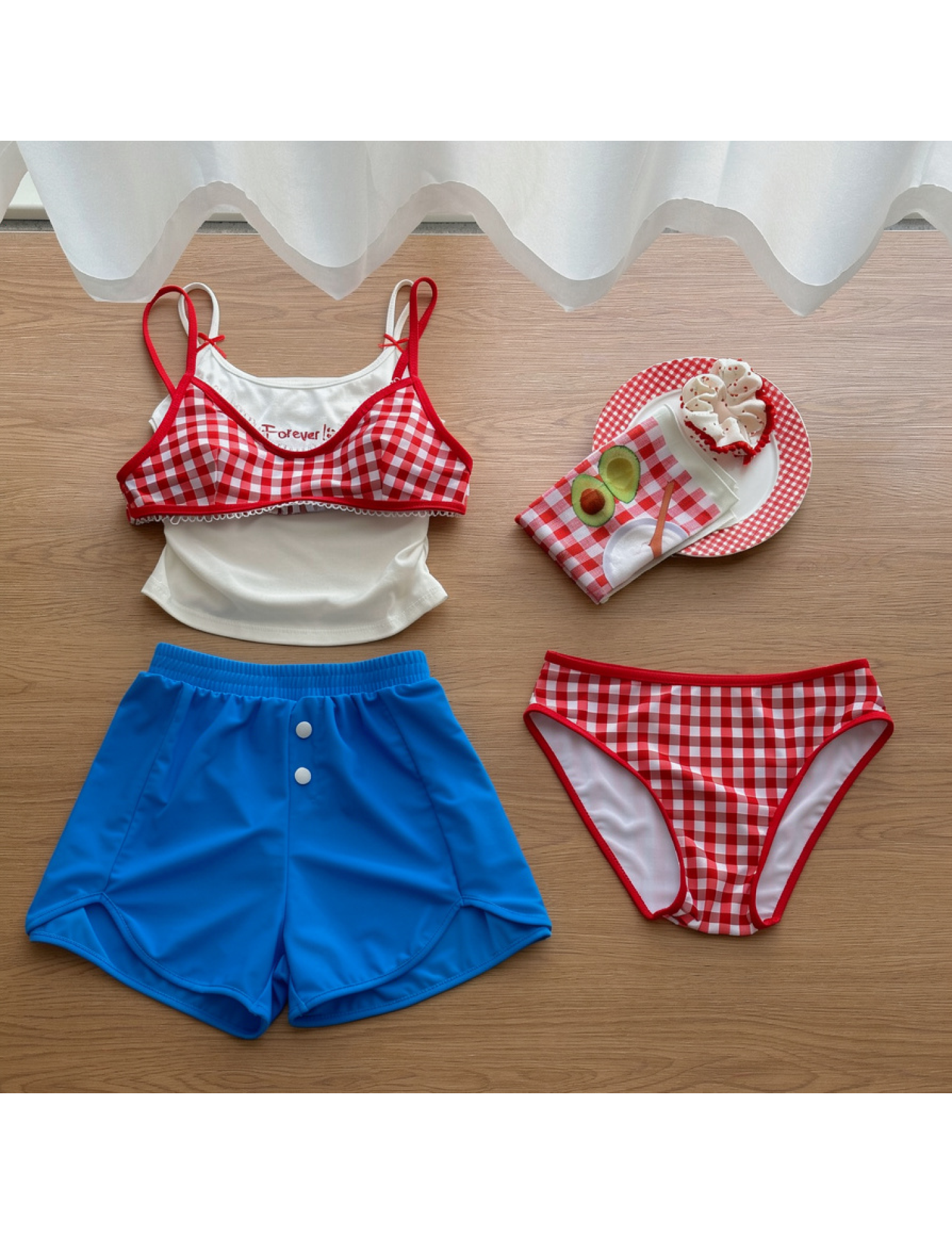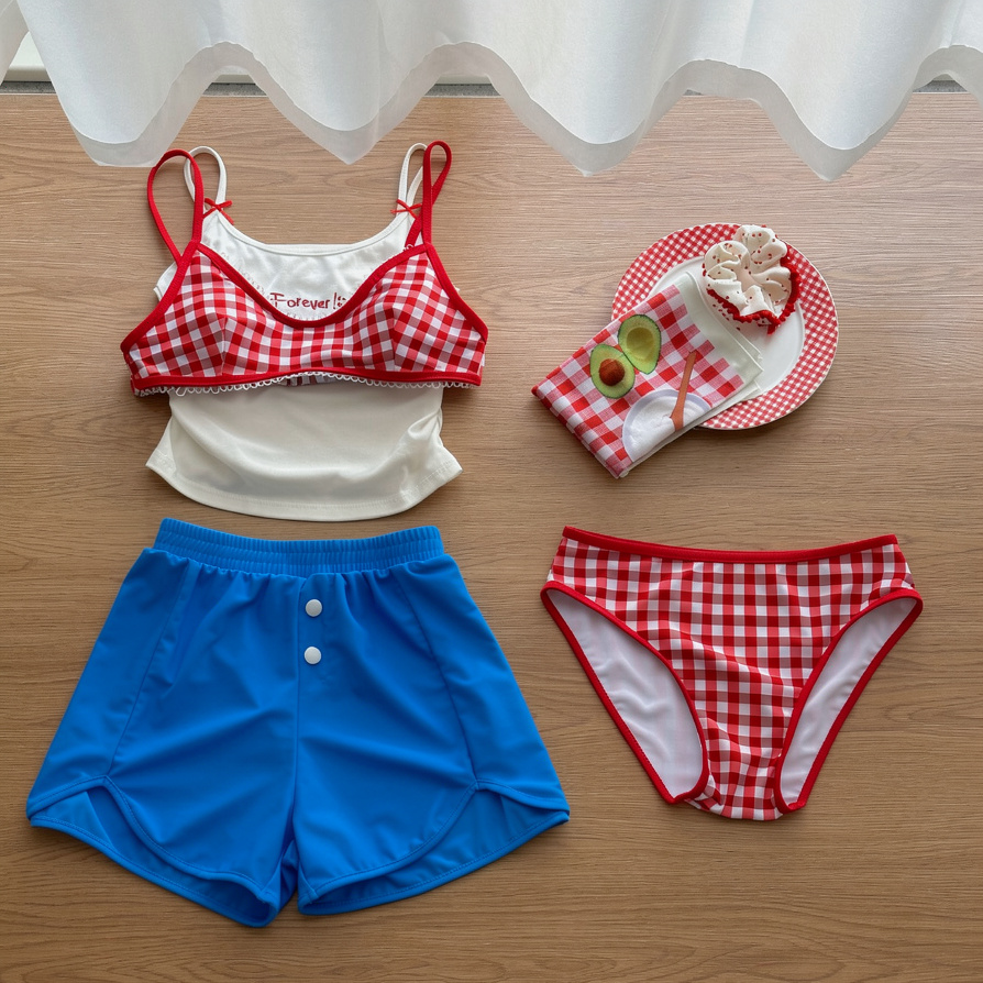 紅格比基尼+吊帶+藍色平角褲
