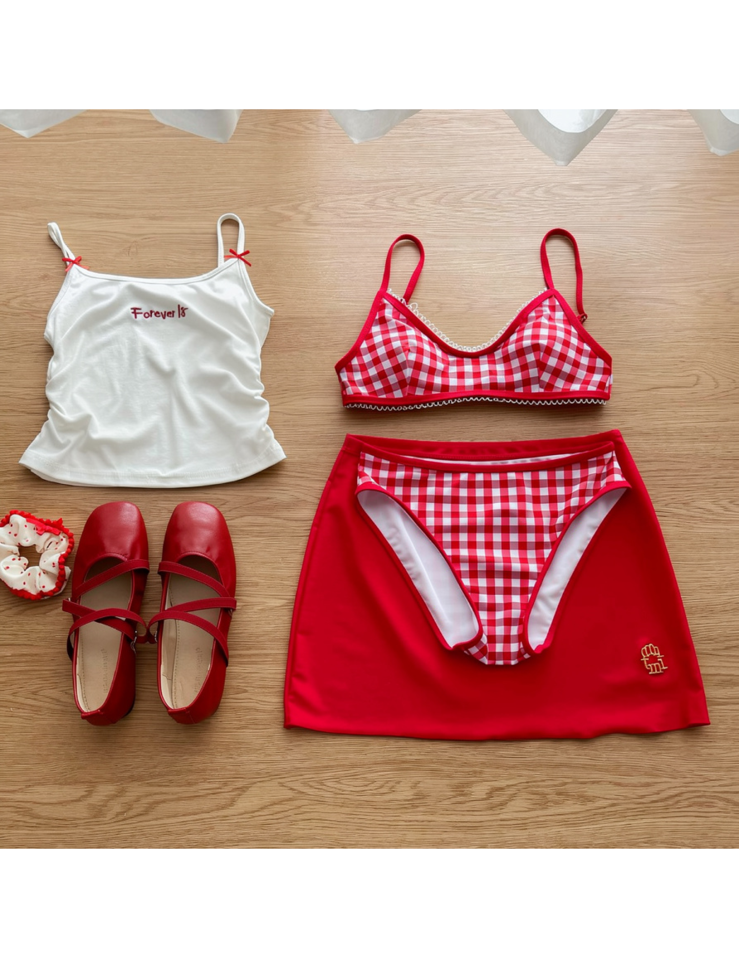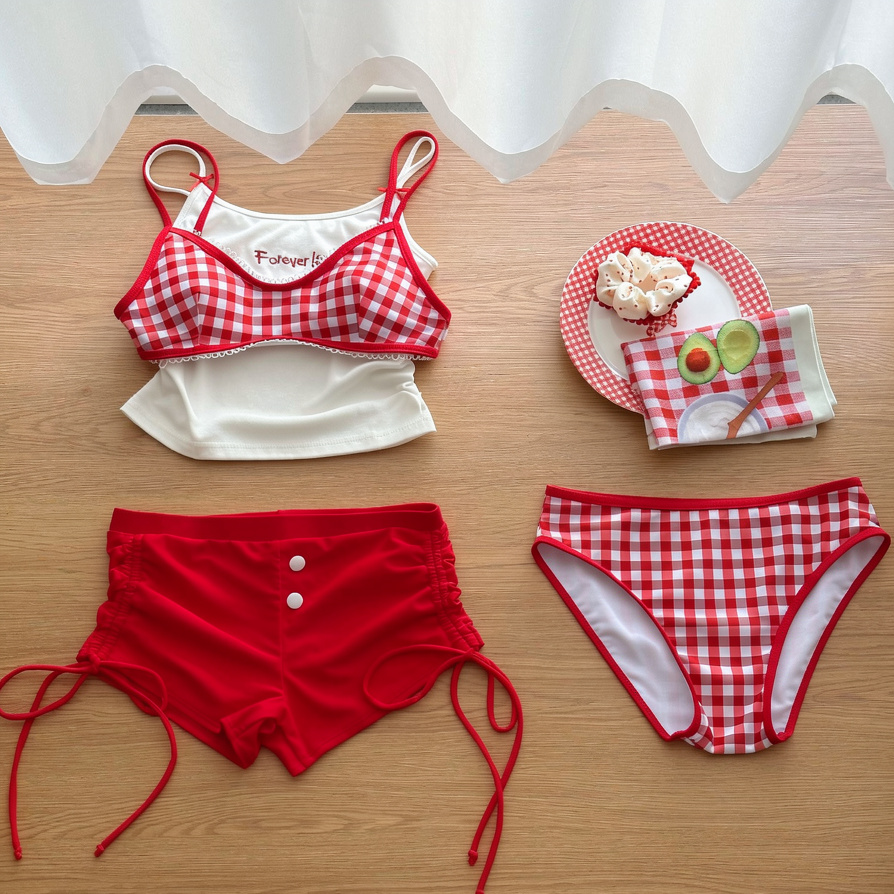 紅格比基尼+吊帶+紅色平角褲