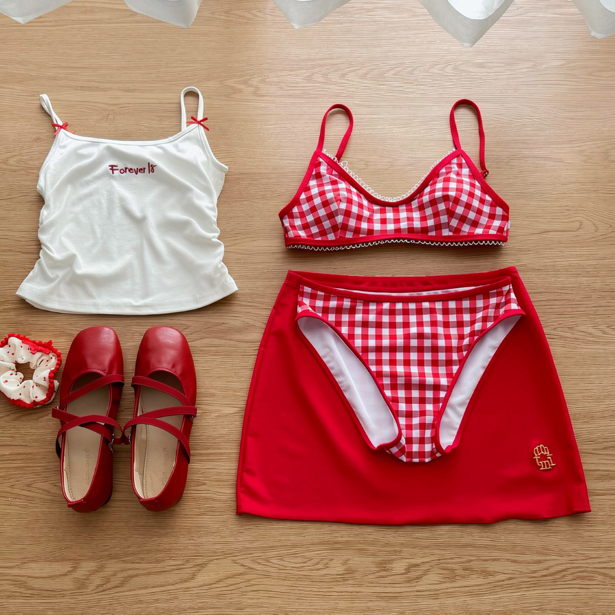 紅格比基尼+吊帶+刺銹紅裙