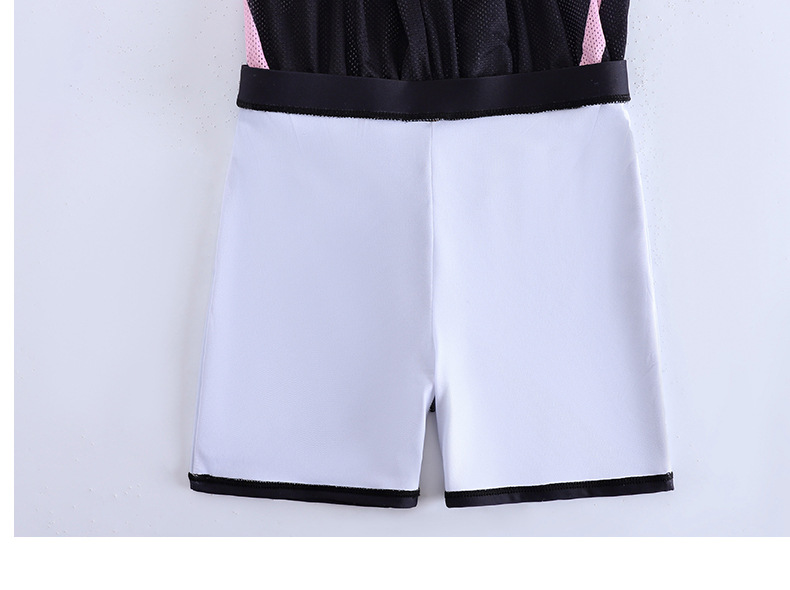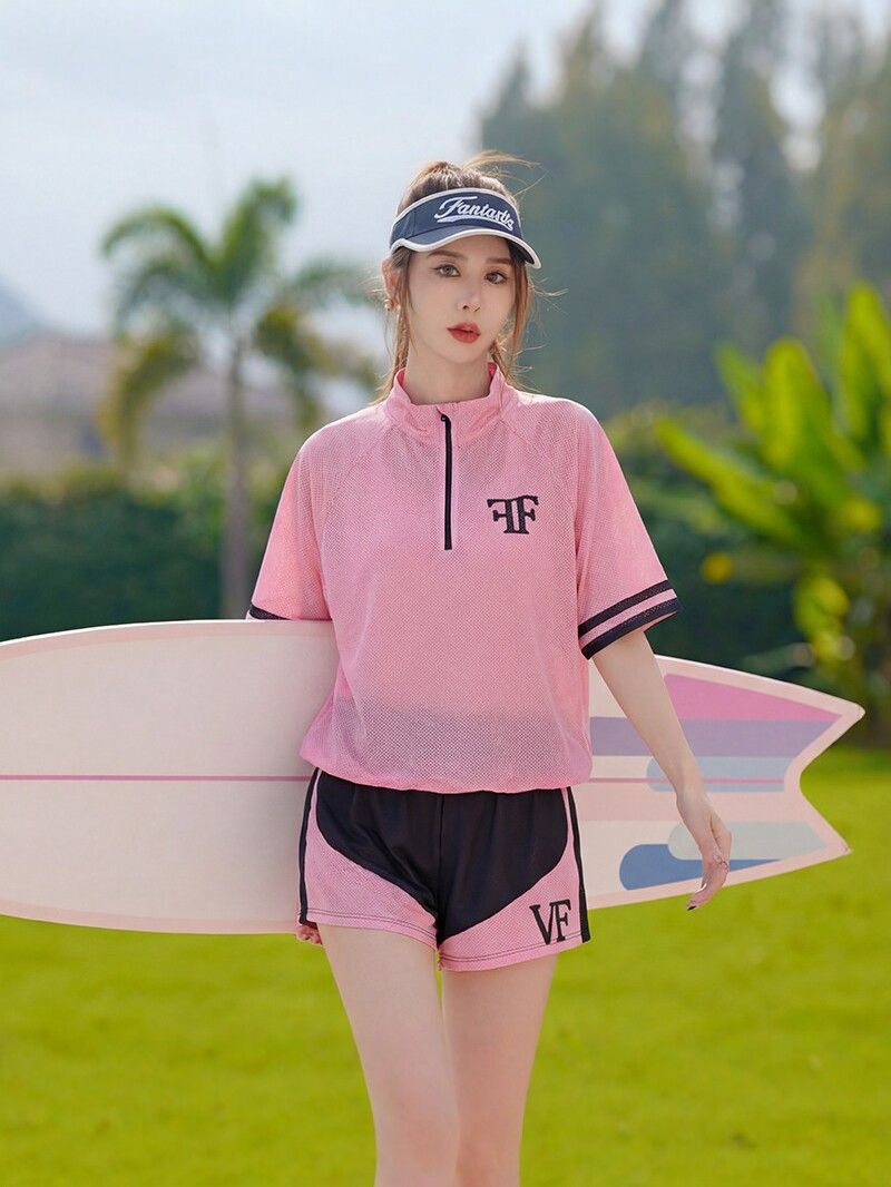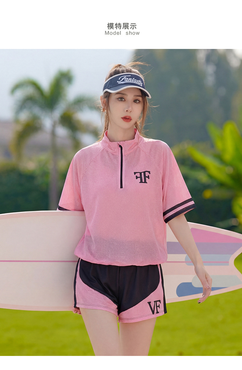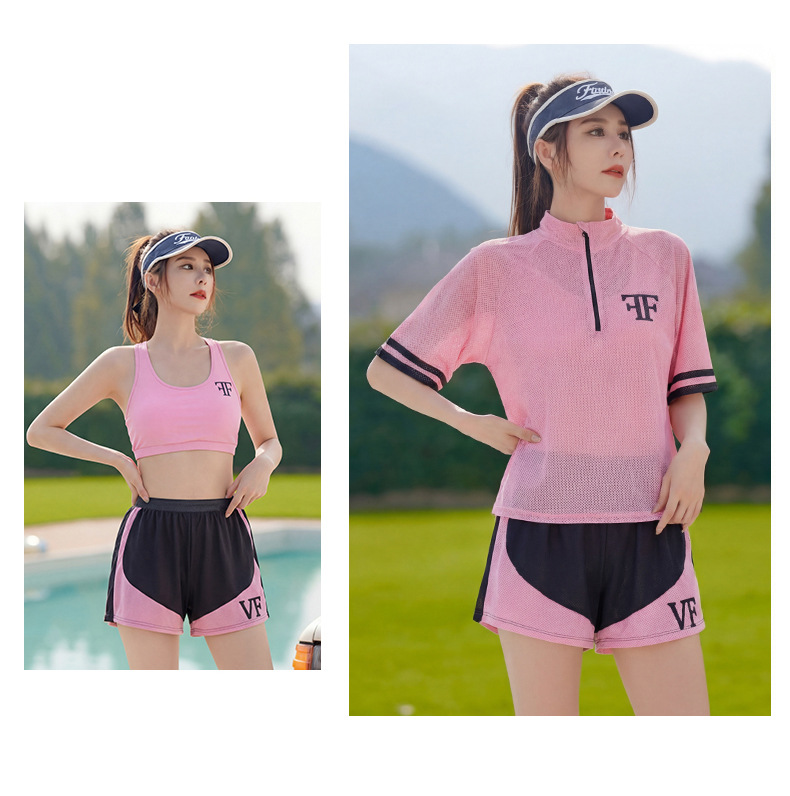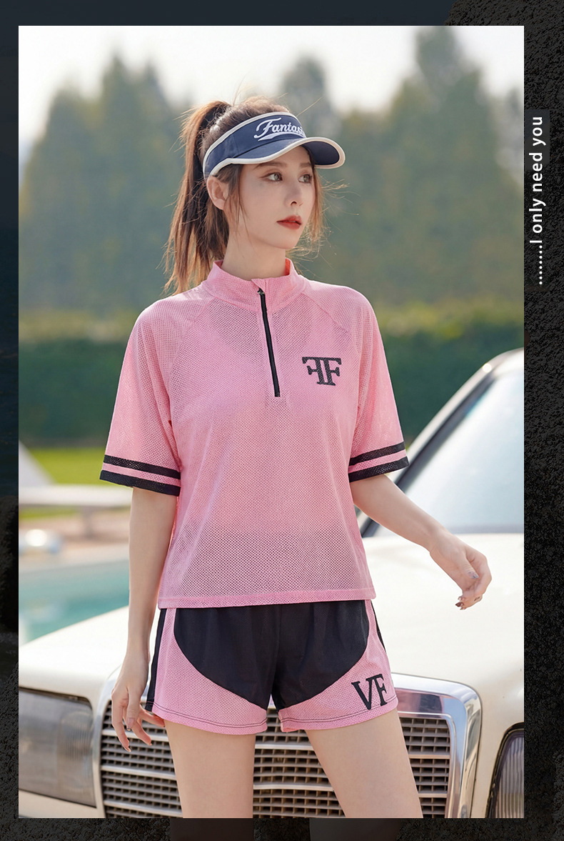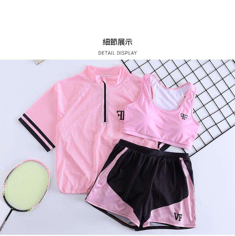大碼粉色運動風分體泳衣,三件套包含短袖上衣、短褲與內襯。