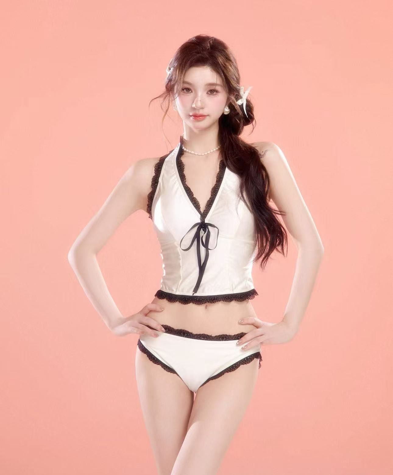 新款純欲風辣妹性感抹胸比基尼,蝴蝶結三件套裙式設計。