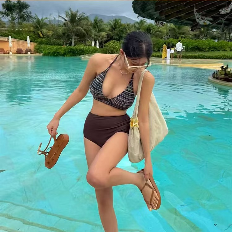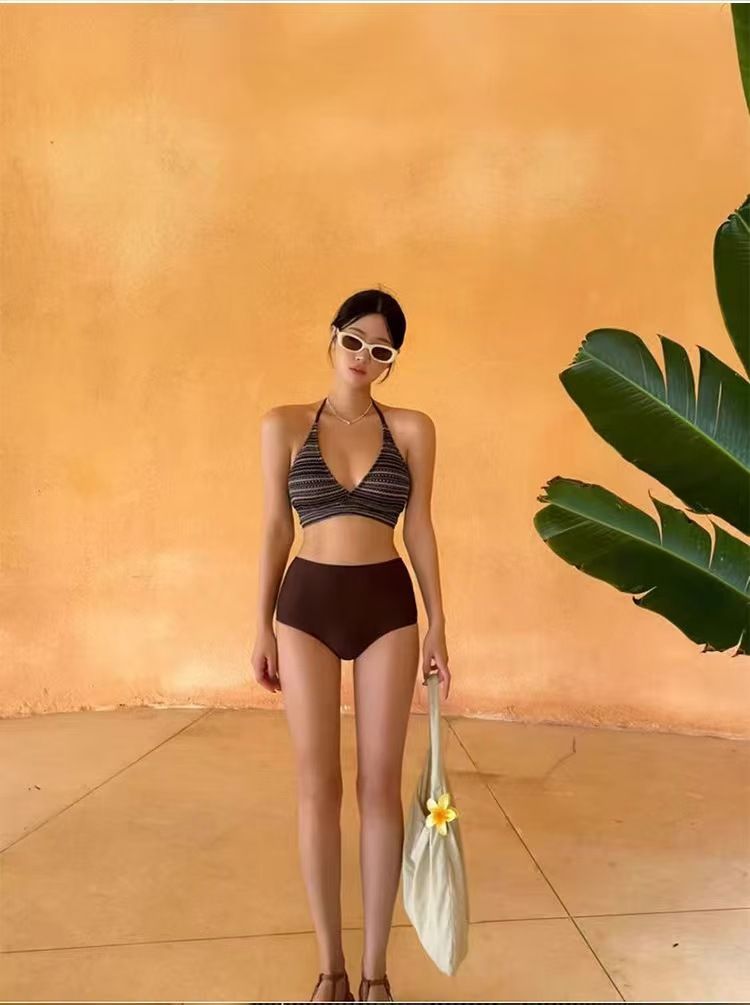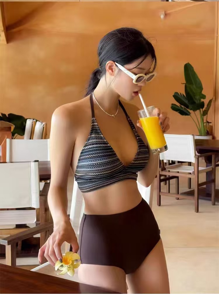 韓國新款性感條紋高腰復古比基尼,大胸高級感必備。