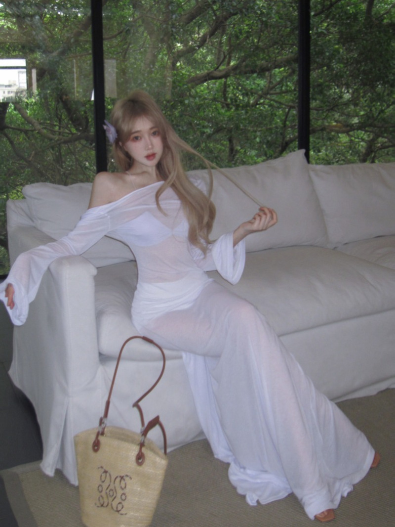 比基尼搭配長袖露背透視罩衫裙,性感又防曬。