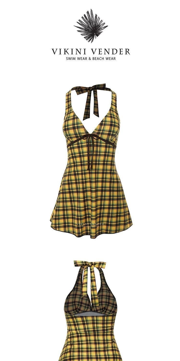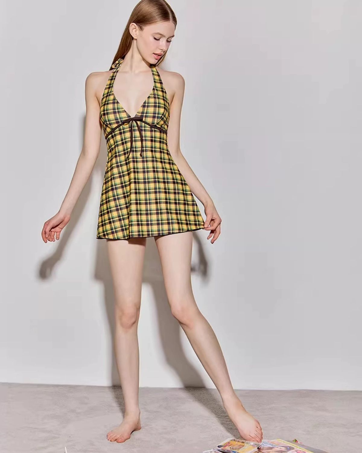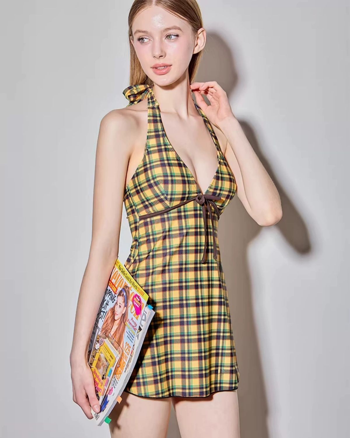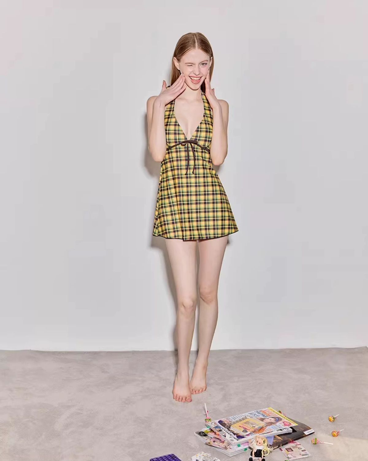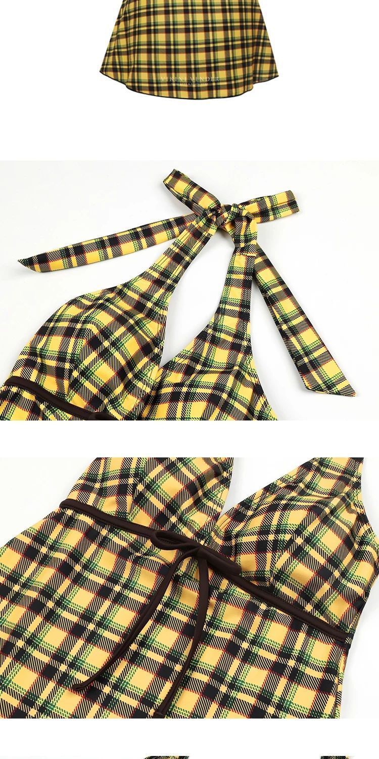 HSPN649100002 復古黃格ins黃色甜酷辣妹V領格子度假泳衣海島拍照