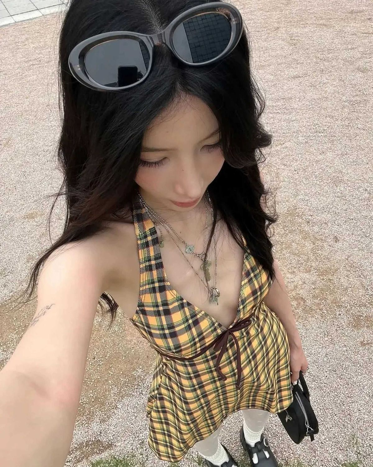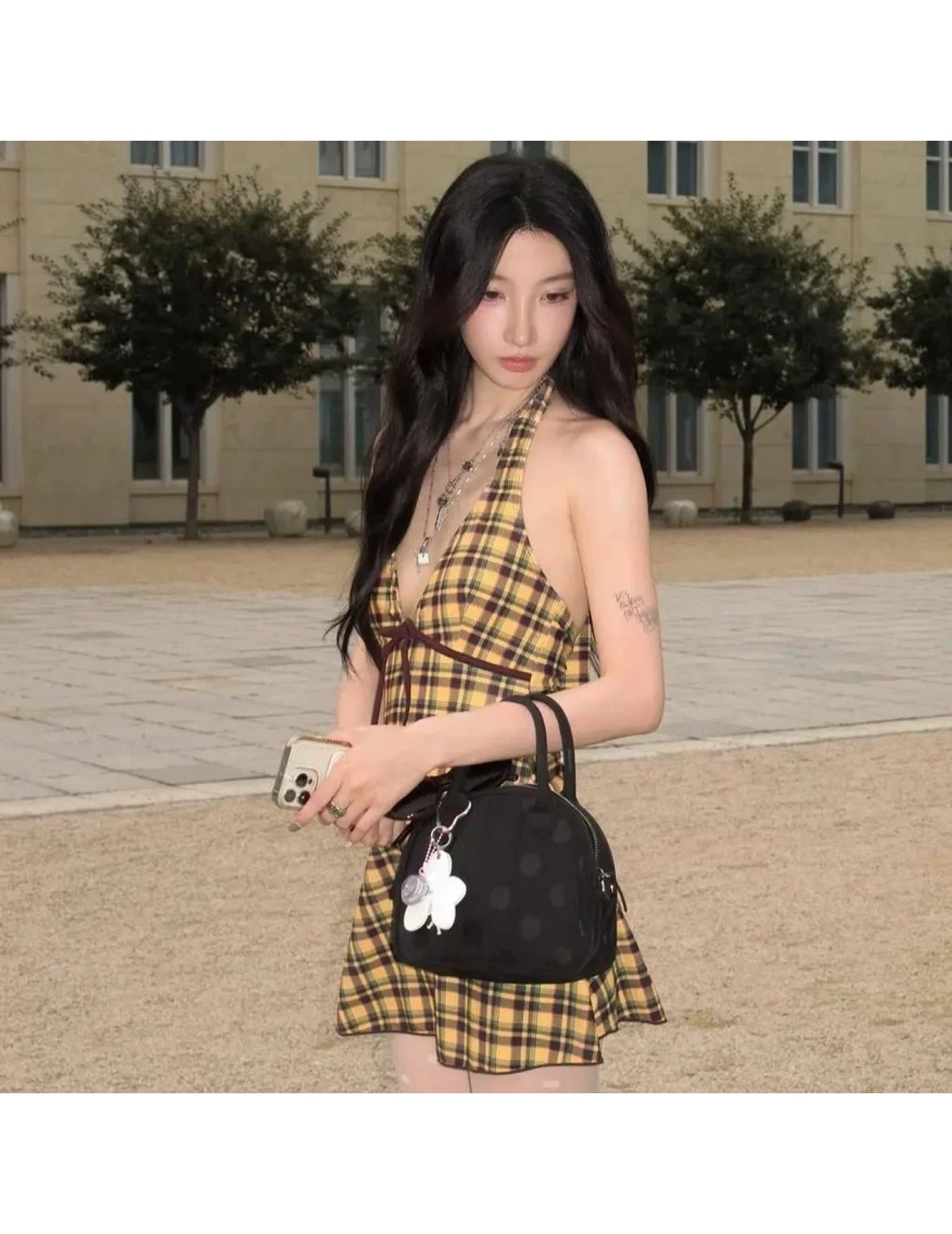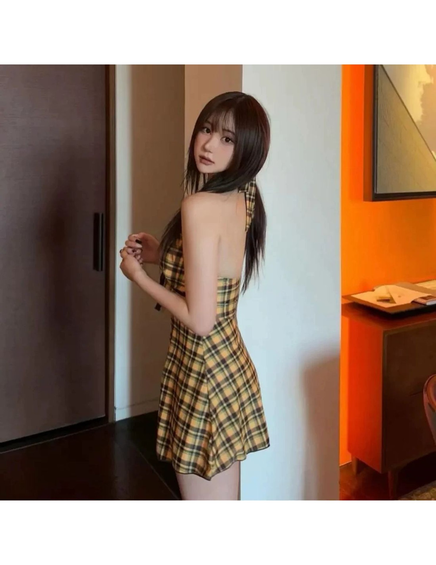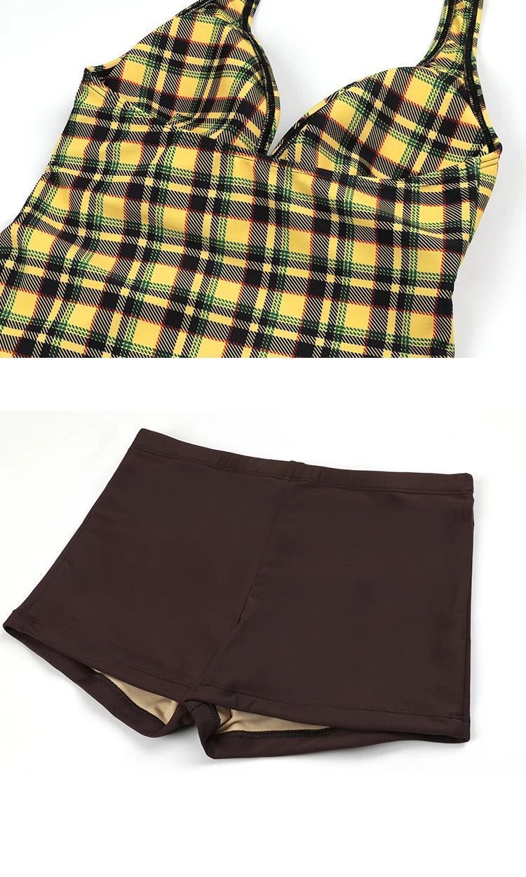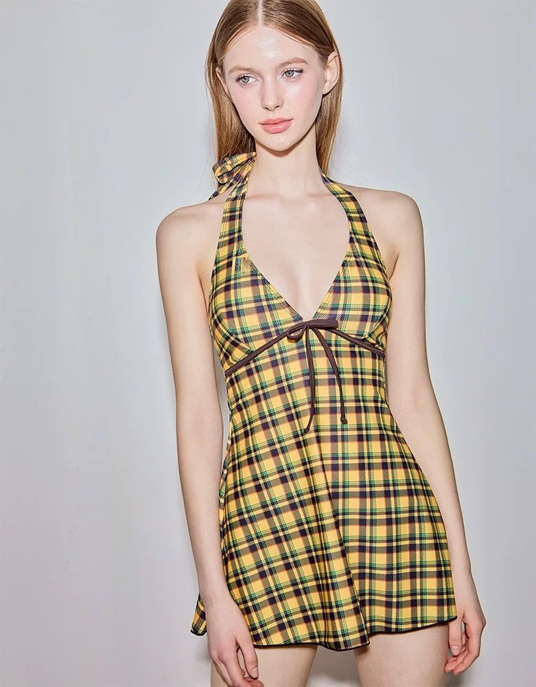 HSPN649100002 復古黃格ins黃色甜酷辣妹V領格子度假泳衣海島拍照