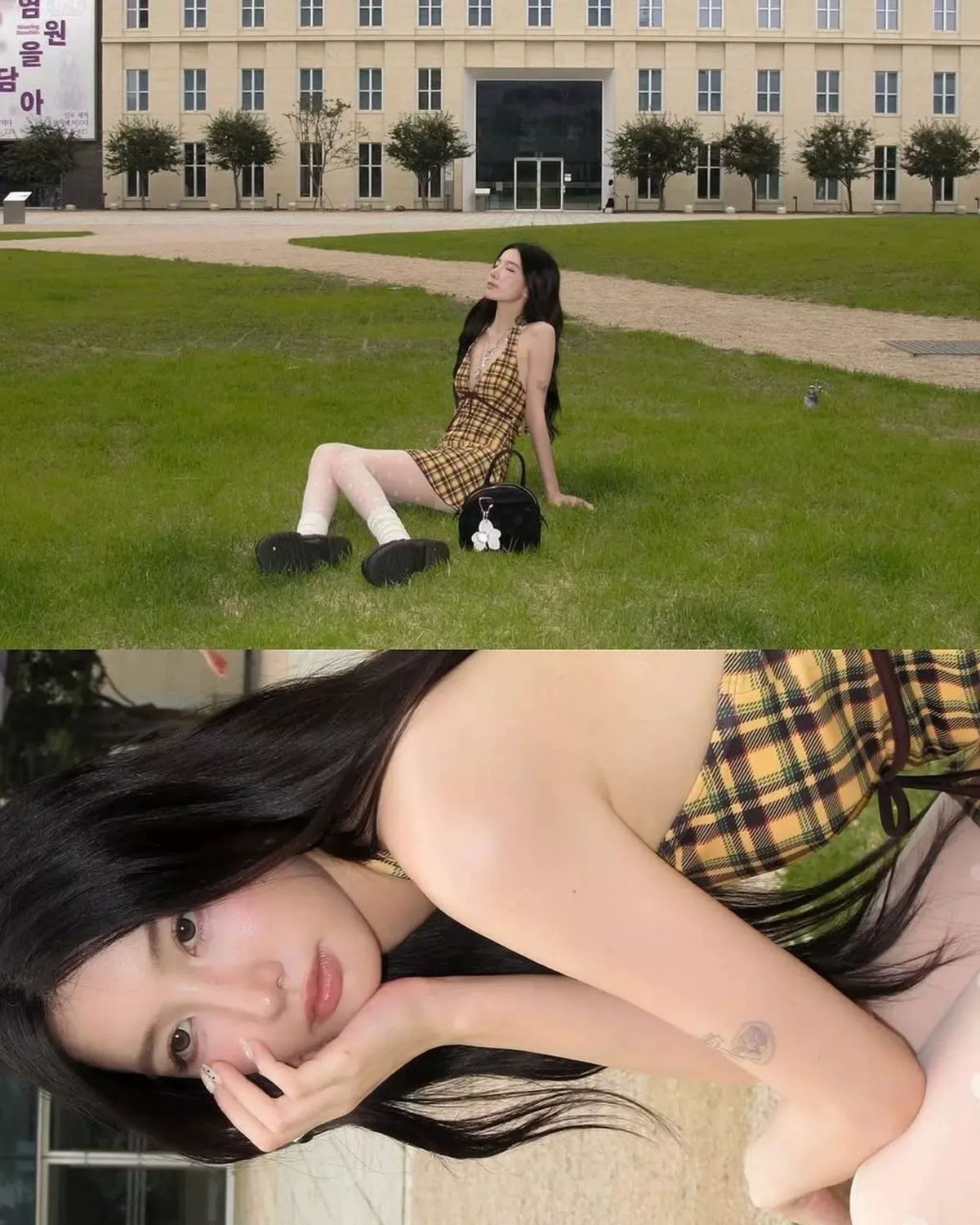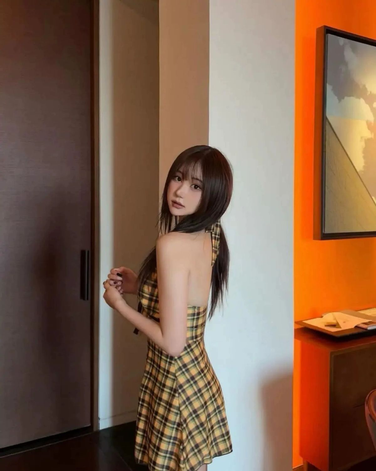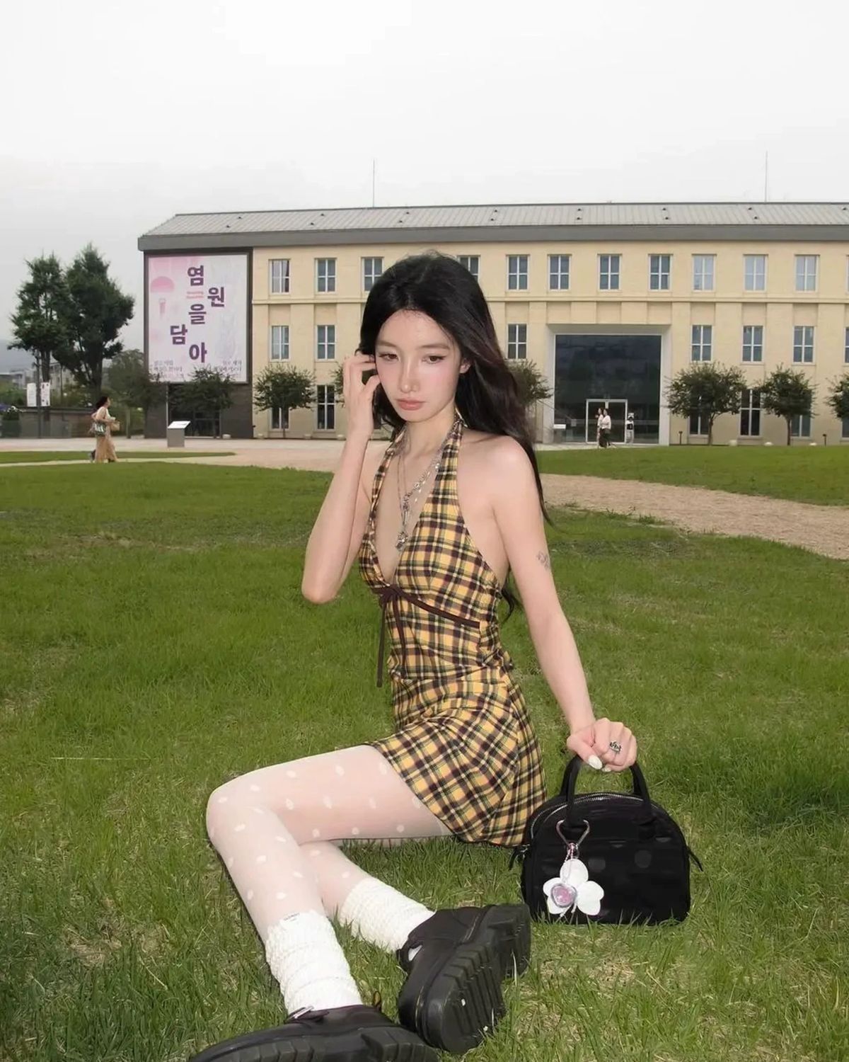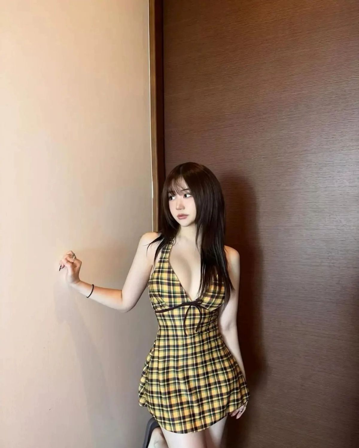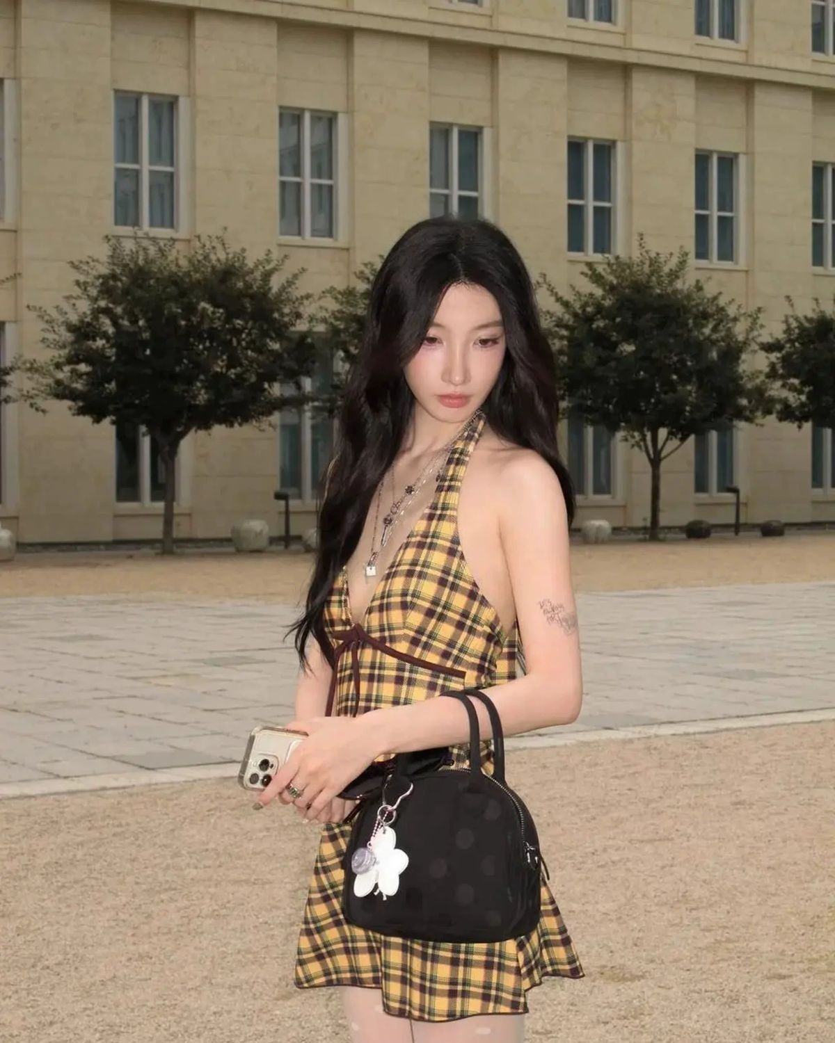 HSPN649100002 復古黃格ins黃色甜酷辣妹V領格子度假泳衣海島拍照