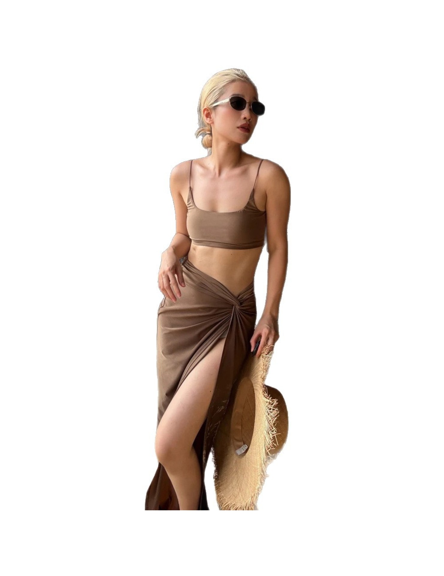 New Korean-style solid color simple two-piece swimsuit 3-piece set – long dress vacation style, premium bikini.