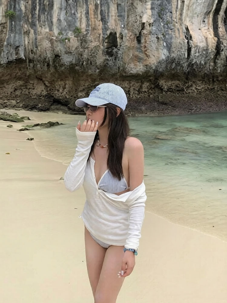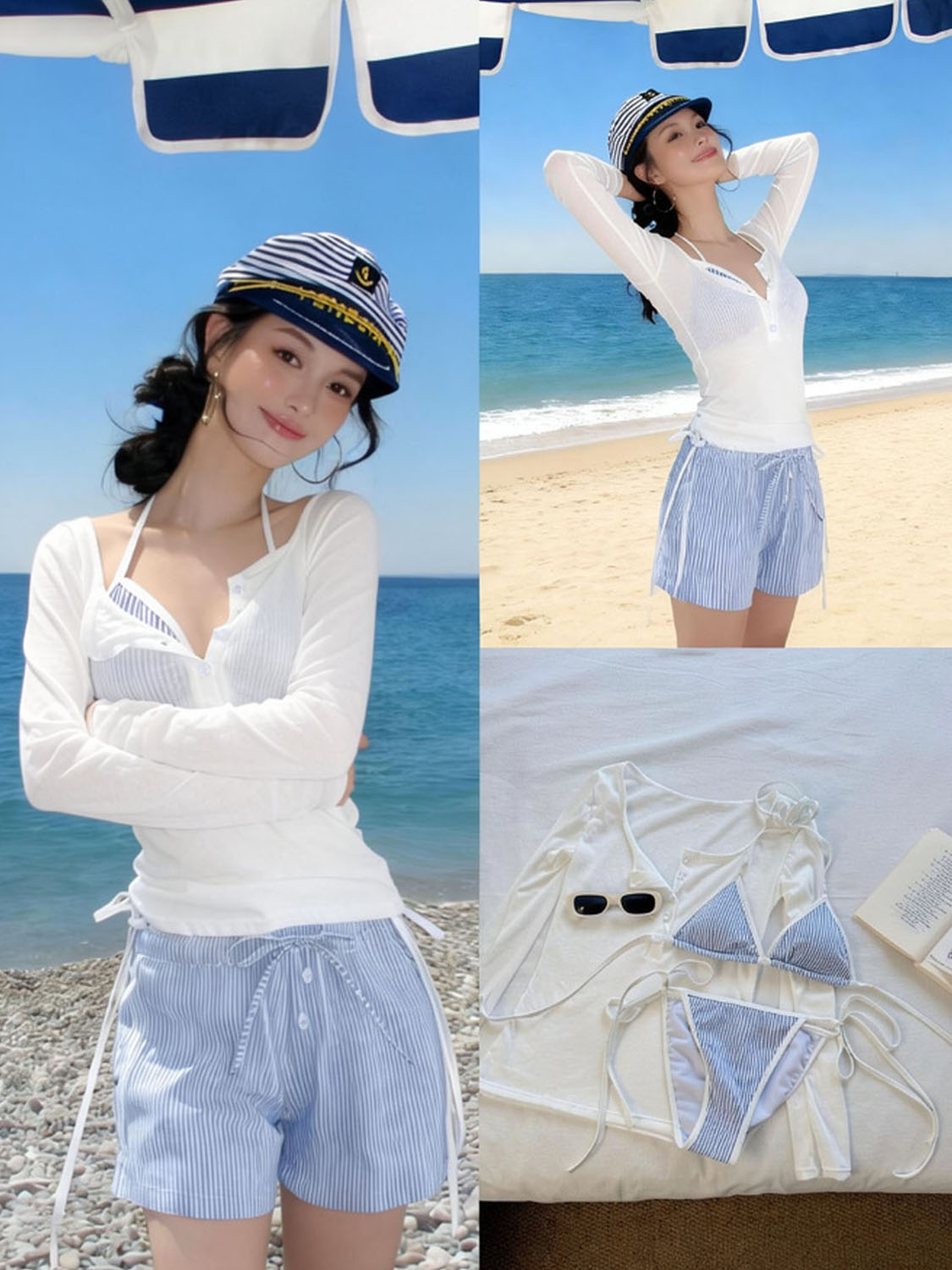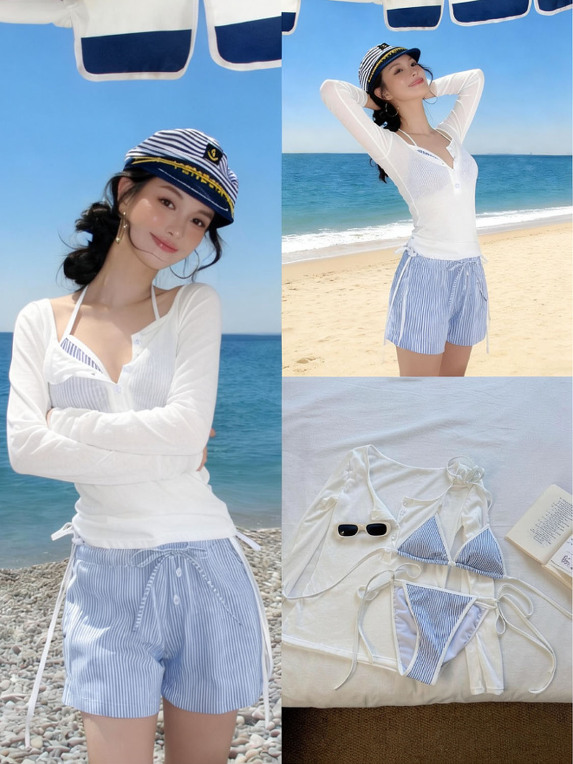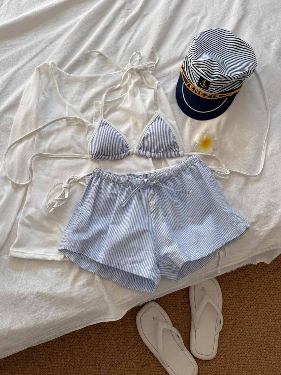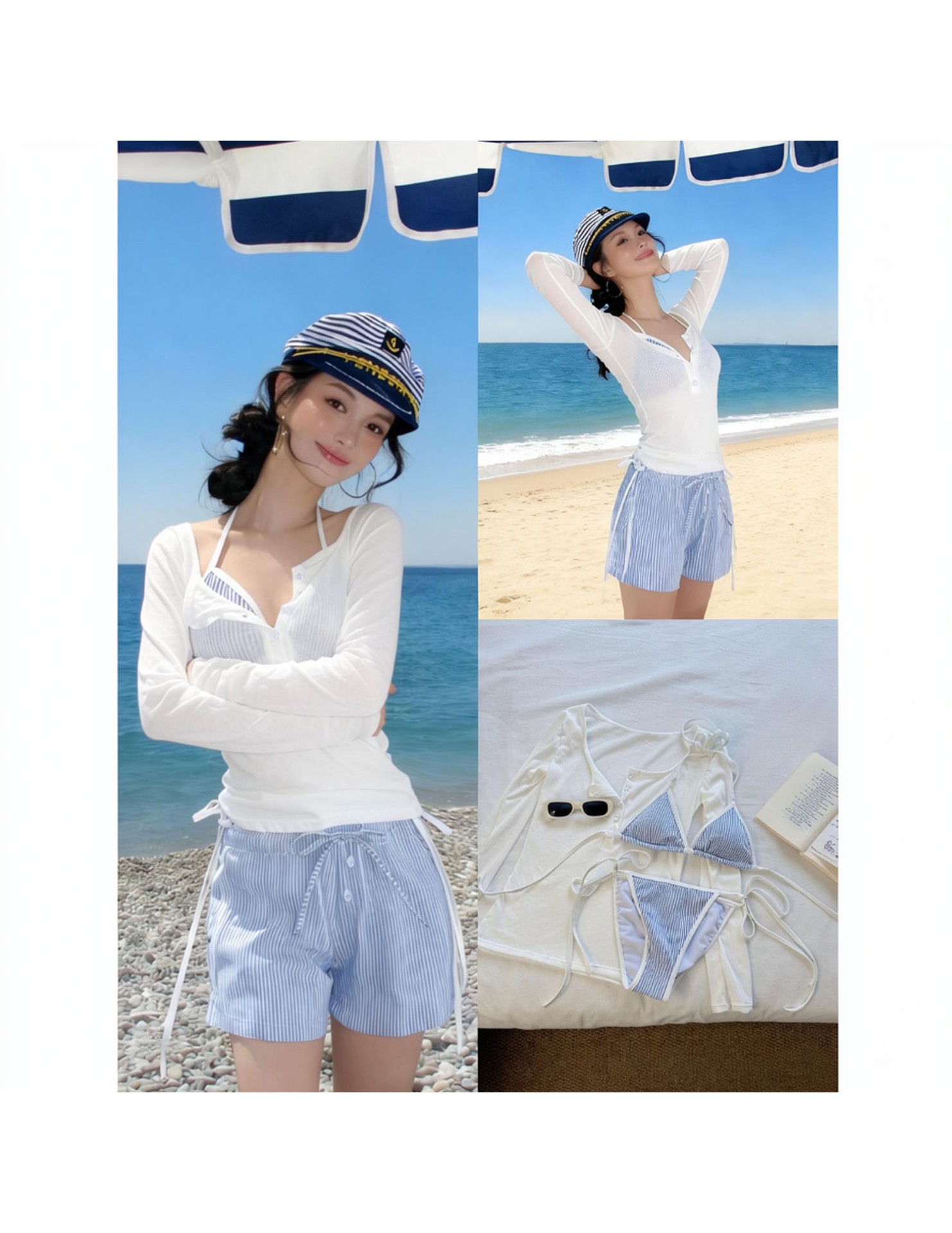 Striped bikini + cover/up + blue beach shorts Beige three/piece suit
