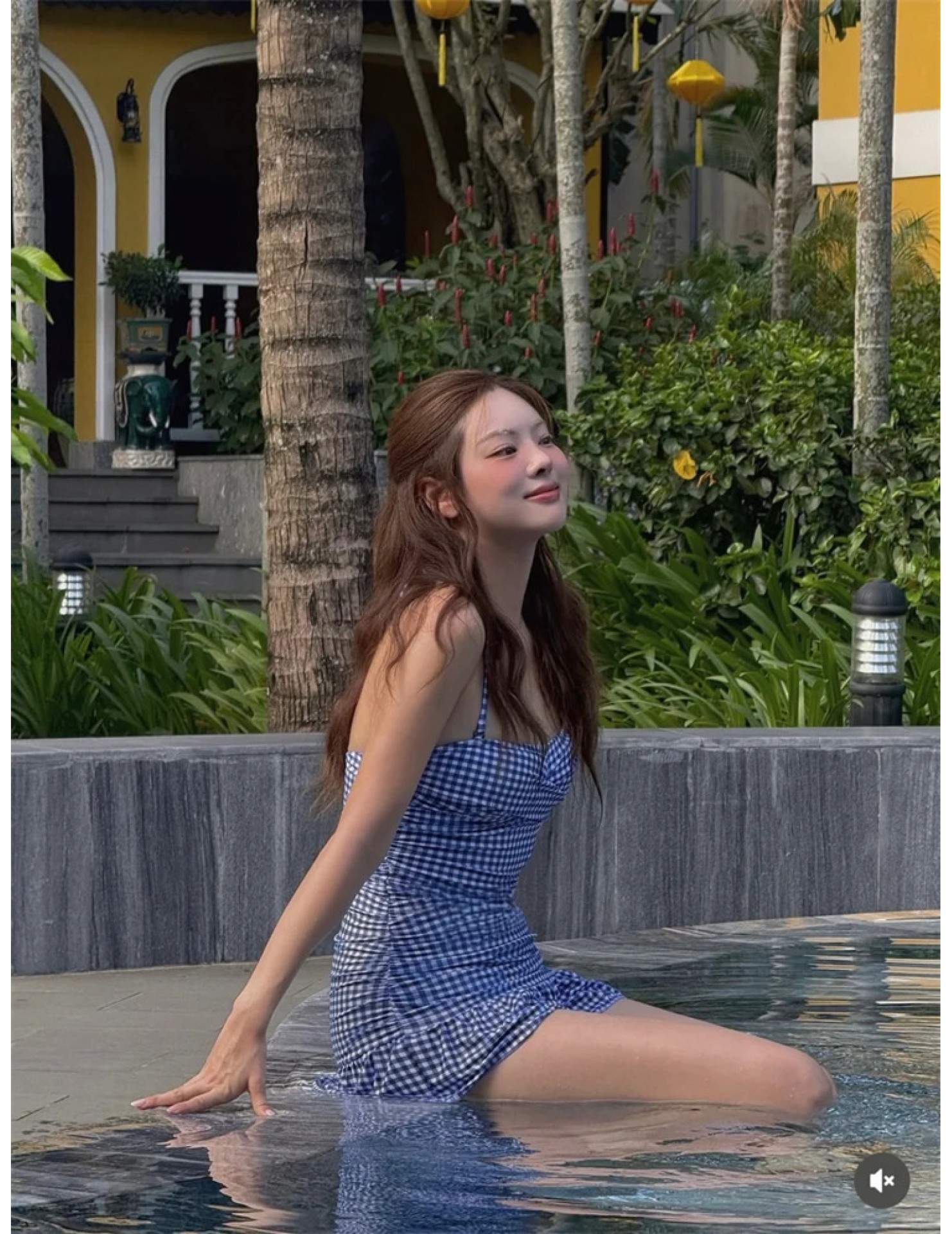藍色格紋可愛顯白,遮肚保守顯瘦設計。
