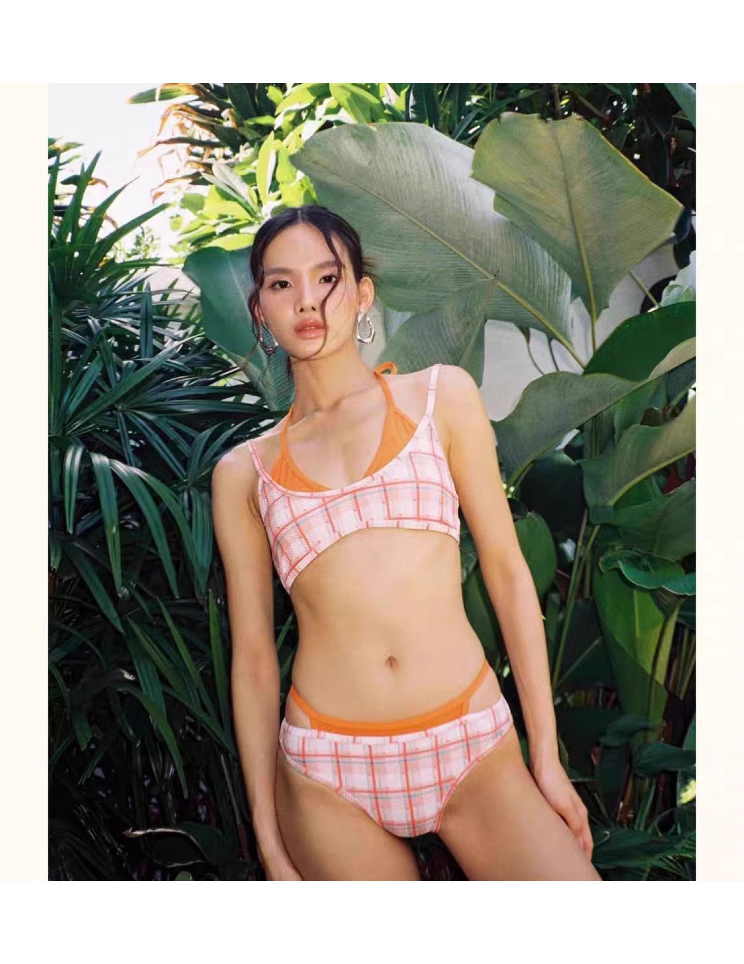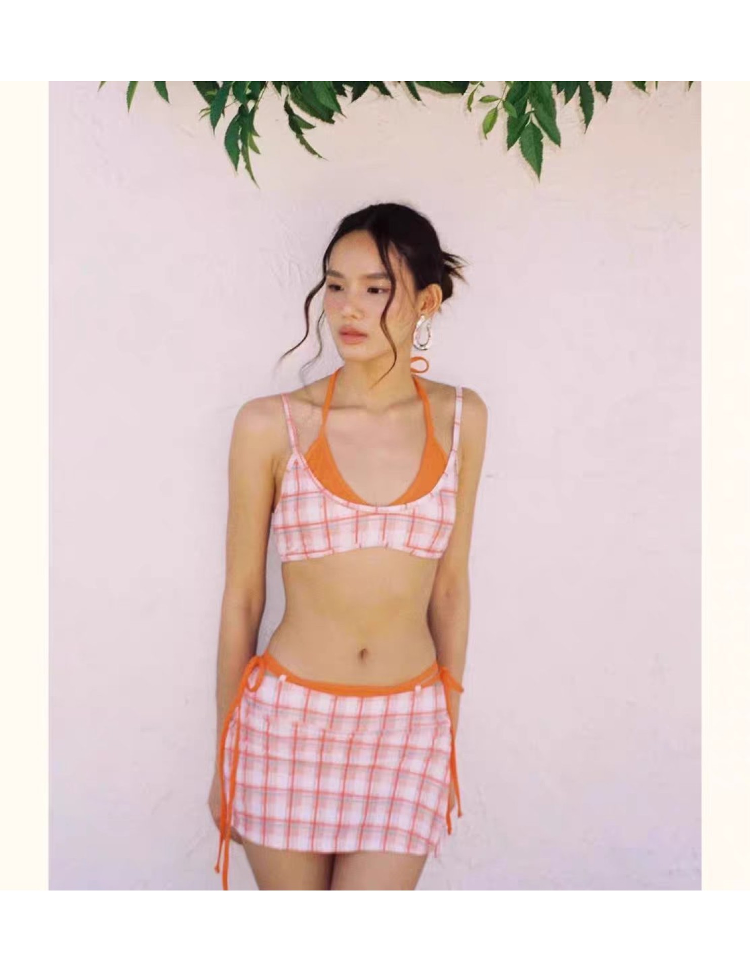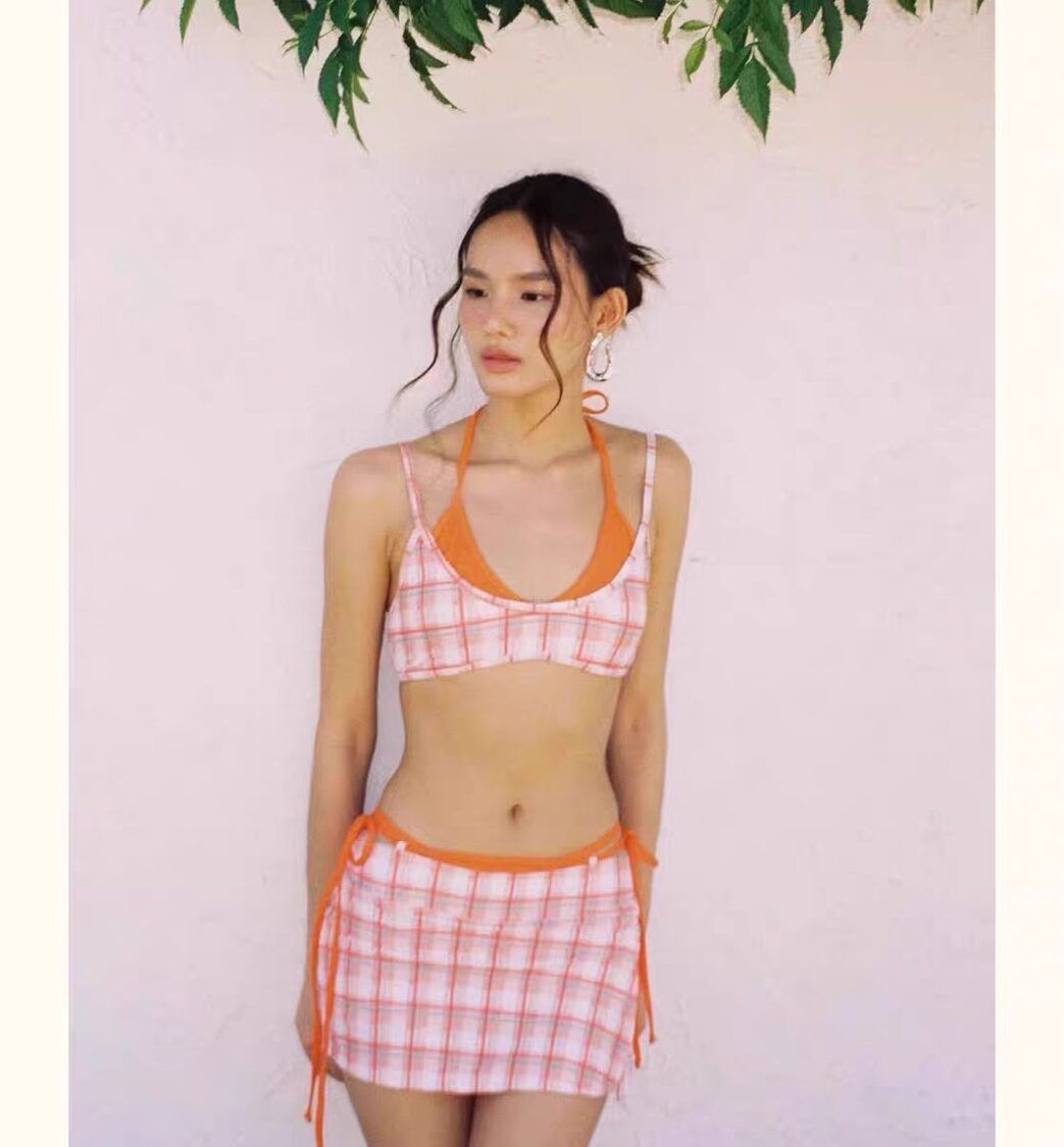 上新辣妹撞色格子拼接比基尼三件套,芭比粉配橘色熱辣吸睛。